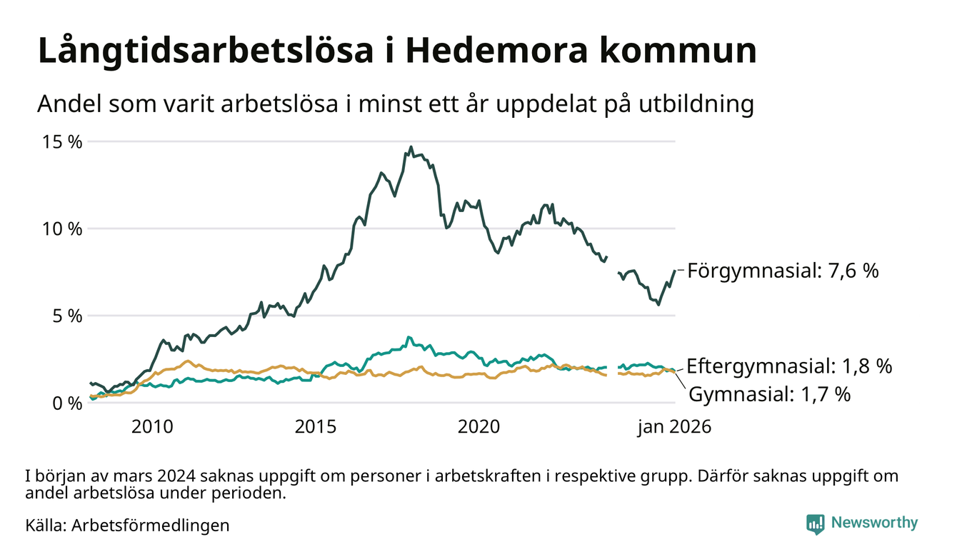 | Andel arbetslösa i minst två år | 1,2 % | 1,0 % | 1,6 % |