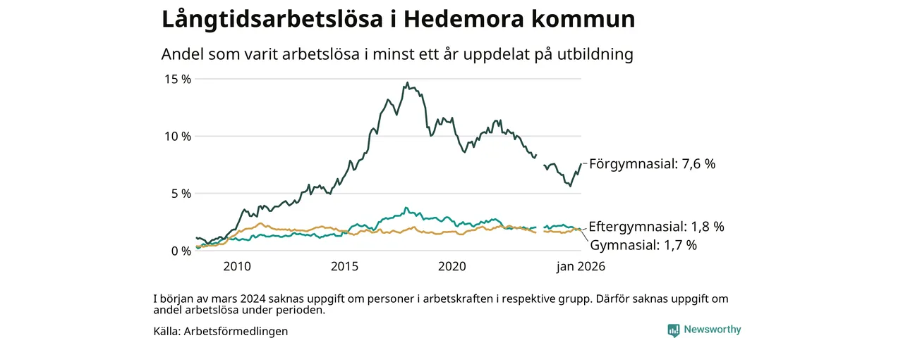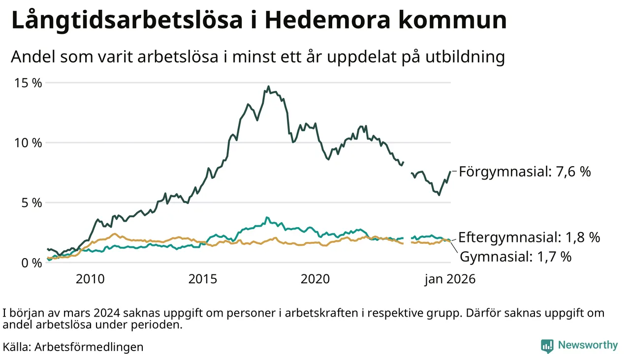 Andelen som varit utan arbete i minst ett år i Hedemora var ungefär lika stor i januari jämfört med samma månad för ett år sedan. Det visar Arbetsfömedlingens senaste månadsstatistik.