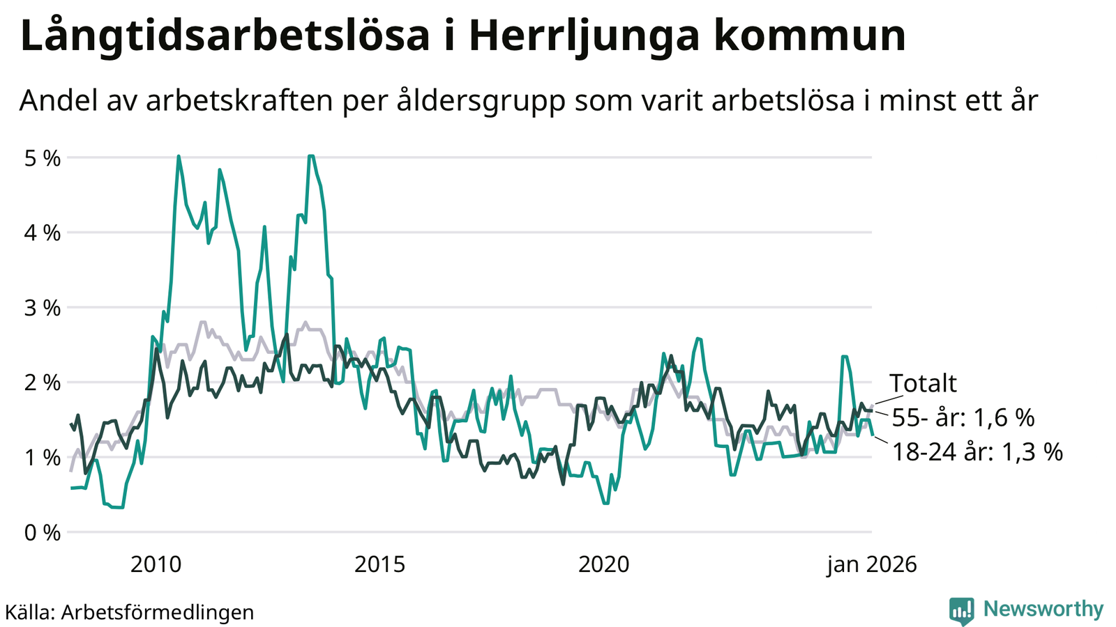 I januari hade 76 Herrljungabor varit arbetslösa i minst ett år, vilket är en fler än månaden innan. Det är den fjärde månaden i rad med ökande antal långtidsarbetslösa. 76 personer motsvarar 1,7 procent av arbetskraften i kommunen – andelen långtidsarbetslösa är 0,4 procentenheter högre än samma månad för ett år sedan.