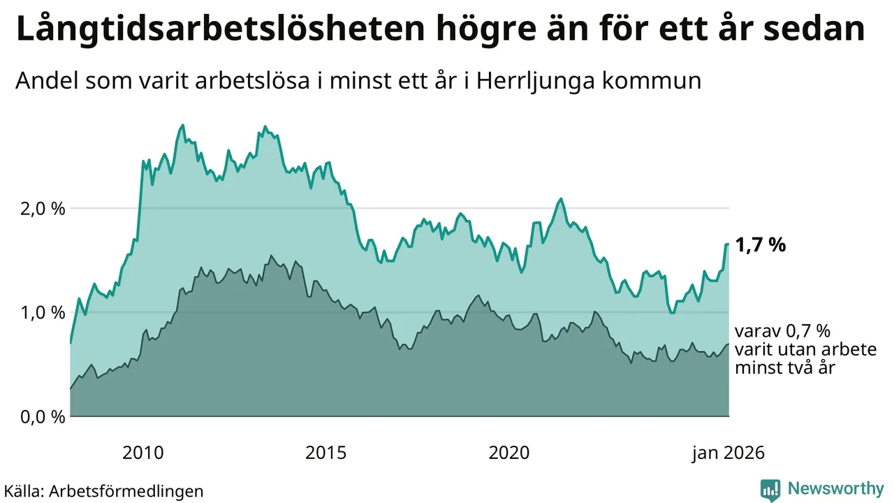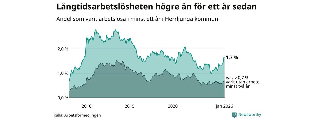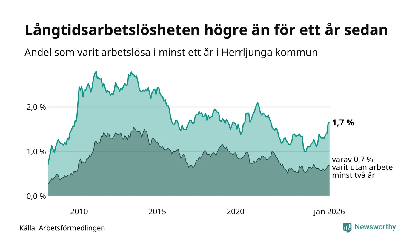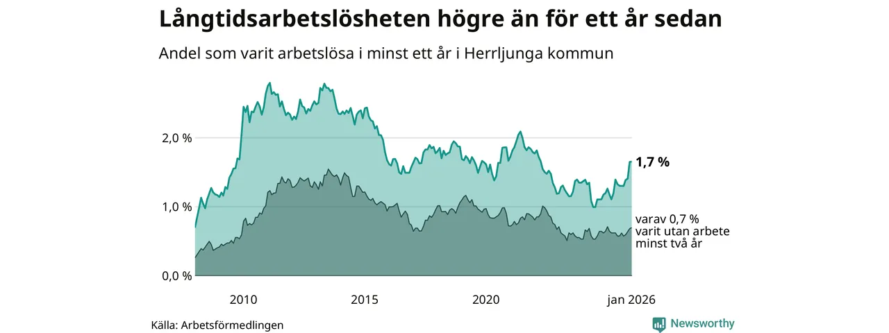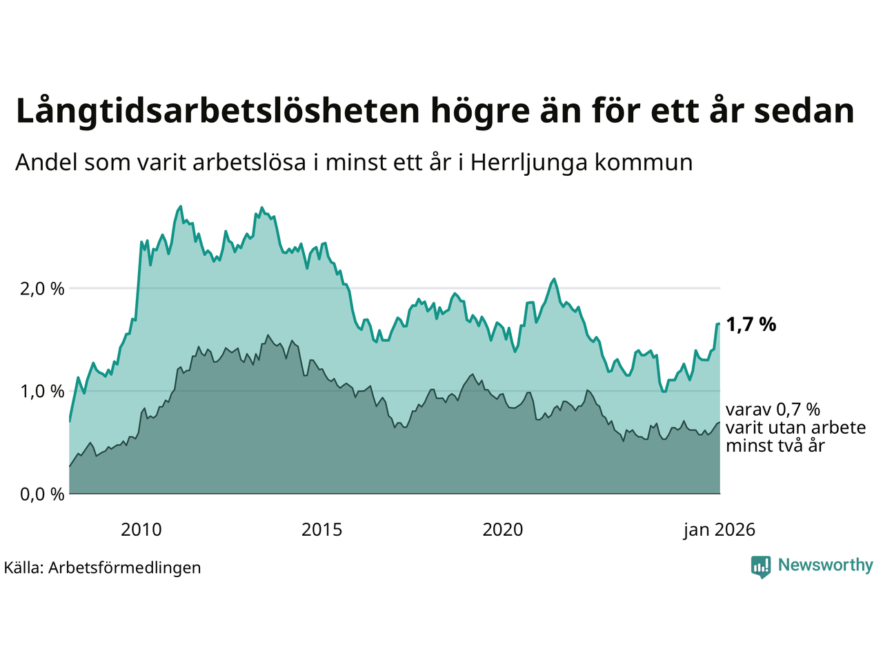 Inte sedan april 2022 har andelen långtidsarbetslösa varit så hög i Herrljunga. Det visar Arbetsförmedlingens senaste månadsstatistik.