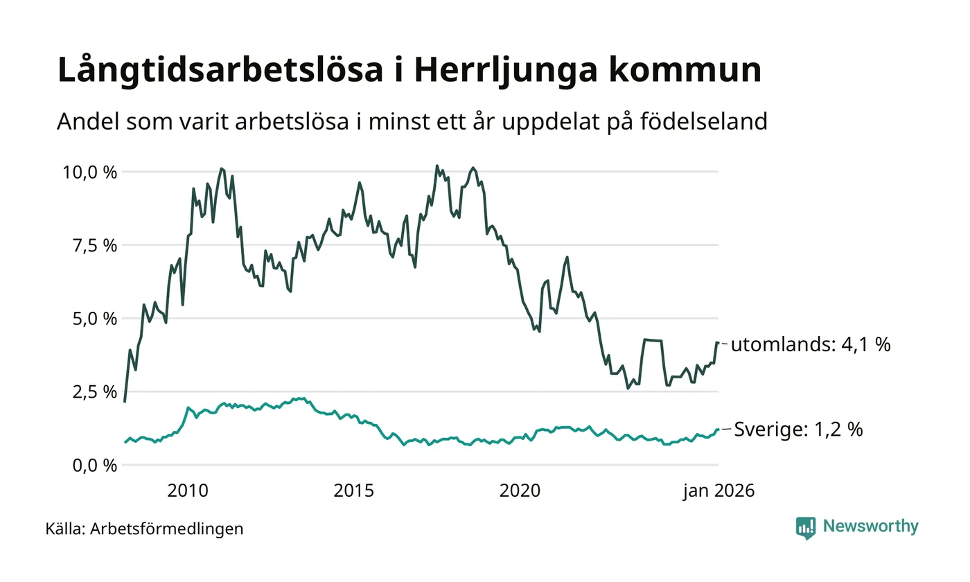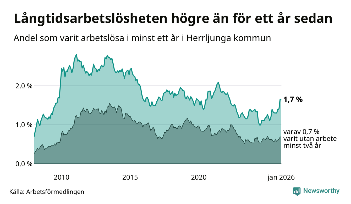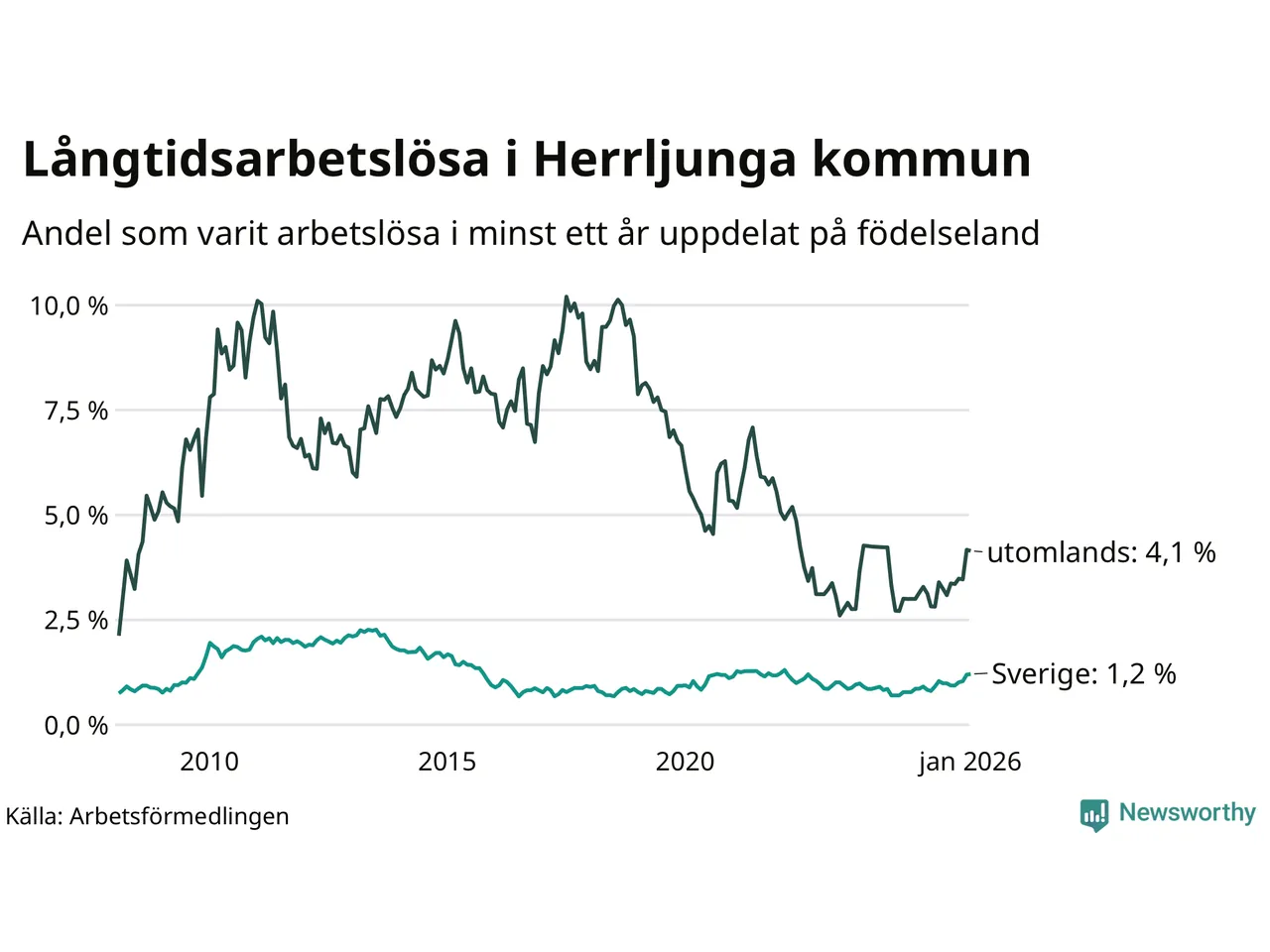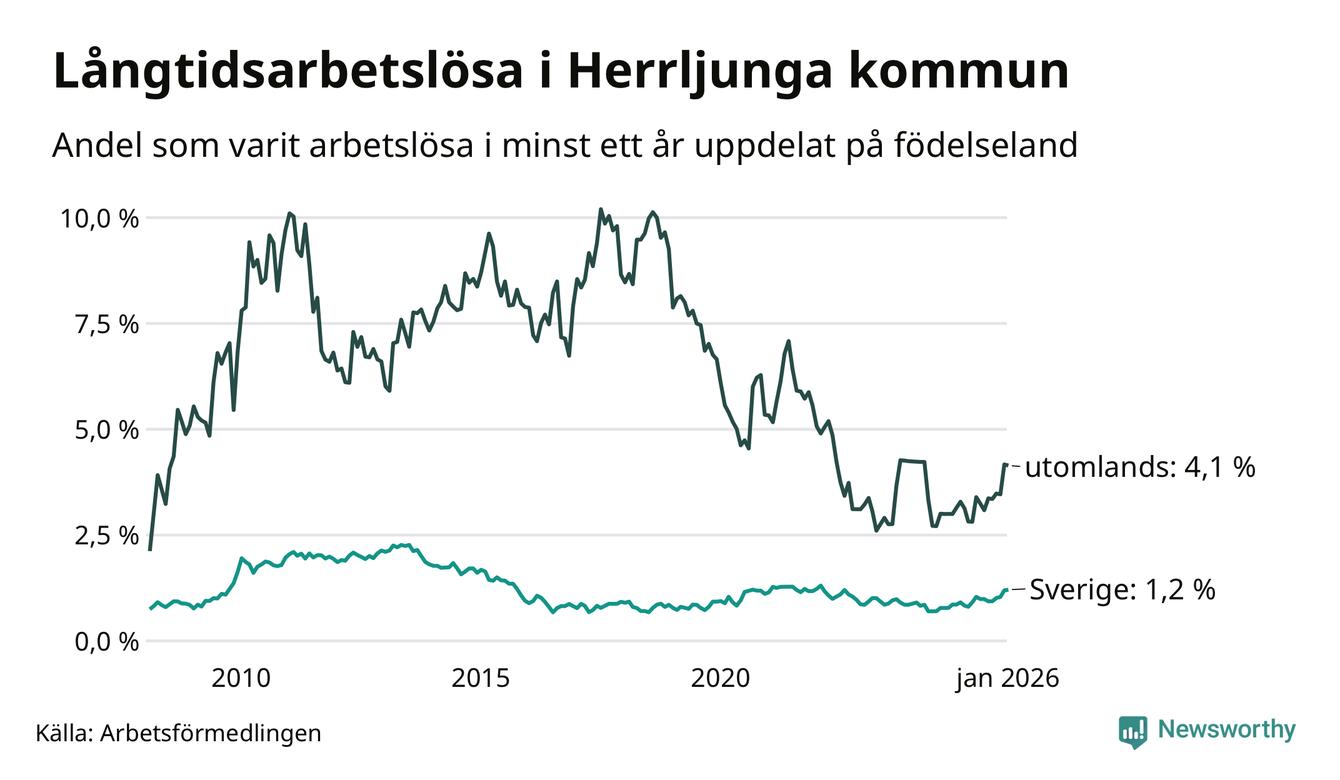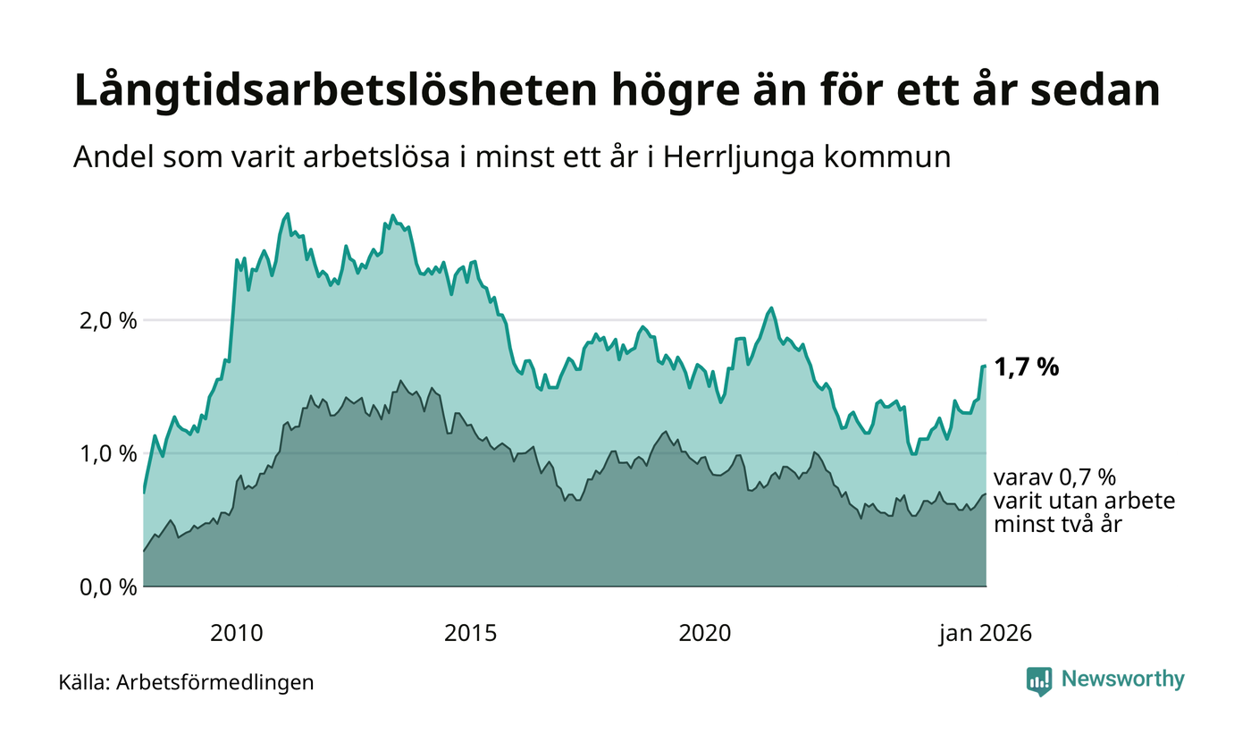 Inte sedan april 2022 har andelen långtidsarbetslösa varit så hög i Herrljunga. Det visar Arbetsförmedlingens senaste månadsstatistik.
