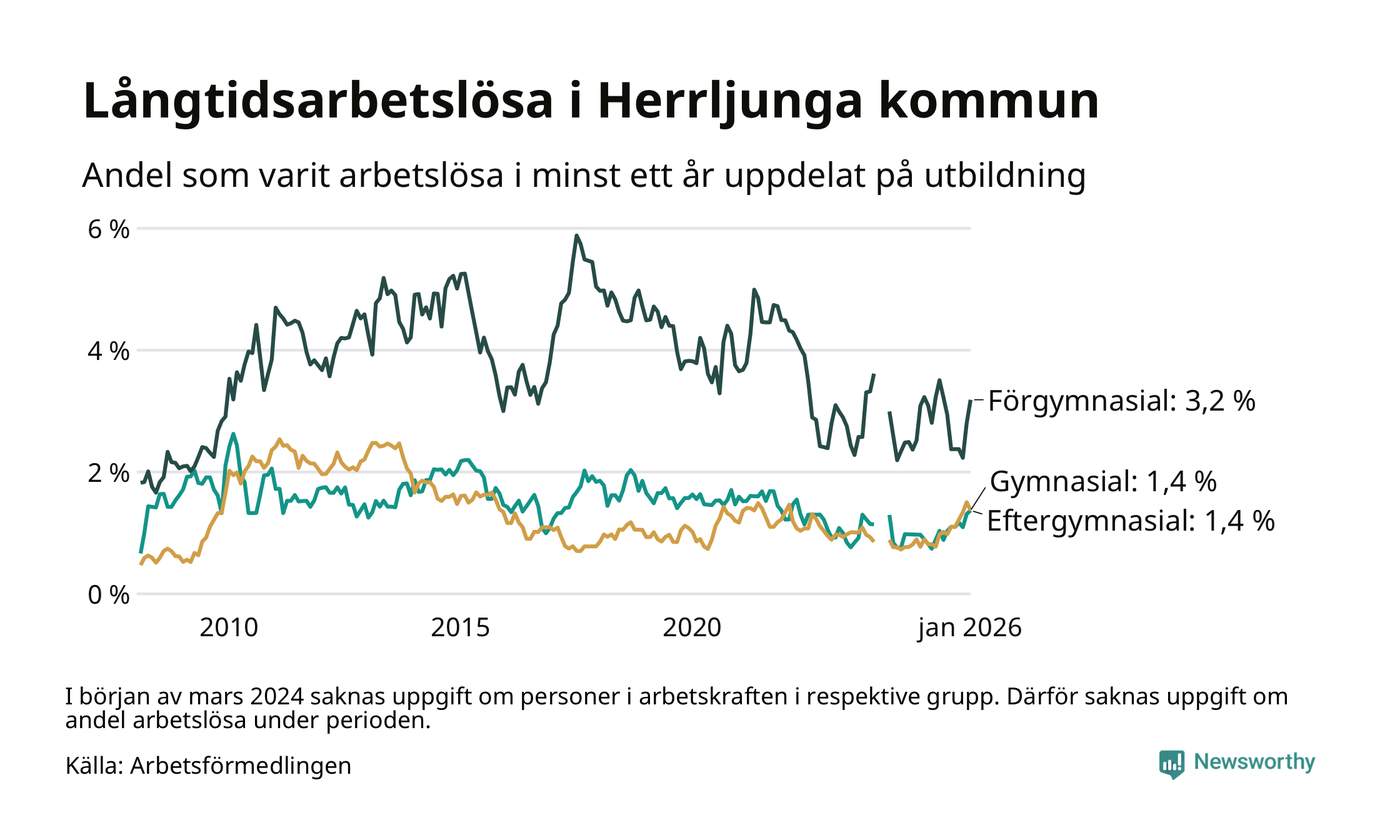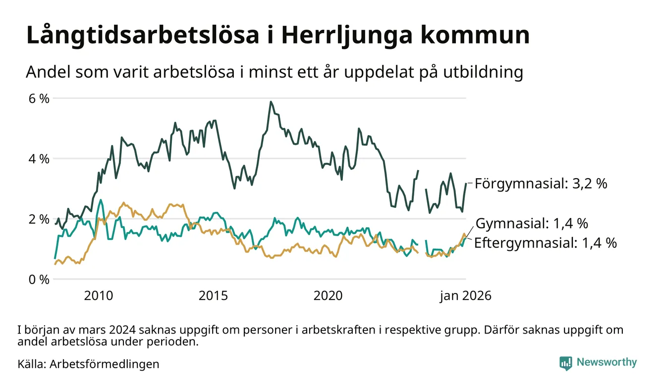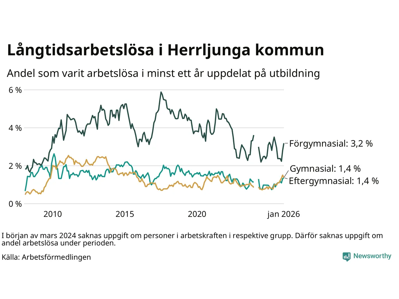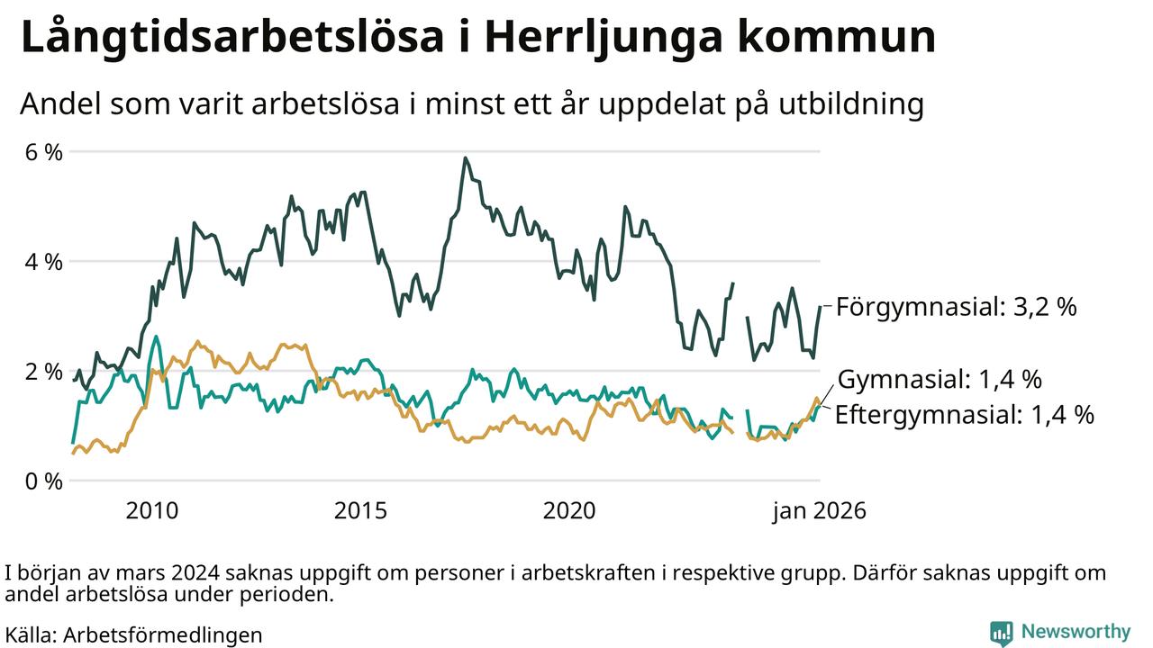 Inte sedan april 2022 har andelen långtidsarbetslösa varit så hög i Herrljunga. Det visar Arbetsförmedlingens senaste månadsstatistik.