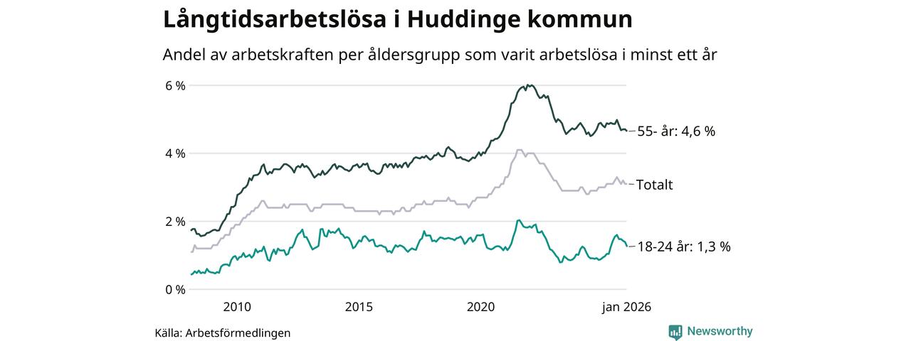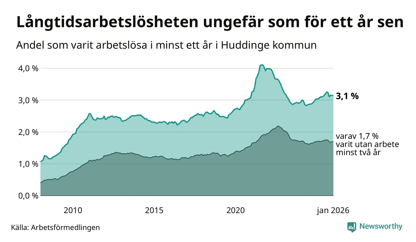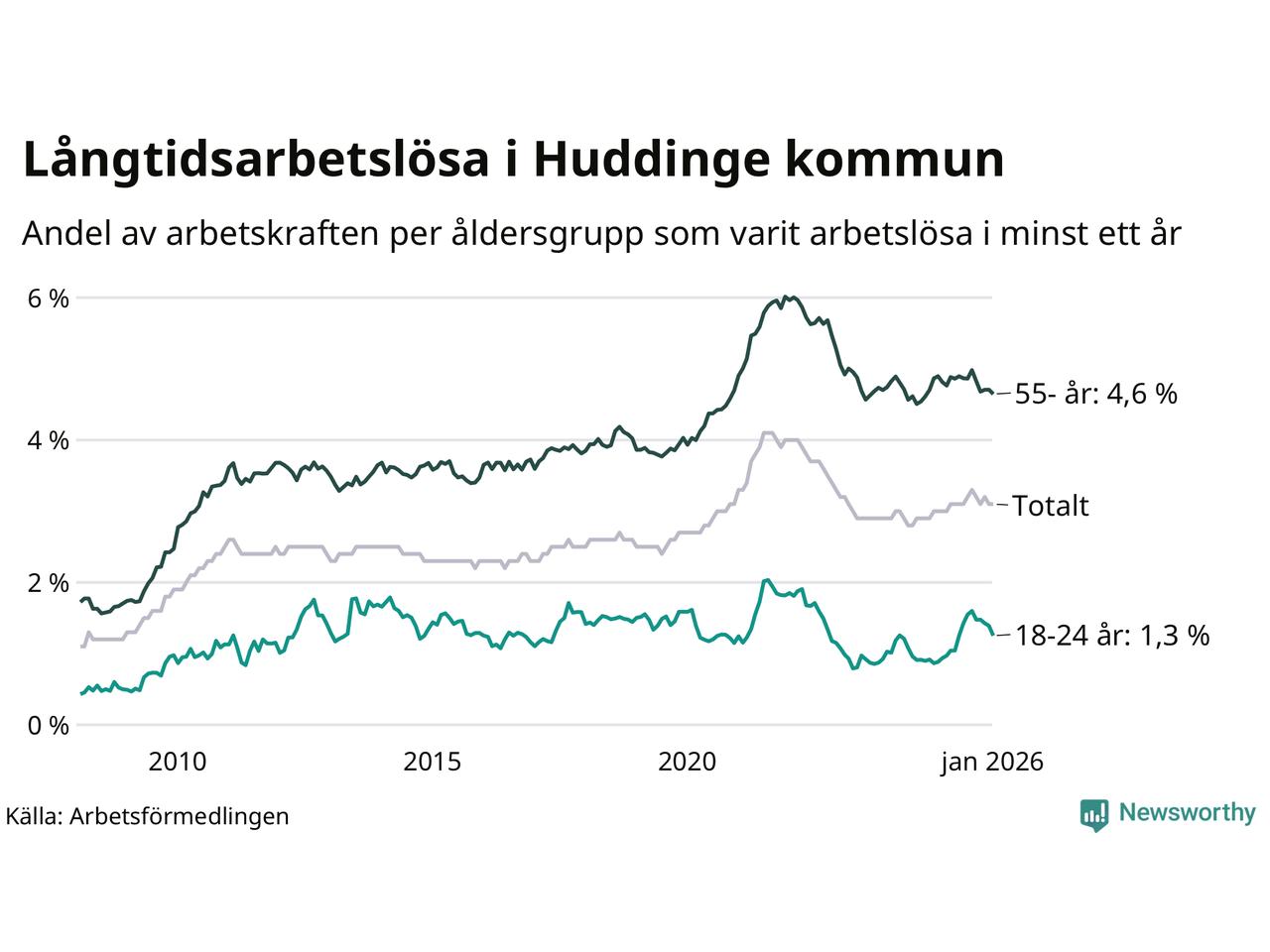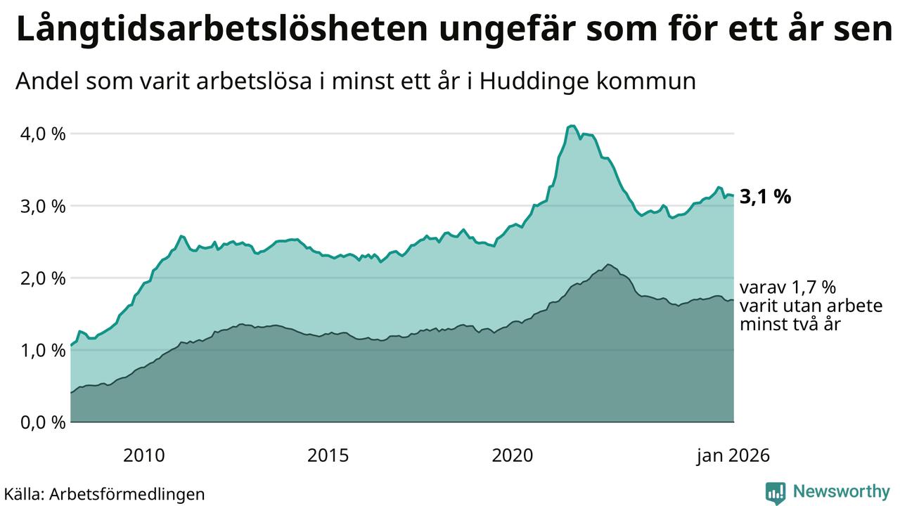 I januari hade 1 863 Huddingebor varit arbetslösa i minst ett år, vilket är sex fler än månaden innan. 1 863 personer motsvarar 3,1 procent av arbetskraften i kommunen – andelen långtidsarbetslösa är ungefär på samma nivå som för ett år sedan.