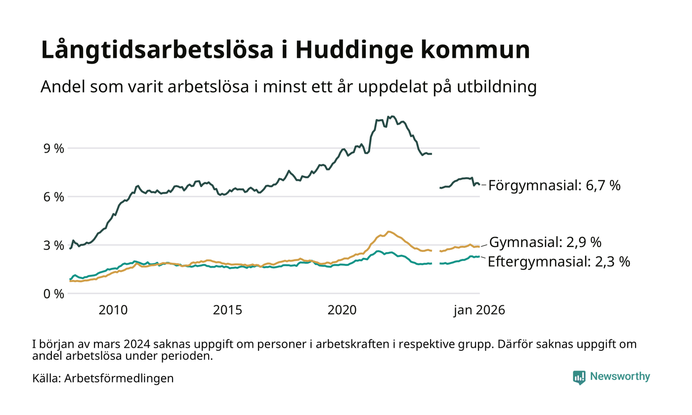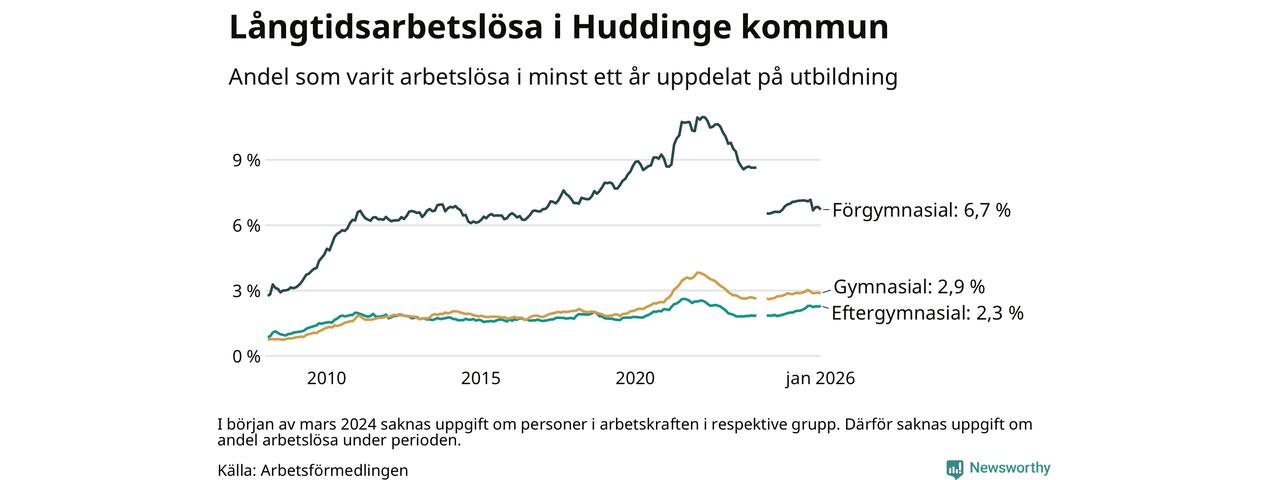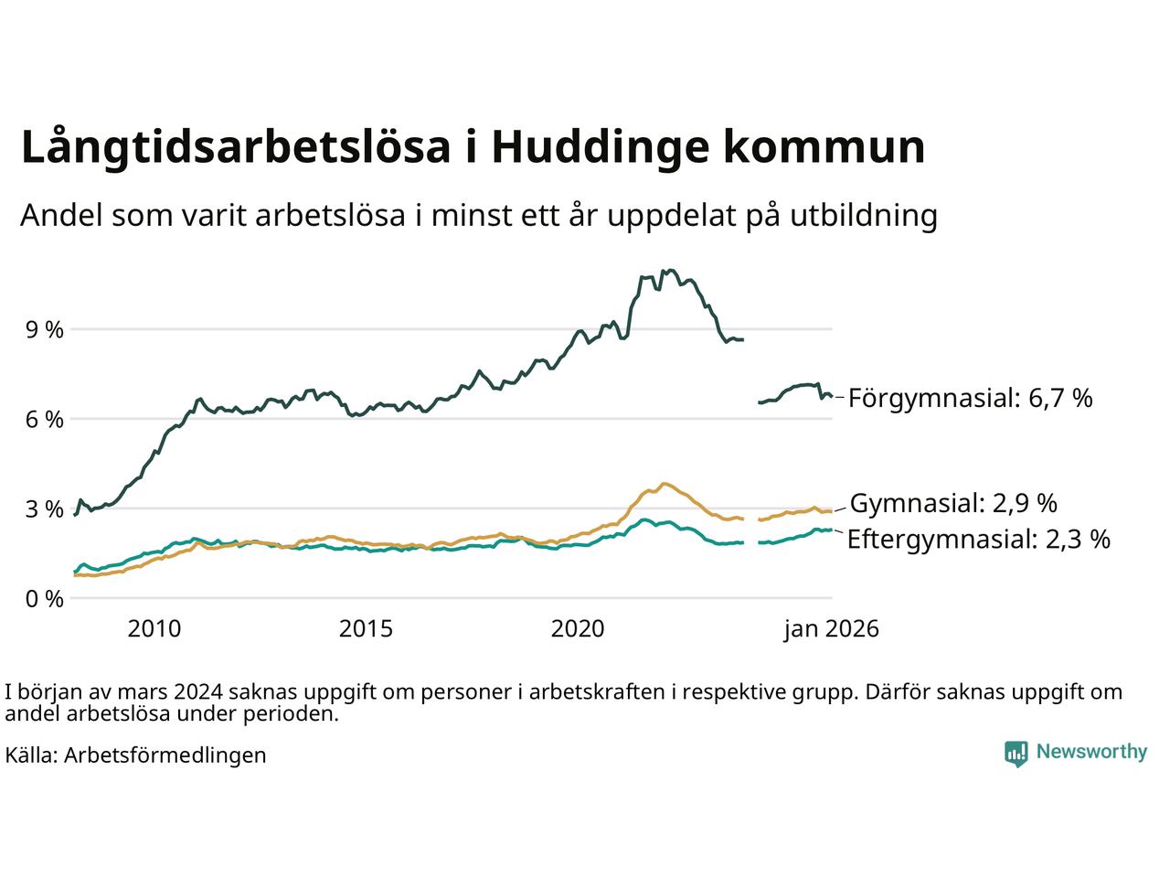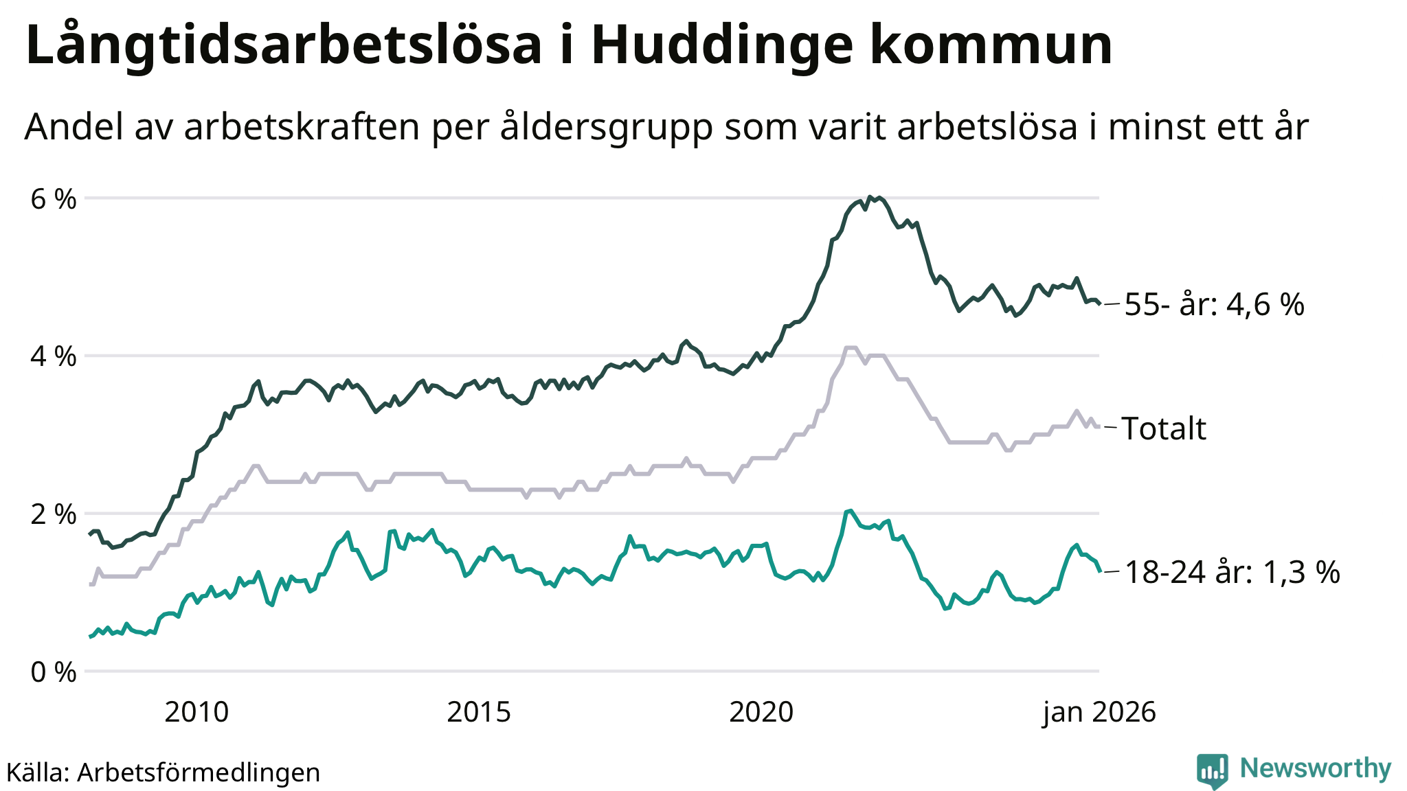 I januari hade 1 863 Huddingebor varit arbetslösa i minst ett år, vilket är sex fler än månaden innan. 1 863 personer motsvarar 3,1 procent av arbetskraften i kommunen – andelen långtidsarbetslösa är ungefär på samma nivå som för ett år sedan.