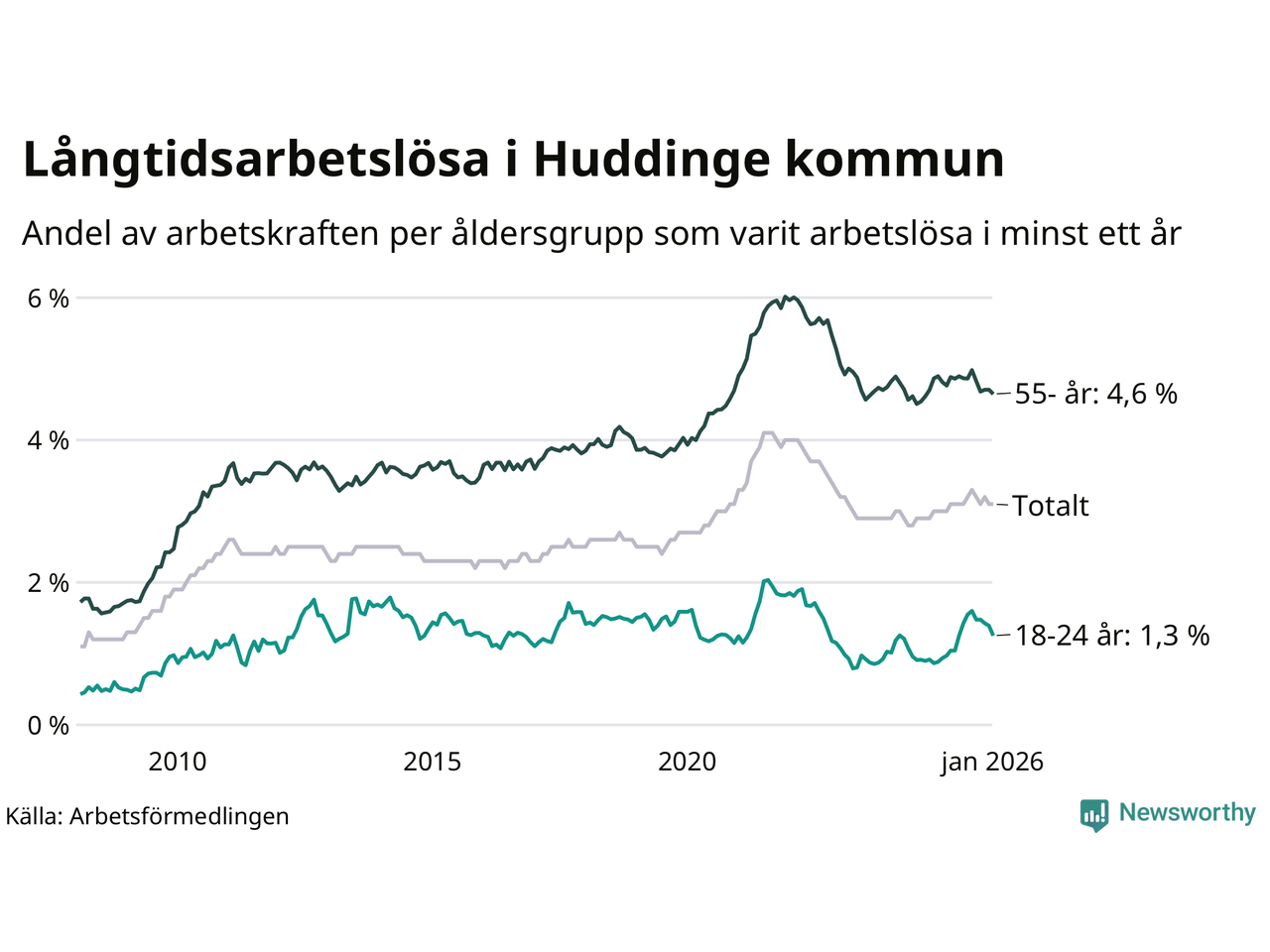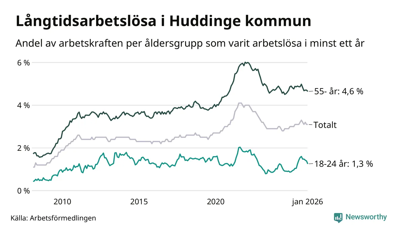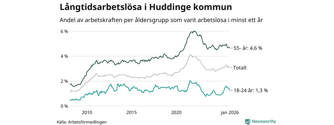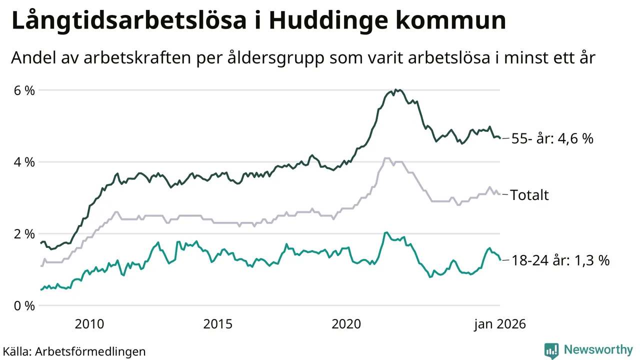 Av de 1 863 personerna som varit arbetslösa i mer än ett år i Huddinge kommun är 535 personer mellan 55 och 661 år och 72 är mellan 18 och 24 år. För den äldre gruppen är andelen arbetslösa 4,6 procent medan den i den yngre gruppen är 1,3 procent. Även i riket som helhet är långtidsarbetslösheten högre i gruppen äldre.