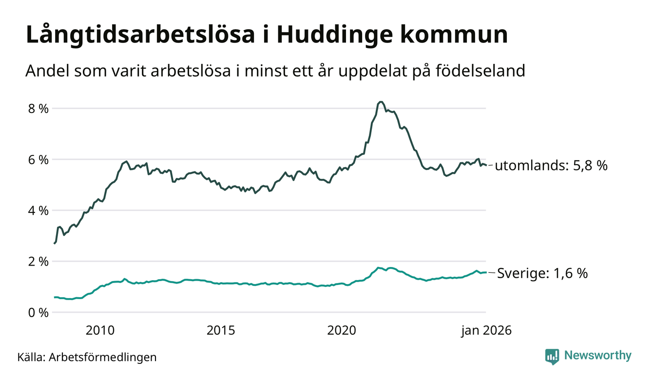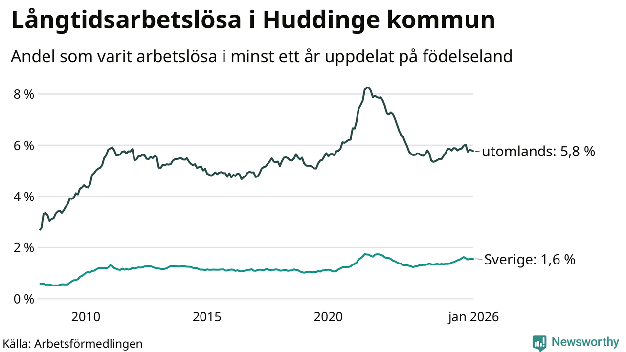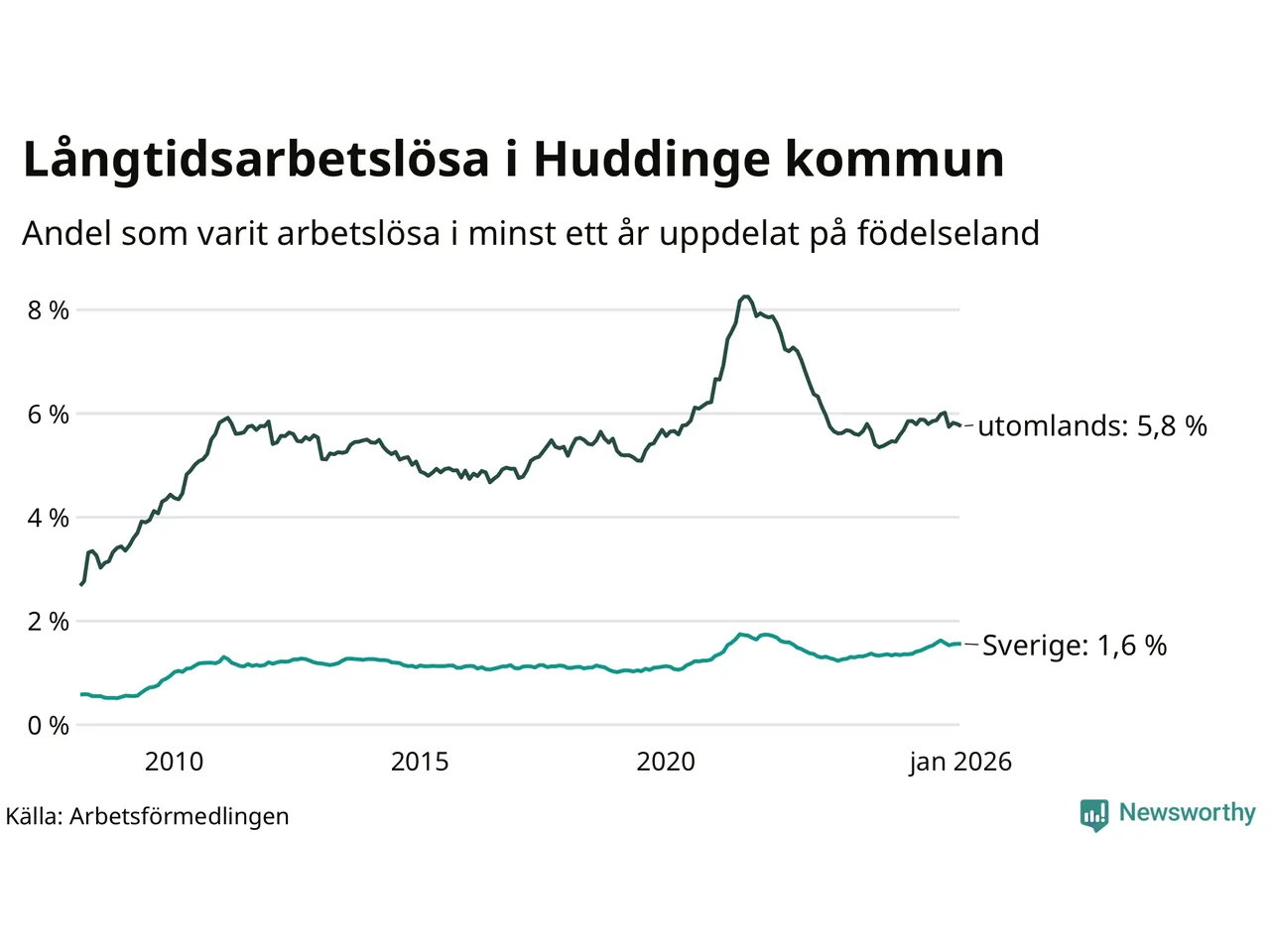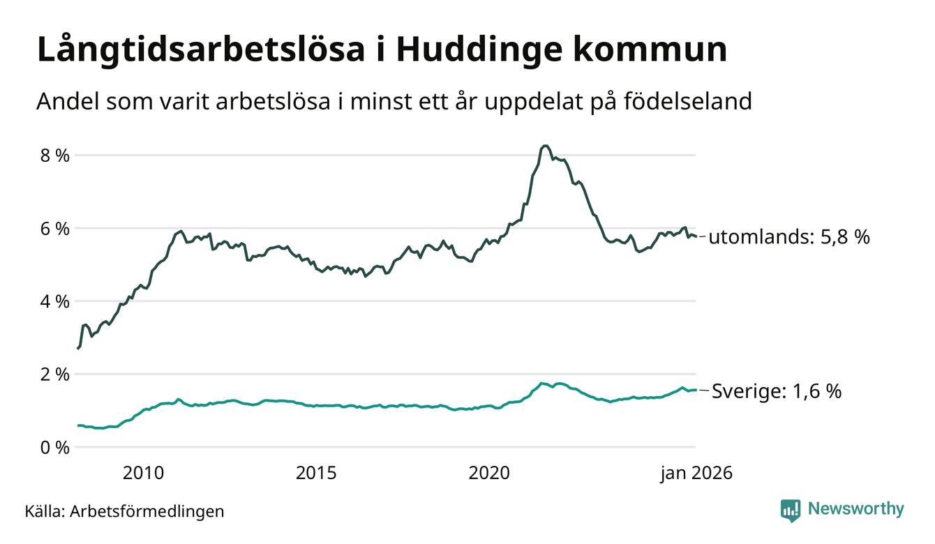 580 av de långtidsarbetslösa i Huddinge är födda i Sverige, medan 1 283 är födda utomlands. Det innebär att långtidsarbetslösheten bland Sverigefödda är 1,6 procent, medan den är fyra gånger så hög – 5,8 procent – bland födda utomlands. Även i riket som helhet är arbetslösheten högre bland utrikesfödda.