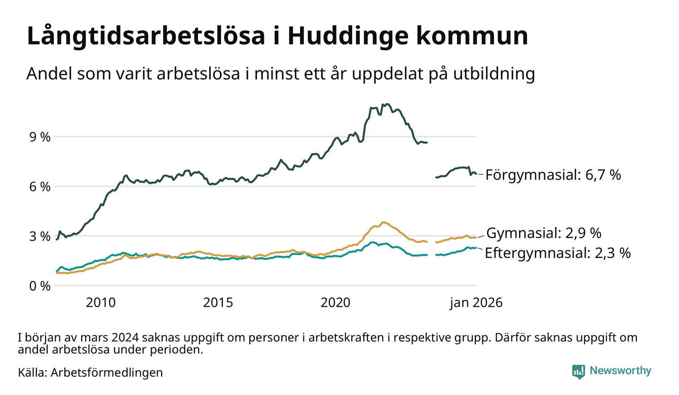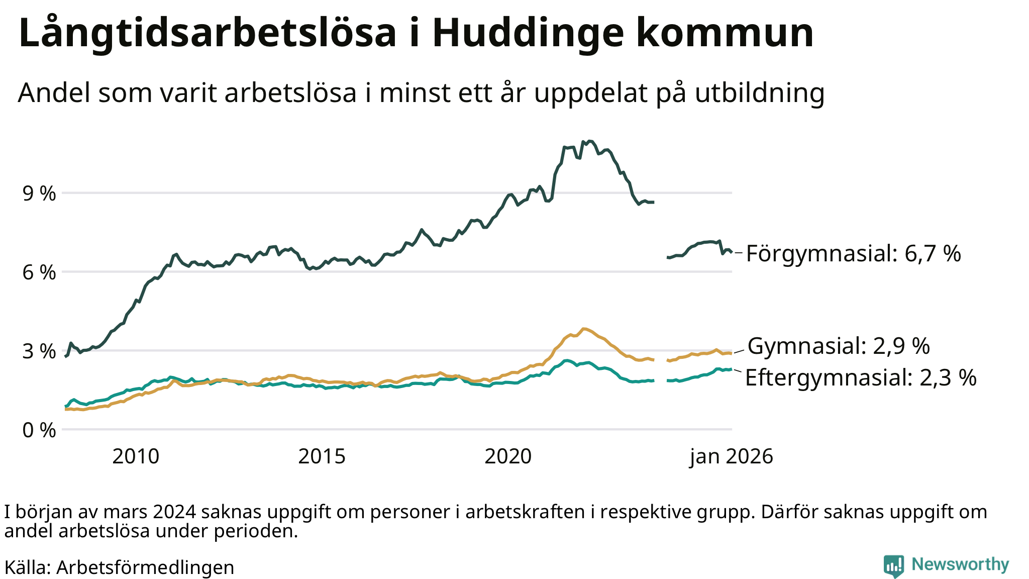 Graf över andel långtidsarbetslösa i Huddinge uppdelat på utbildningsnivå