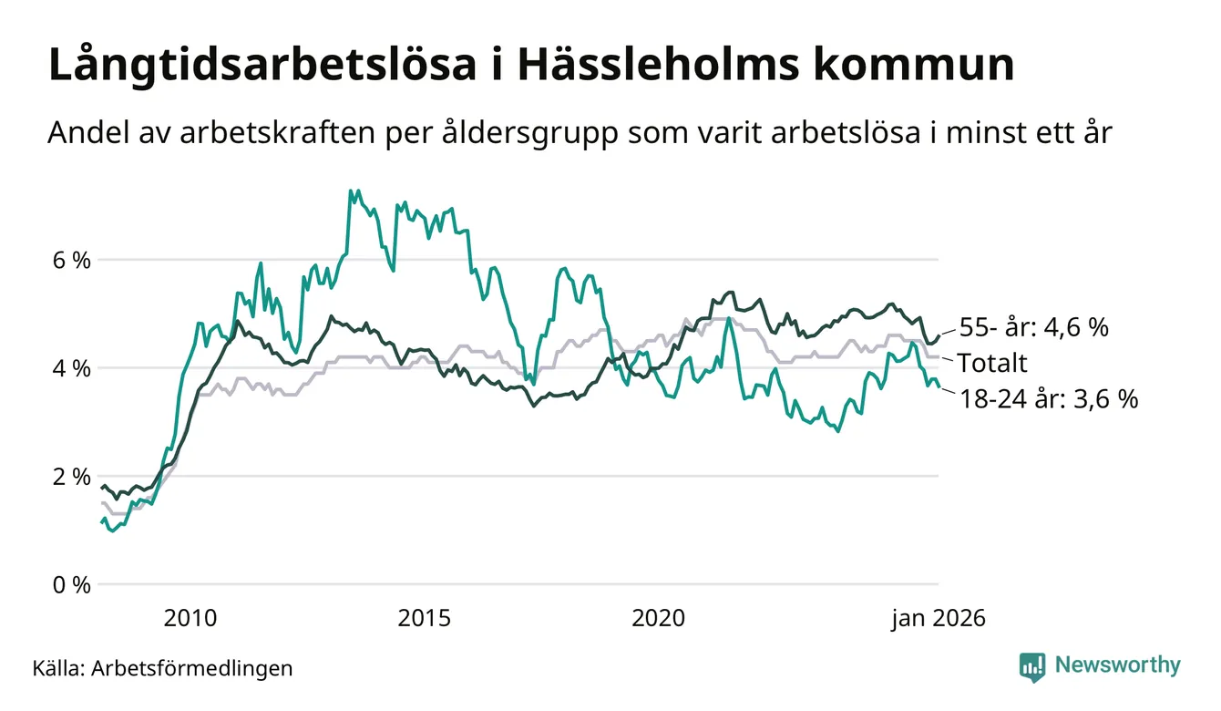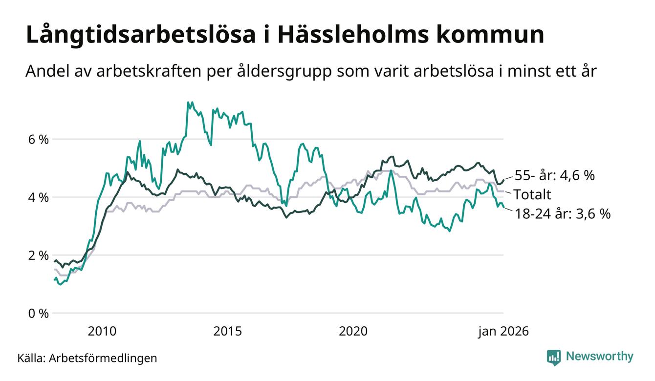 Av de 1 051 personerna som varit arbetslösa i mer än ett år i Hässleholms kommun är 267 personer mellan 55 och 661 år och 91 är mellan 18 och 24 år. För den äldre gruppen är andelen arbetslösa 4,6 procent medan den i den yngre gruppen är 3,6 procent. Även i riket som helhet är långtidsarbetslösheten högre i gruppen äldre.