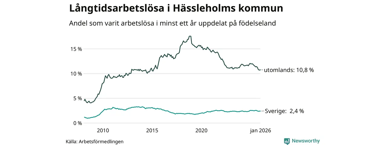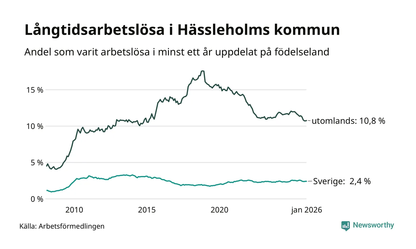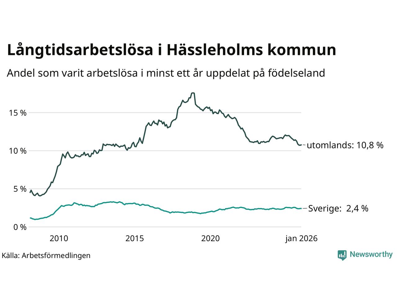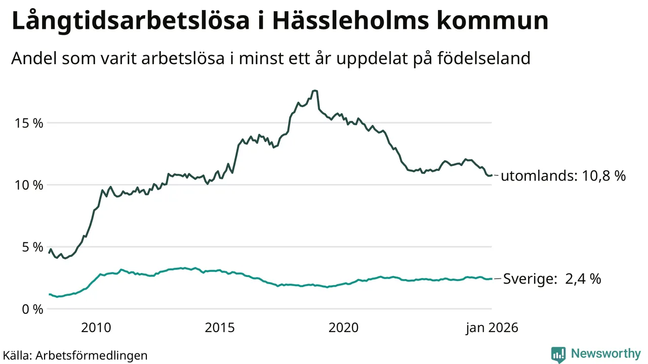 468 av de långtidsarbetslösa i Hässleholm är födda i Sverige, medan 583 är födda utomlands. Det innebär att långtidsarbetslösheten bland Sverigefödda är 2,4 procent, medan den är fyra gånger så hög – 10,8 procent – bland födda utomlands. Även i riket som helhet är arbetslösheten högre bland utrikesfödda.