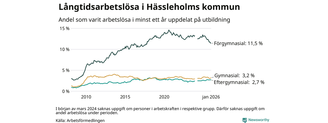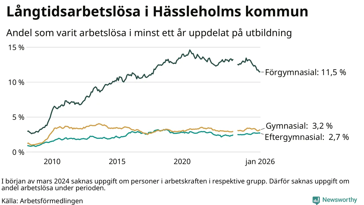 Andelen som varit utan arbete i minst ett år i Hässleholm i januari var lägre än för ett år sedan. Men jämfört med i december har antalet långtidsarbetslösa ökat.