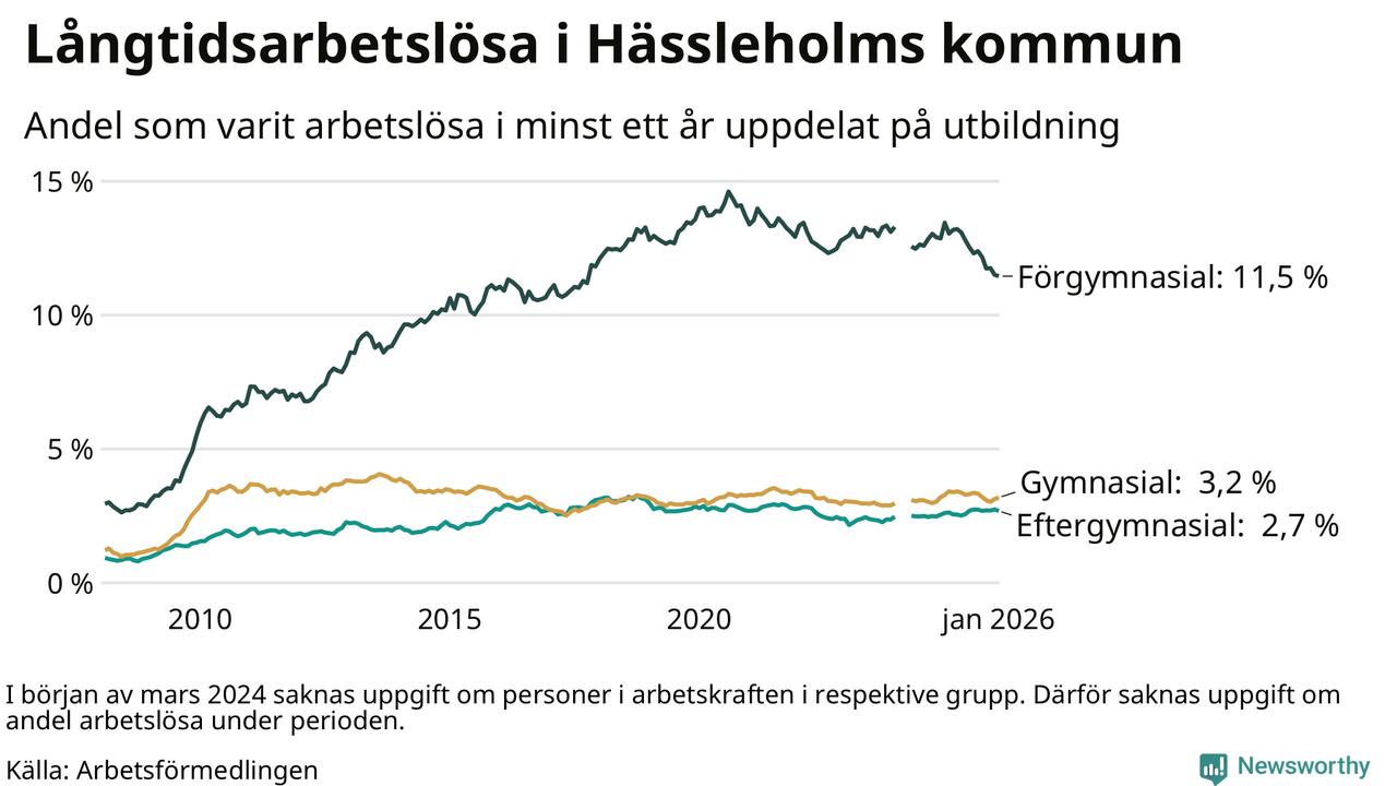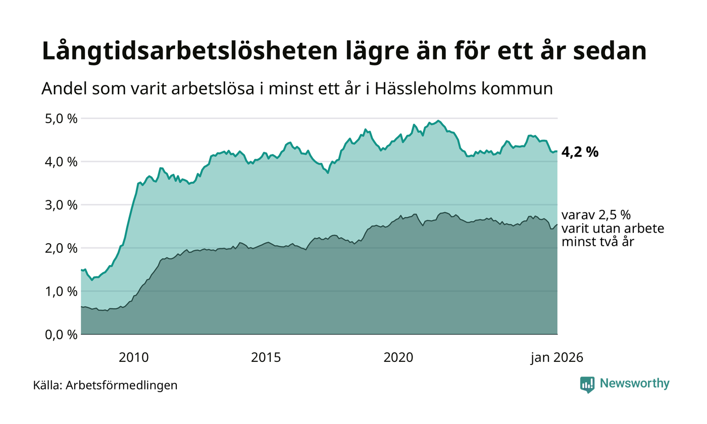 I januari hade 1 051 Hässleholmsbor varit arbetslösa i minst ett år, vilket är nio fler än månaden innan. 1 051 personer motsvarar 4,2 procent av arbetskraften i kommunen – andelen långtidsarbetslösa är 0,4 procentenheter lägre än samma månad för ett år sedan. Hässleholm tillhör de kommuner som har högst andel långtidsarbetslösa i hela landet just nu.