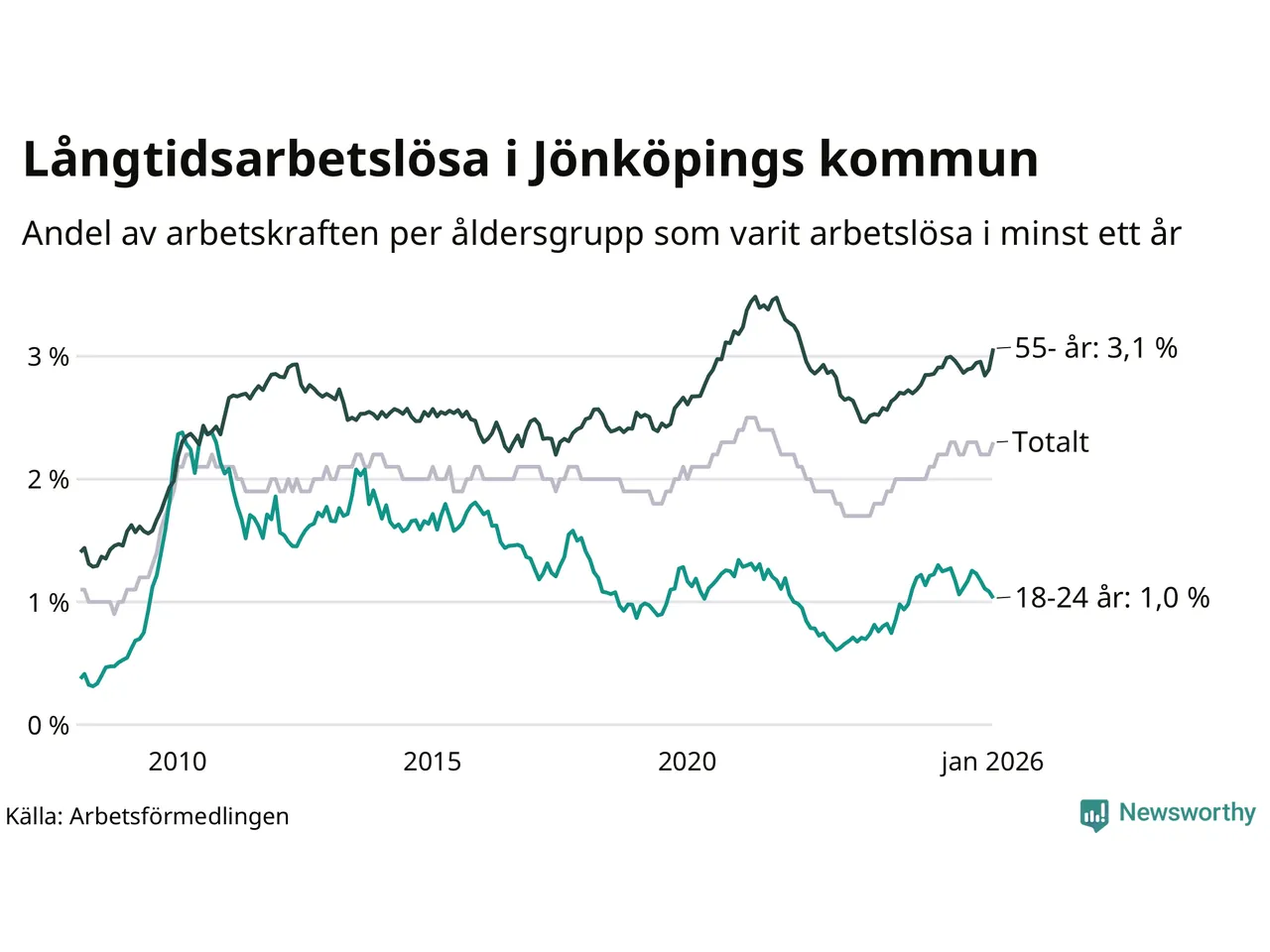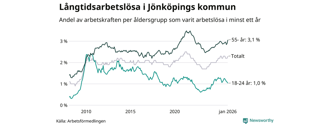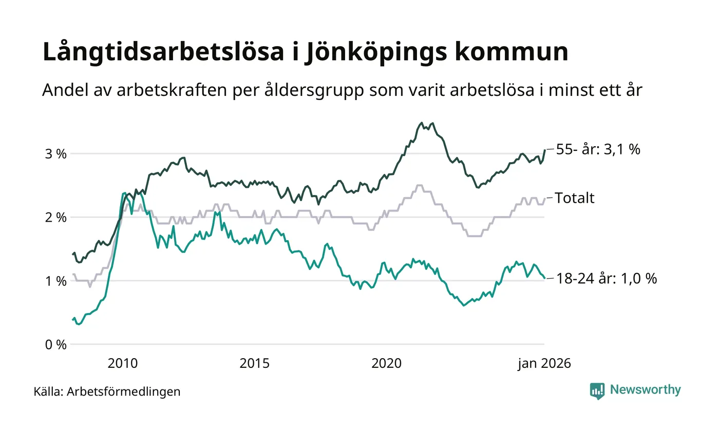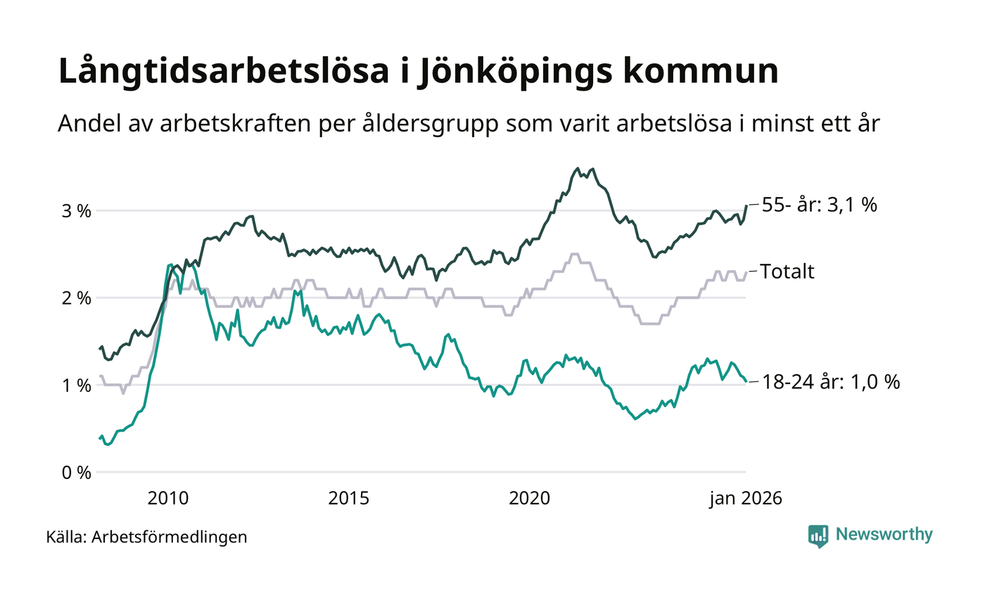 Av de 1 740 personerna som varit arbetslösa i mer än ett år i Jönköpings kommun är 454 personer mellan 55 och 661 år och 96 är mellan 18 och 24 år. För den äldre gruppen är andelen arbetslösa 3,1 procent medan den i den yngre gruppen är 1,0 procent. Även i riket som helhet är långtidsarbetslösheten högre i gruppen äldre.