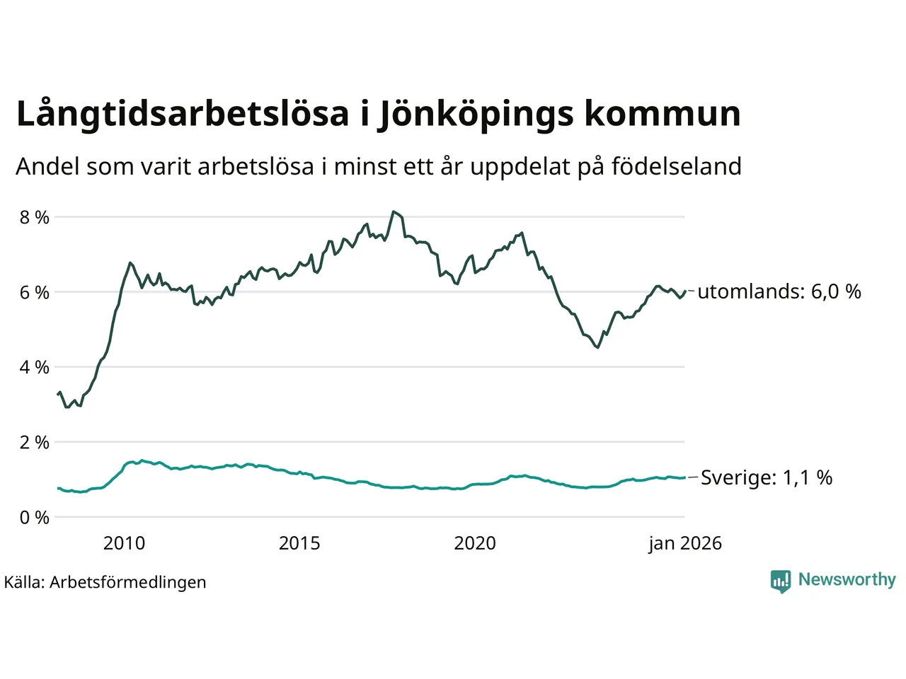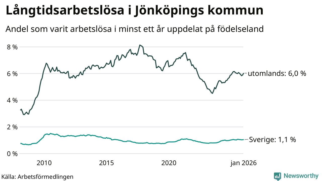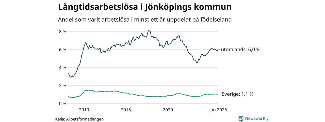 612 av de långtidsarbetslösa i Jönköpings kommun är födda i Sverige, medan 1 128 är födda utomlands. Det innebär att långtidsarbetslösheten bland Sverigefödda är 1,1 procent, medan den är fem gånger så hög – 6,0 procent – bland födda utomlands. Även i riket som helhet är arbetslösheten högre bland utrikesfödda.
