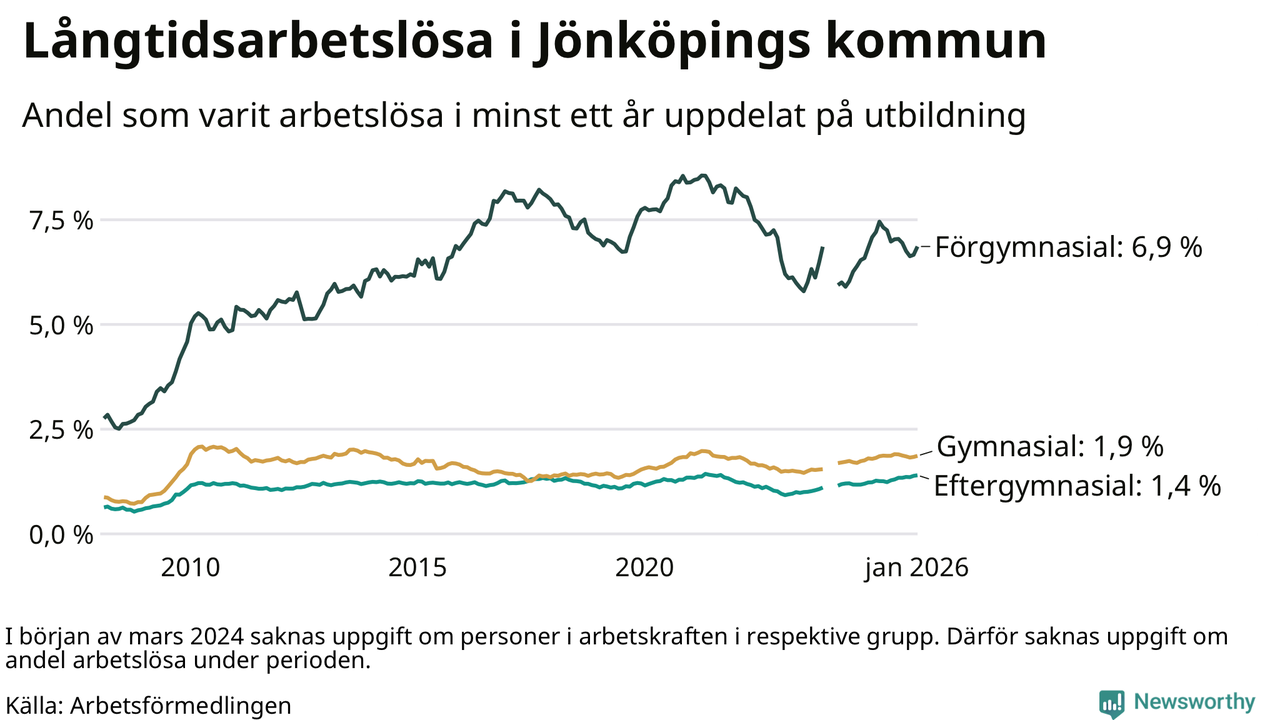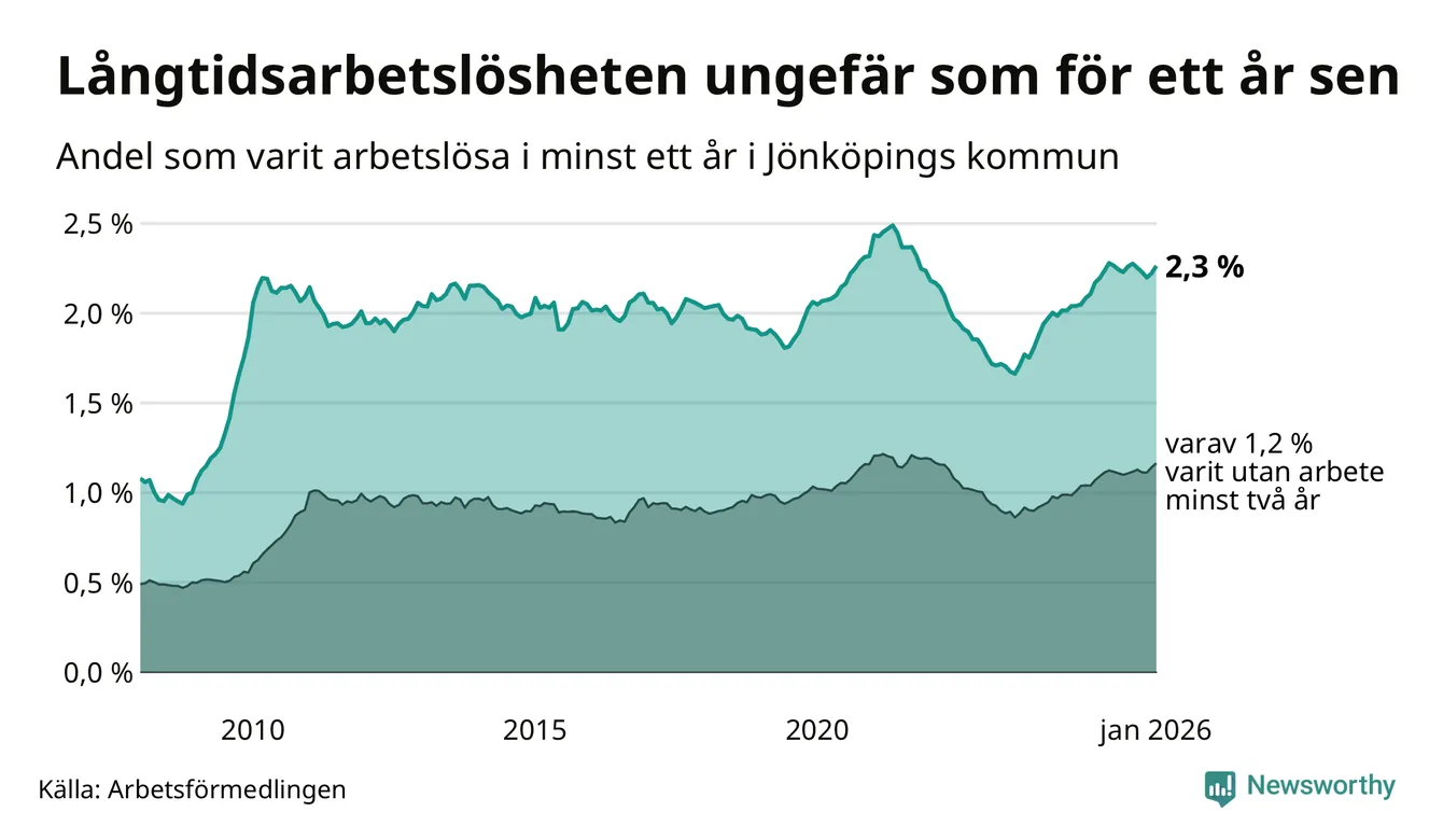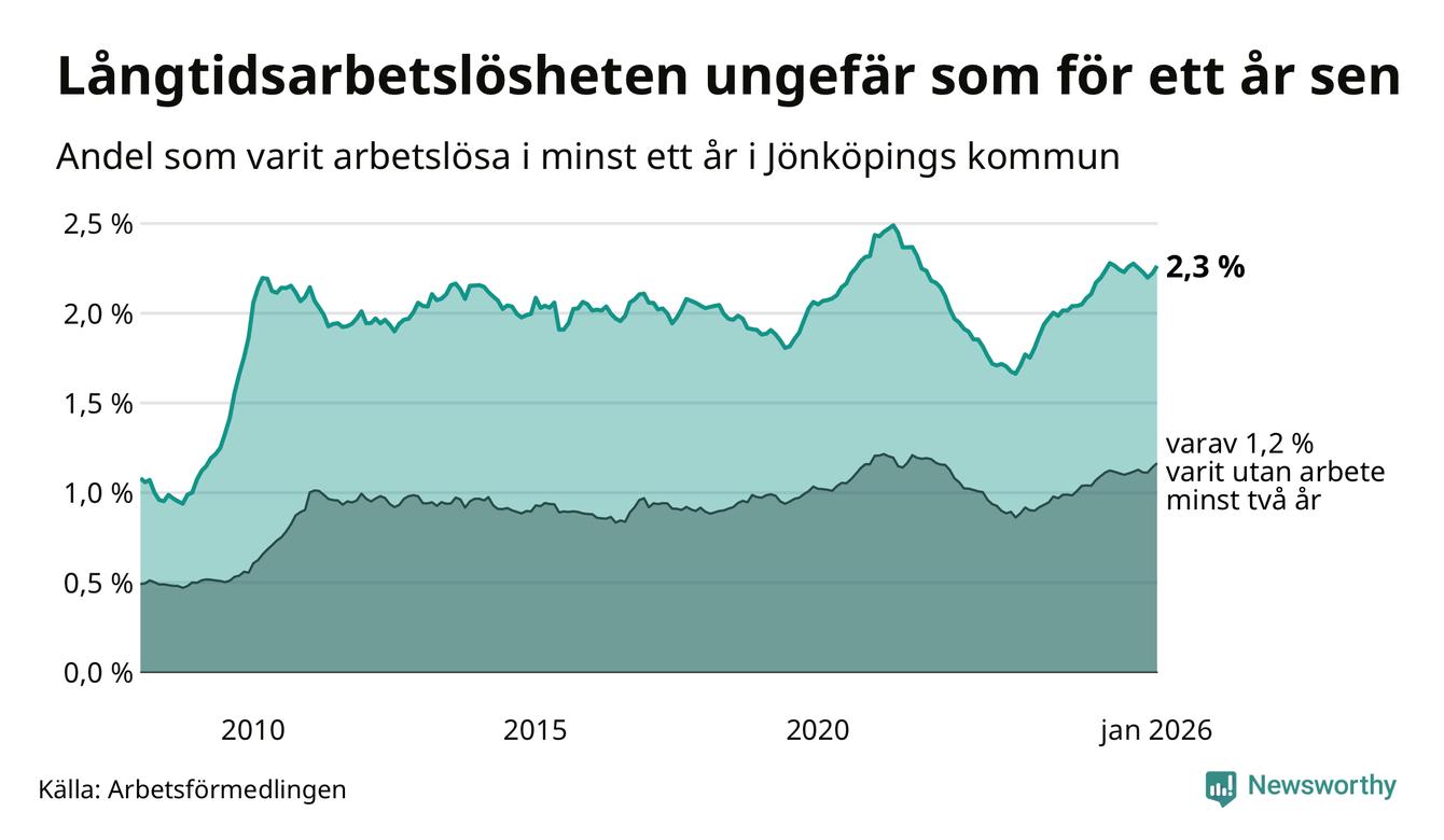 I januari hade 1 740 Jönköpingsbor varit arbetslösa i minst ett år, vilket är 46 fler än månaden innan. 1 740 personer motsvarar 2,3 procent av arbetskraften i kommunen – andelen långtidsarbetslösa är ungefär på samma nivå som för ett år sedan.