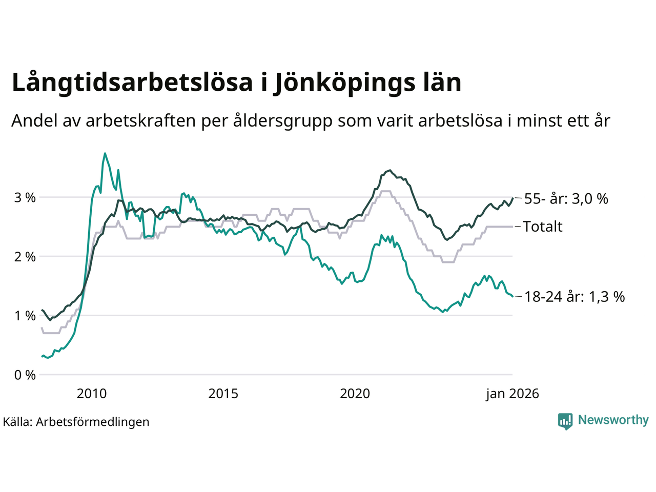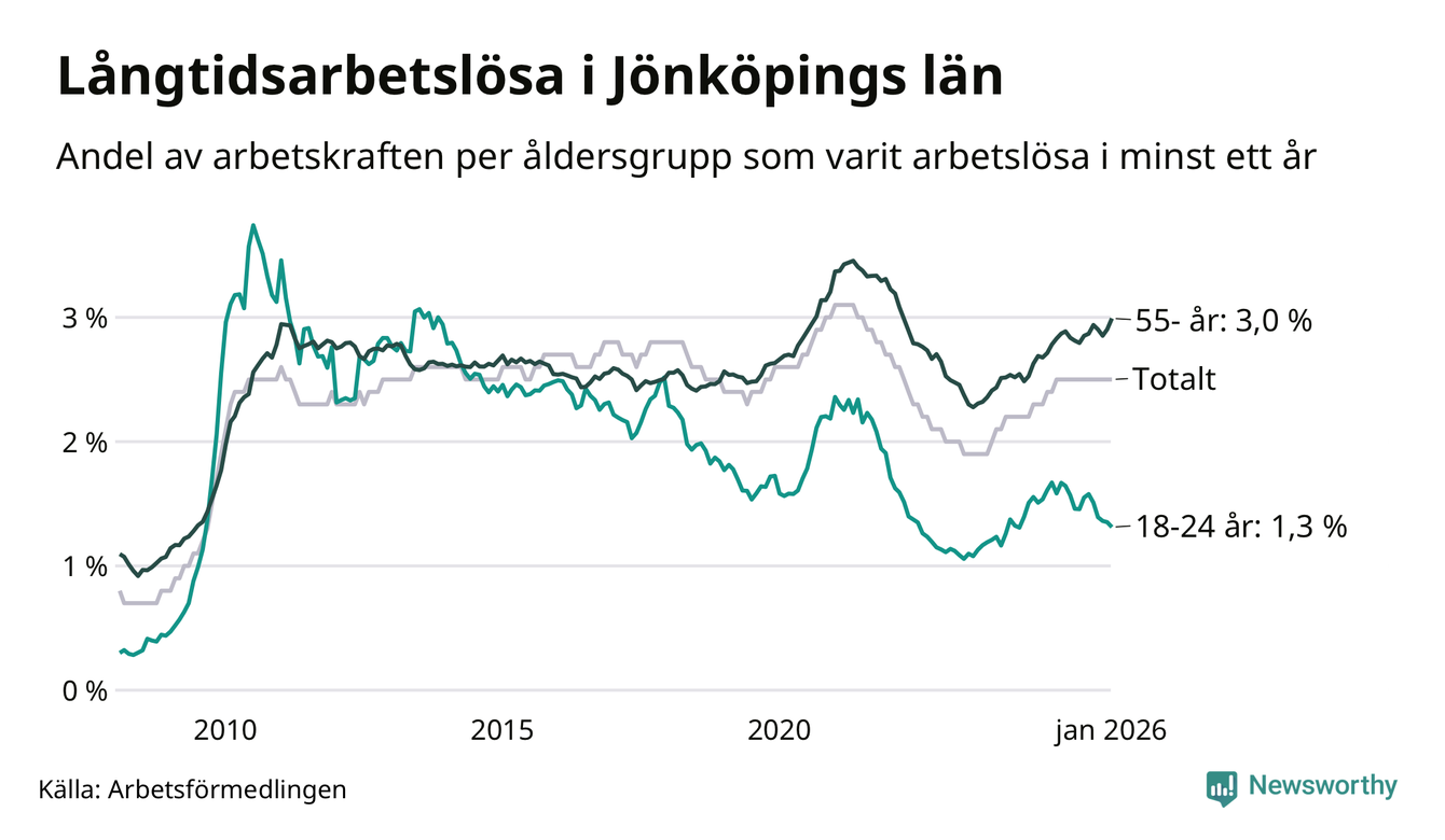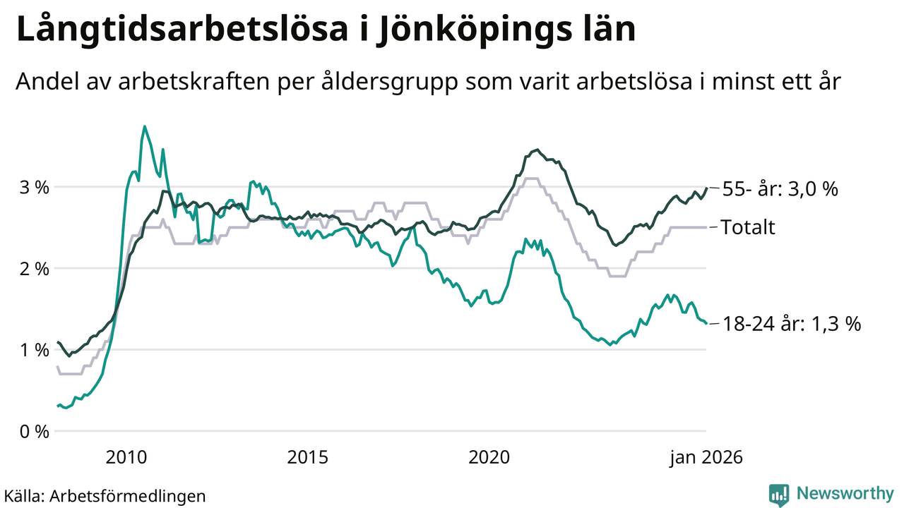 Av de 4 656 personerna som varit arbetslösa i mer än ett år i Jönköpings län är 1 199 personer mellan 55 och 661 år och mellan 272 och 272 är mellan 18 och 24 år. För den äldre gruppen är andelen arbetslösa 3,0 procent medan den i den yngre gruppen är 1,3 procent. Även i riket som helhet är långtidsarbetslösheten högre i gruppen äldre.