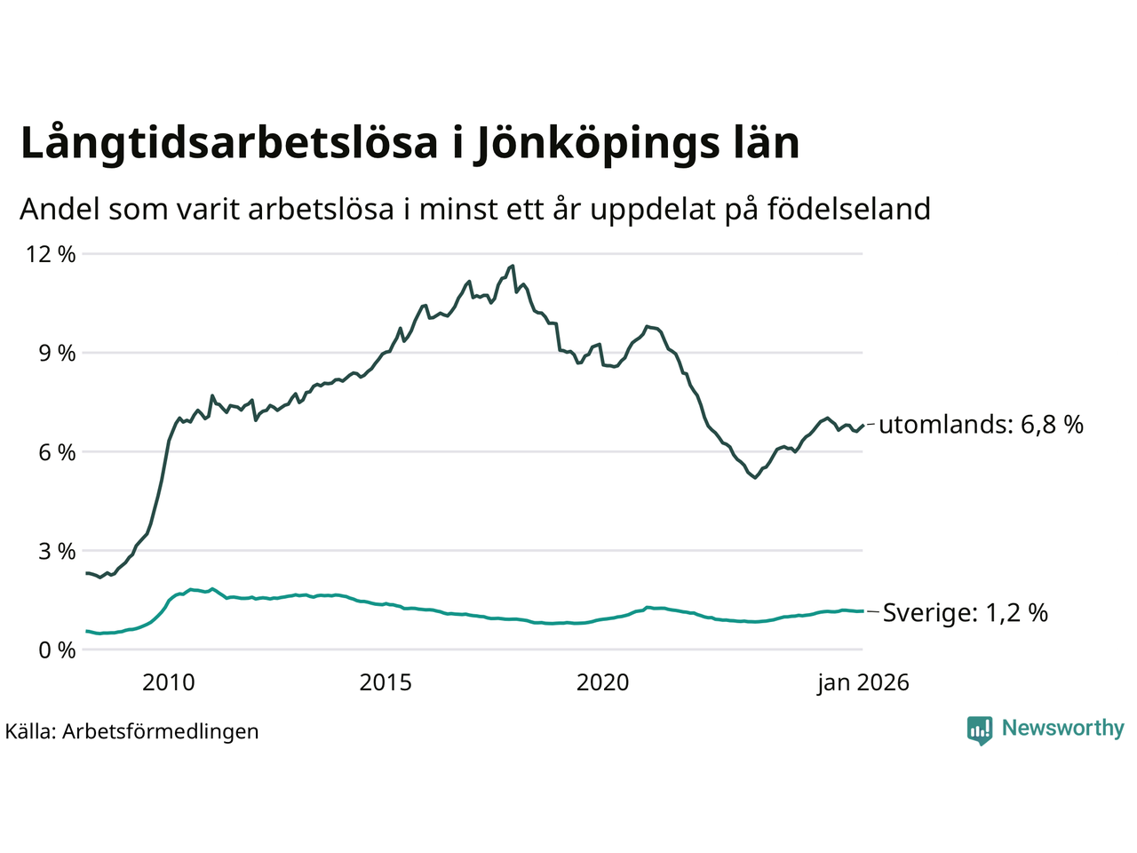 1 647 av de långtidsarbetslösa i Jönköpings län är födda i Sverige och mellan 3 010 och 3 013 är födda utomlands. Det innebär att långtidsarbetslösheten bland Sverigefödda är 1,2 procent, medan den ligger på 6,8 procent för utlandsfödda.