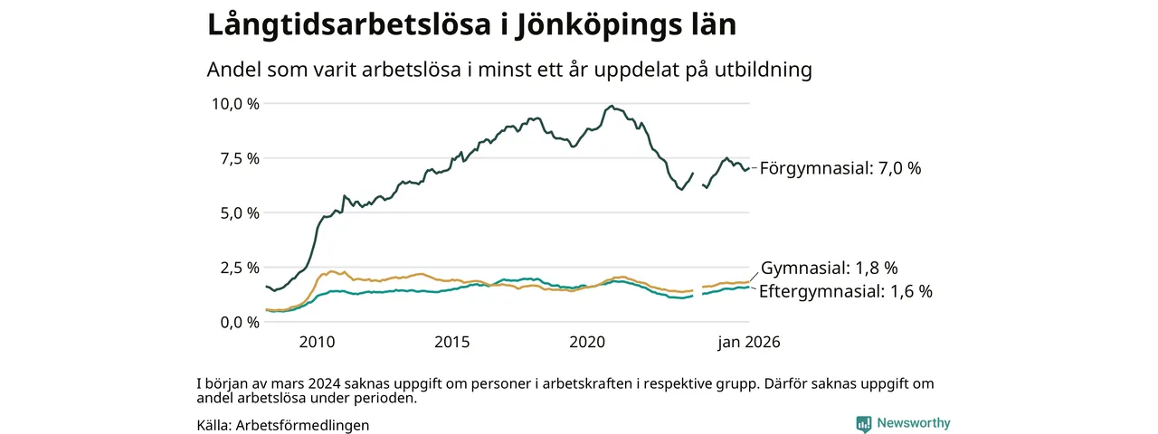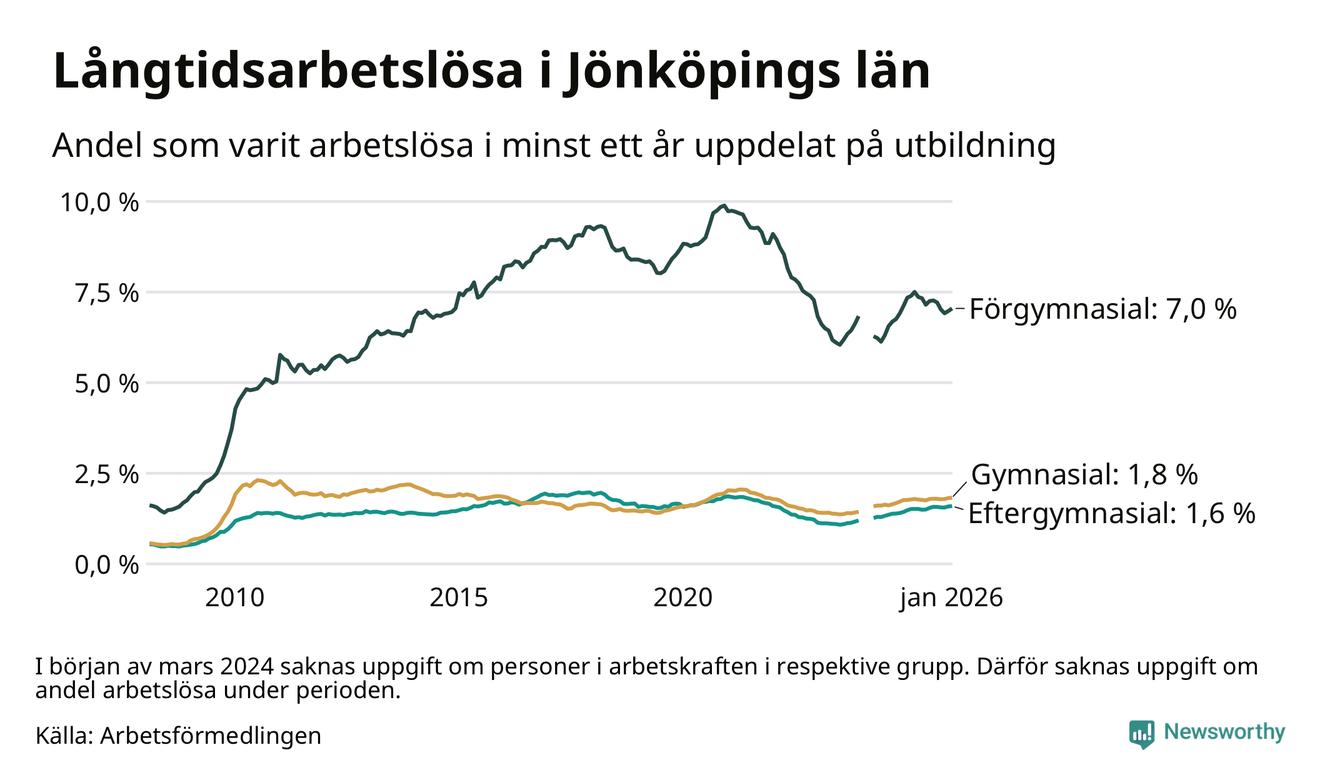 I januari hade 4 656 Jönköpingsbor varit arbetslösa i minst ett år, vilket är 77 fler än månaden innan. 4 656 personer motsvarar 2,5 procent av arbetskraften i länet – andelen långtidsarbetslösa är ungefär på samma nivå som för ett år sedan.