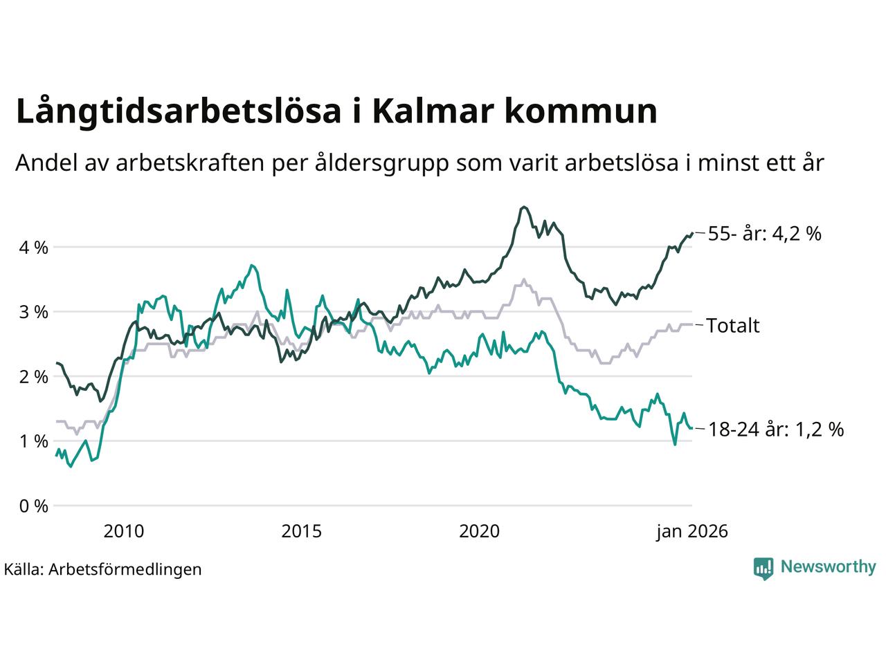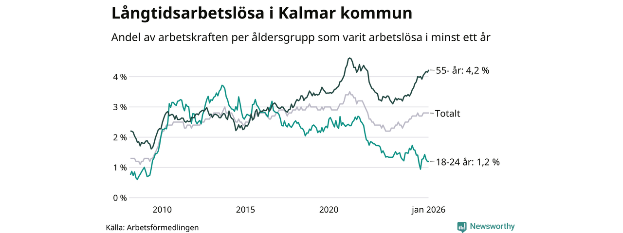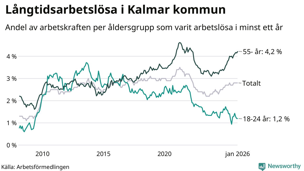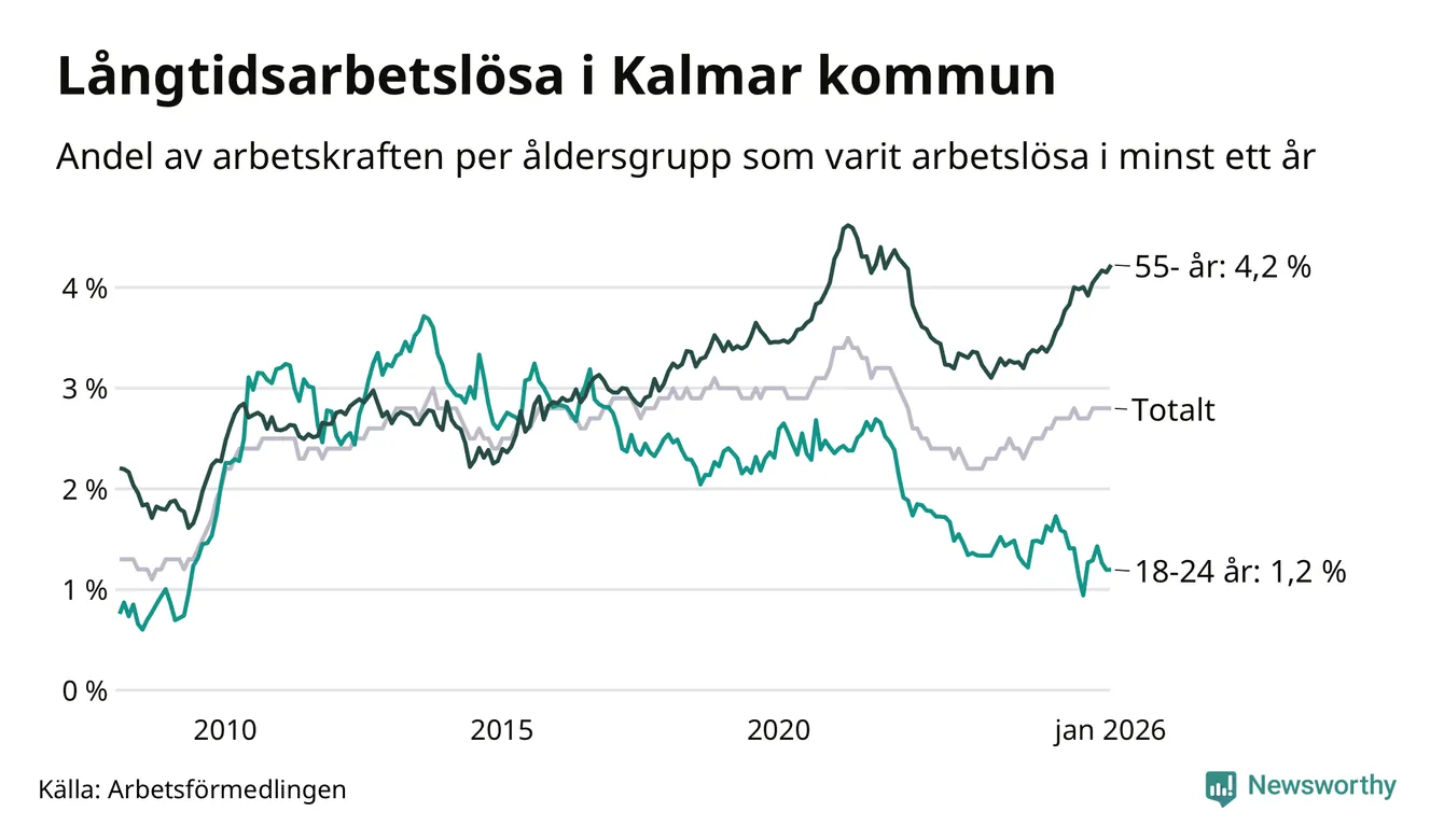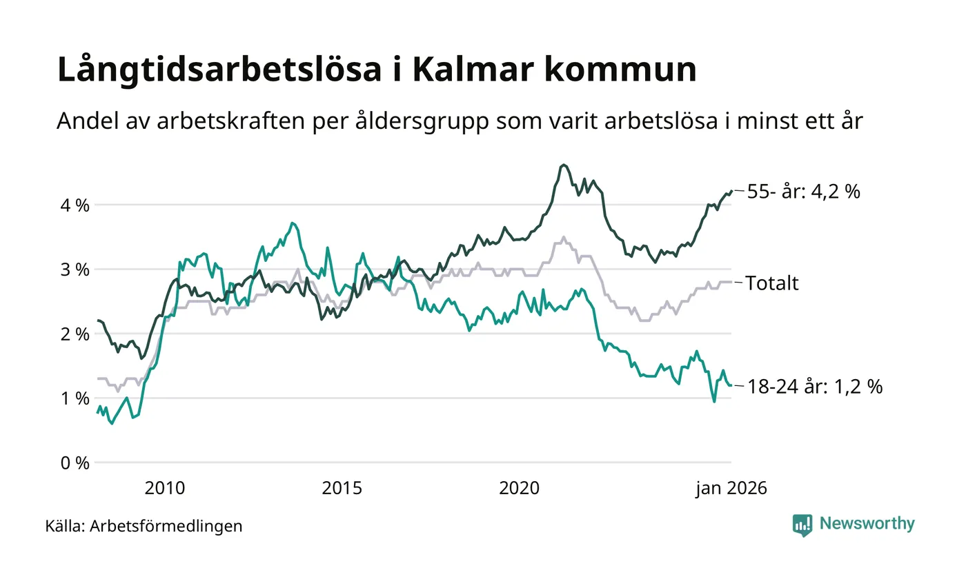 Av de 1 045 personerna som varit arbetslösa i mer än ett år i Kalmar kommun är 318 personer mellan 55 och 661 år och 51 är mellan 18 och 24 år. För den äldre gruppen är andelen arbetslösa 4,2 procent medan den i den yngre gruppen är 1,2 procent. Även i riket som helhet är långtidsarbetslösheten högre i gruppen äldre.