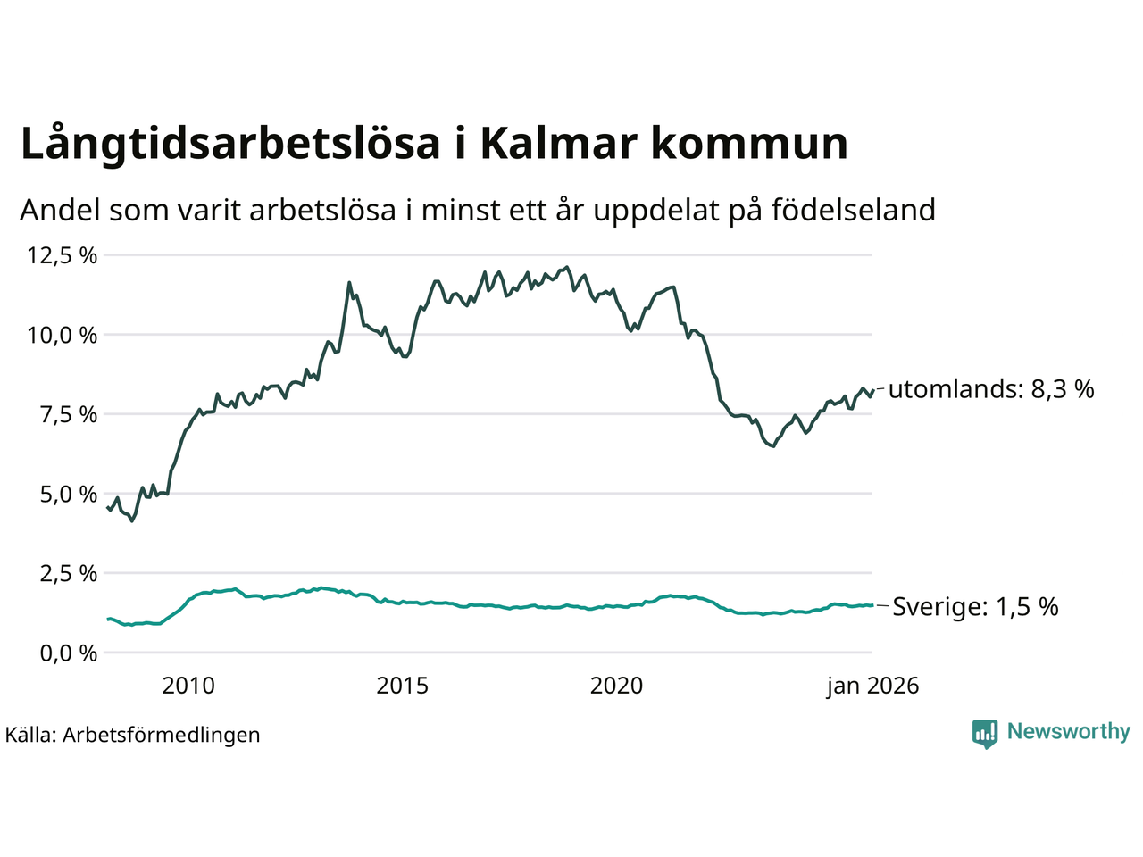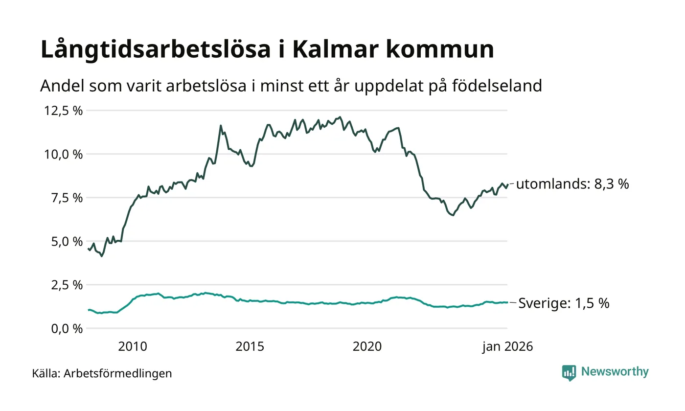 446 av de långtidsarbetslösa i Kalmar kommun är födda i Sverige, medan 599 är födda utomlands. Det innebär att långtidsarbetslösheten bland Sverigefödda är 1,5 procent, medan den är sex gånger så hög – 8,3 procent – bland födda utomlands. Även i riket som helhet är arbetslösheten högre bland utrikesfödda.