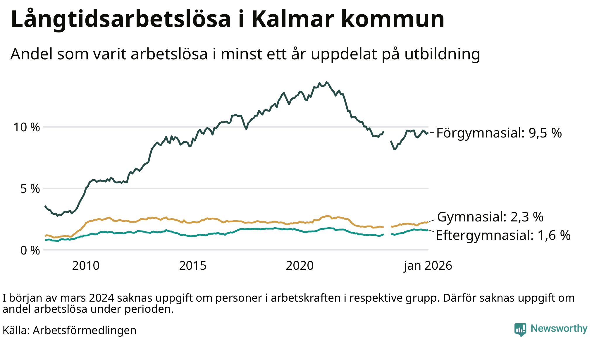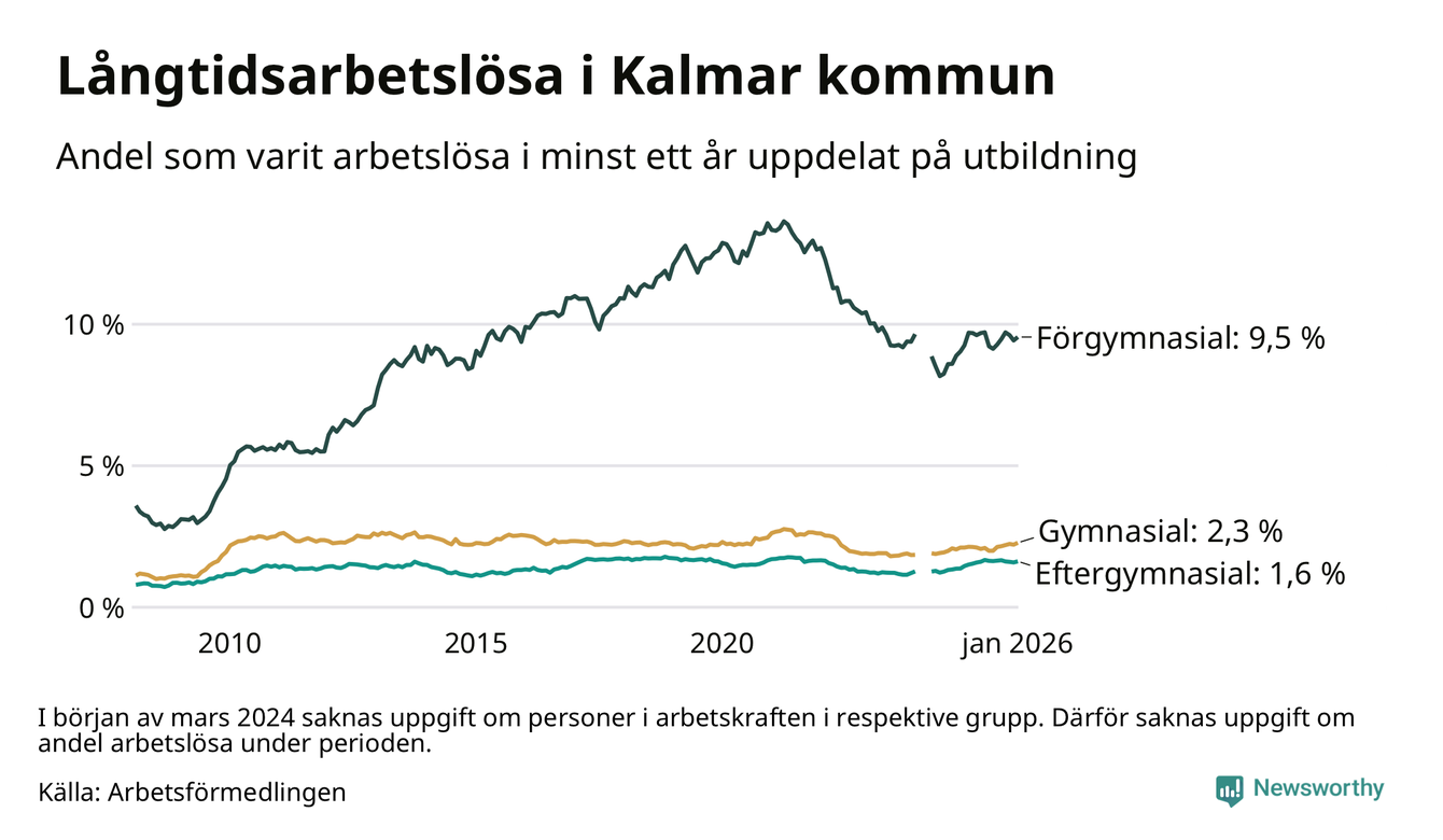 I januari hade 1 045 Kalmarbor varit arbetslösa i minst ett år, vilket är 29 fler än månaden innan. 1 045 personer motsvarar 2,8 procent av arbetskraften i kommunen – andelen långtidsarbetslösa är ungefär på samma nivå som för ett år sedan.