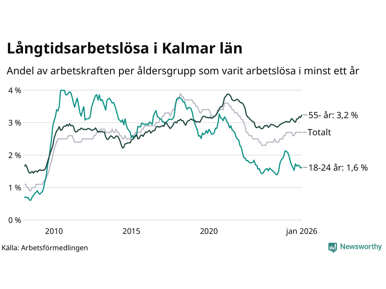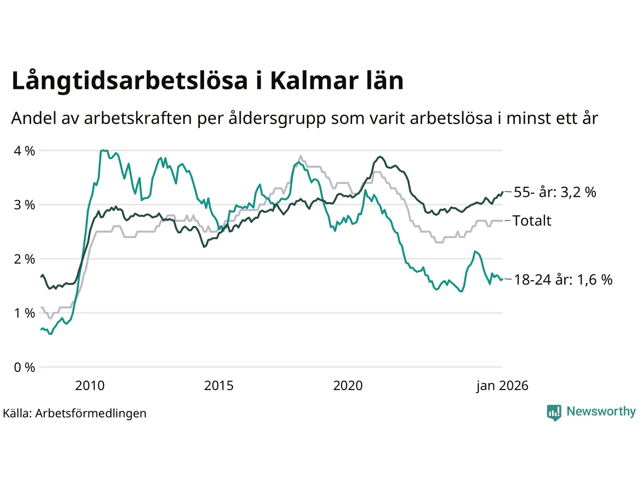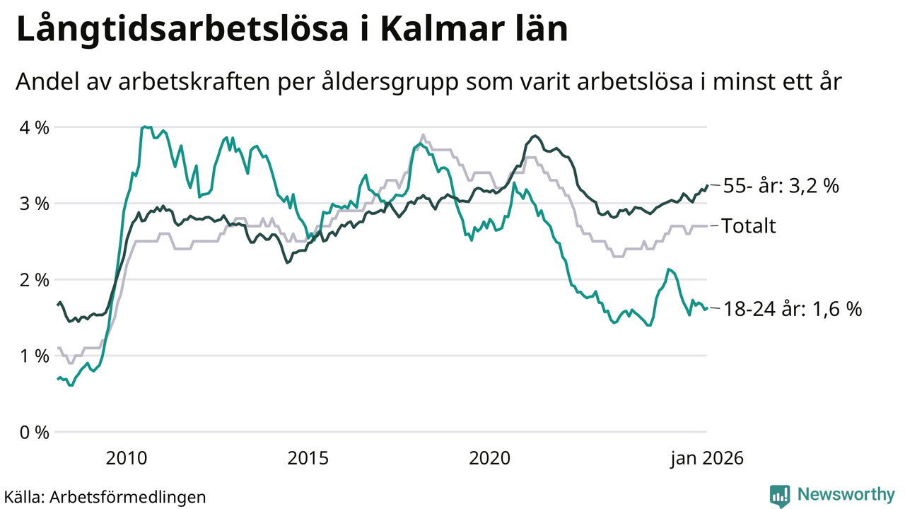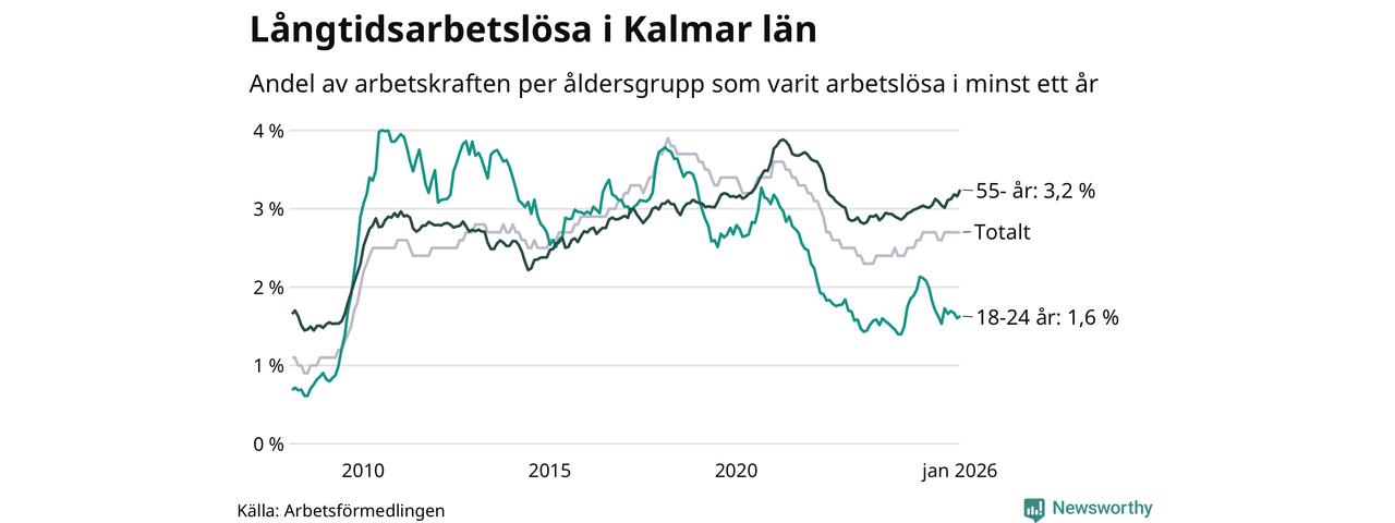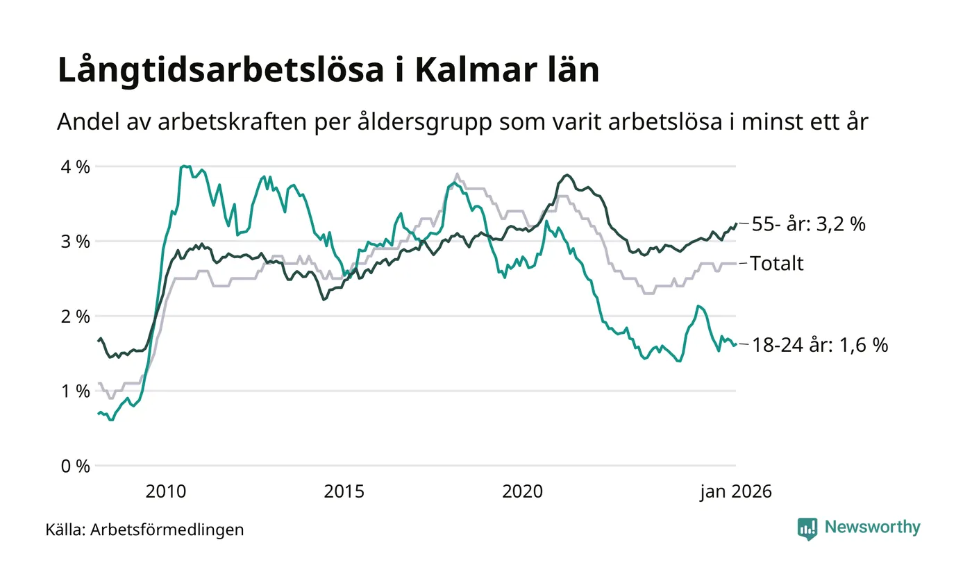 Av de 3 133 personerna som varit arbetslösa i mer än ett år i Kalmar län är 904 personer mellan 55 och 661 år och mellan 190 och 190 är mellan 18 och 24 år. För den äldre gruppen är andelen arbetslösa 3,2 procent medan den i den yngre gruppen är 1,6 procent. Även i riket som helhet är långtidsarbetslösheten högre i gruppen äldre.