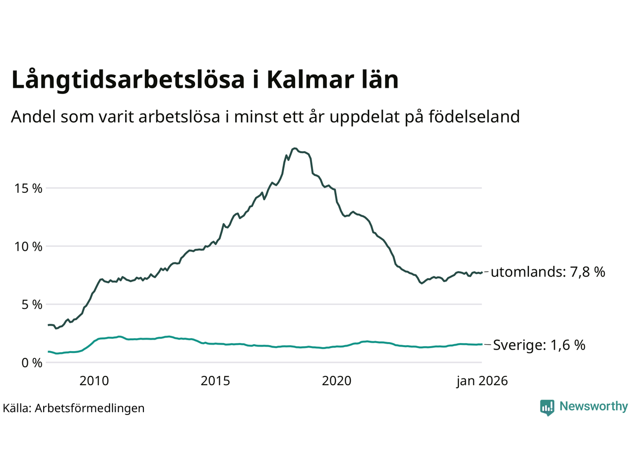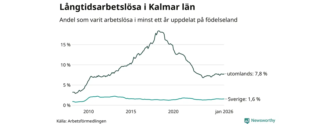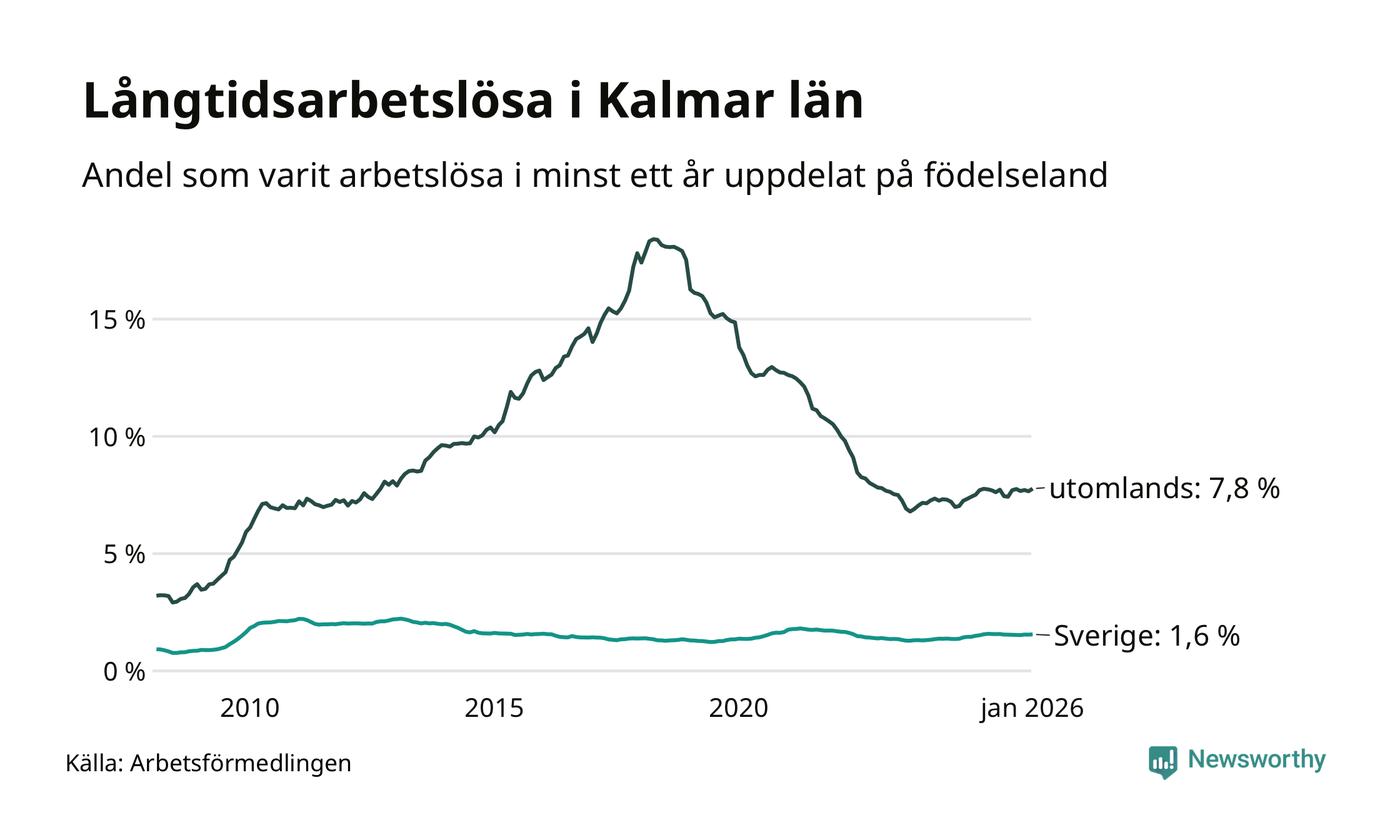 1 479 av de långtidsarbetslösa i Kalmar län är födda i Sverige och mellan 1 655 och 1 658 är födda utomlands. Det innebär att långtidsarbetslösheten bland Sverigefödda är 1,6 procent, medan den ligger på 7,8 procent för utlandsfödda.
