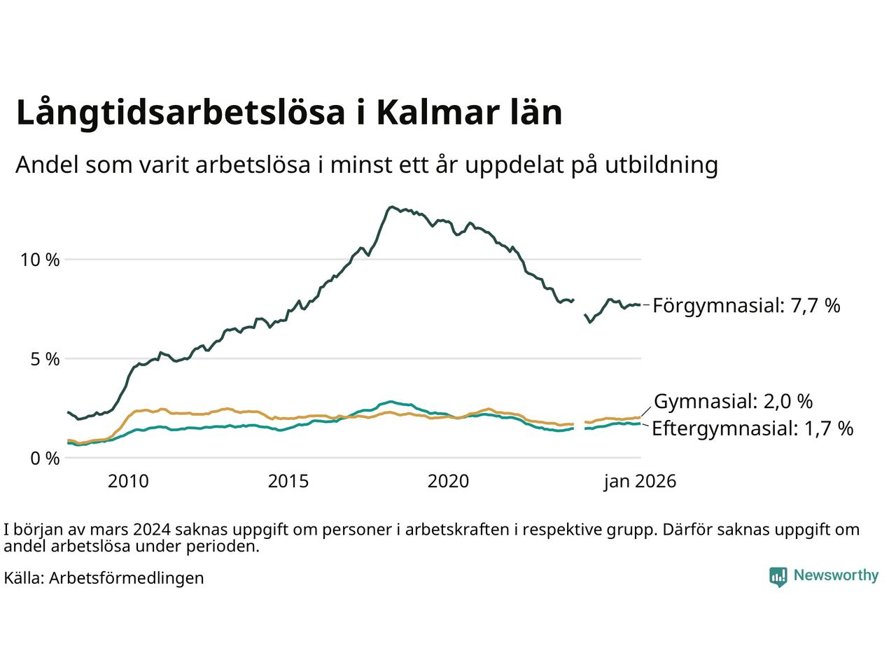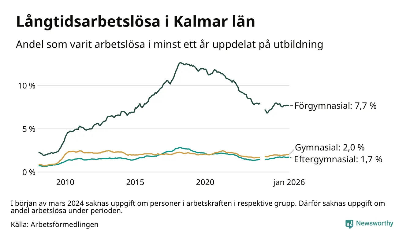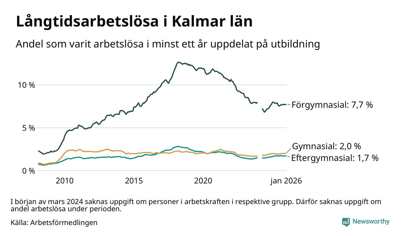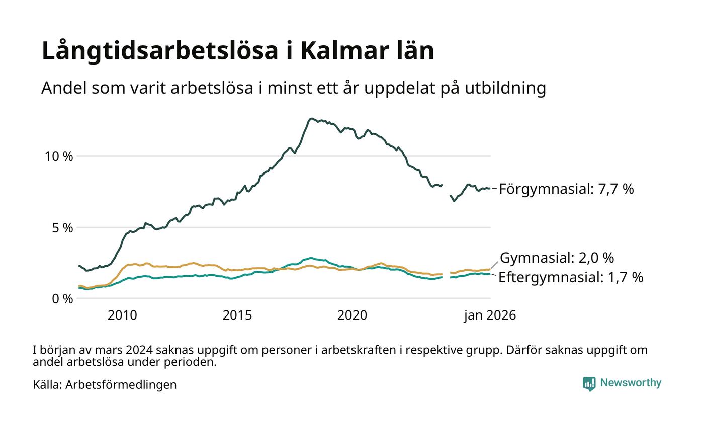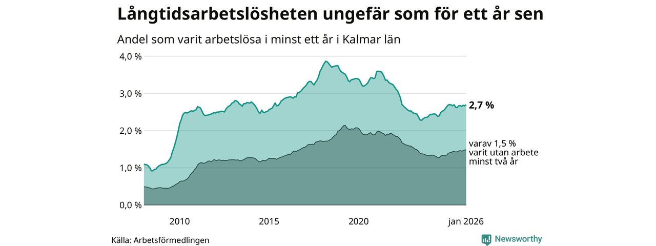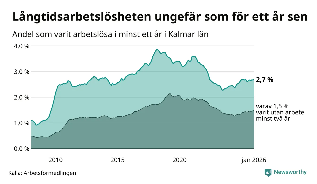 I januari hade 3 133 Kalmarbor varit arbetslösa i minst ett år, vilket är 59 fler än månaden innan. 3 133 personer motsvarar 2,7 procent av arbetskraften i länet – andelen långtidsarbetslösa är ungefär på samma nivå som för ett år sedan.