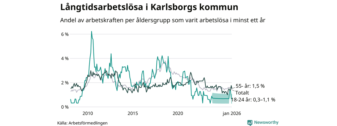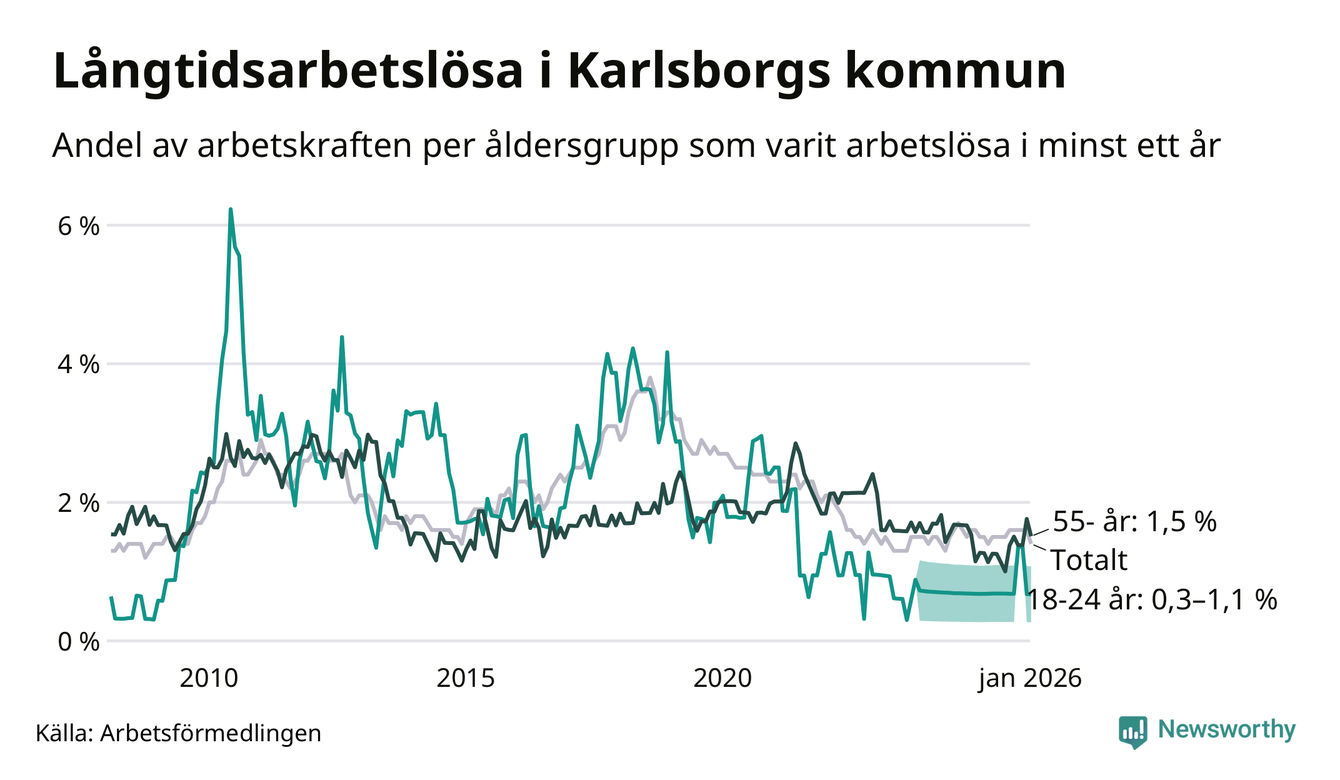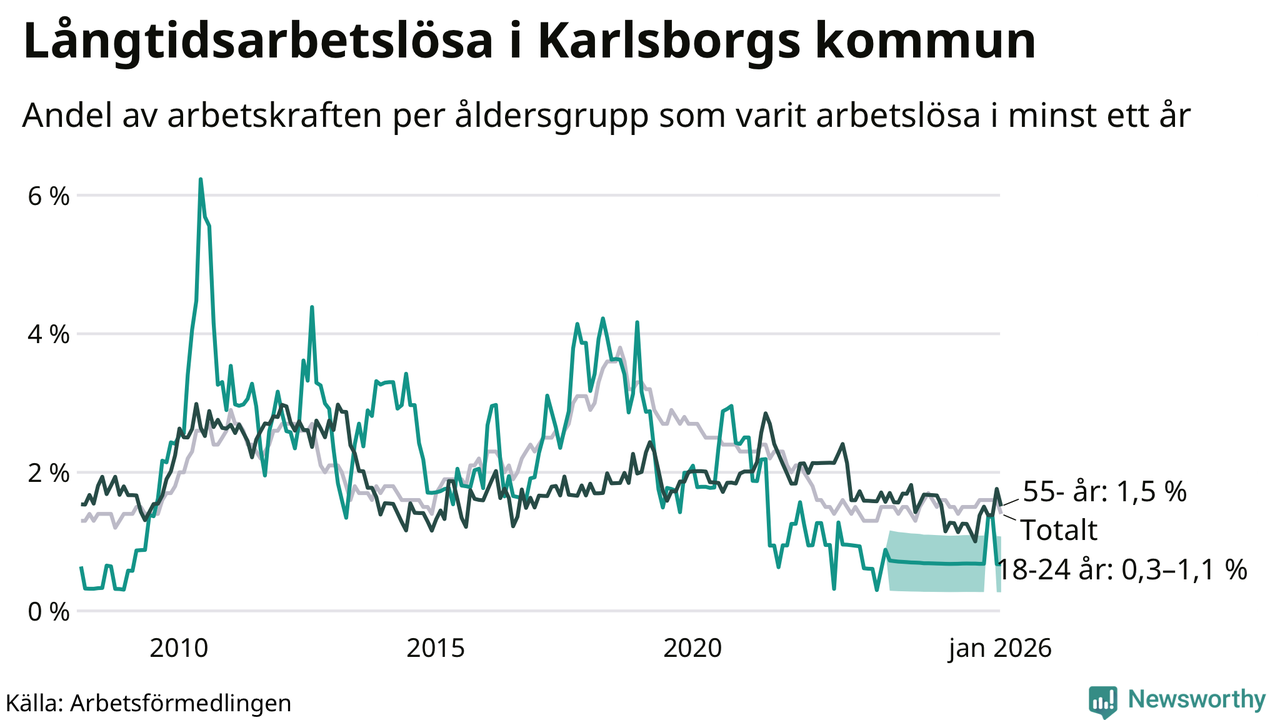 Av de 43 personerna som varit arbetslösa i mer än ett år i Karlsborgs kommun är tolv personer mellan 55 och 661 år och mellan en och fyra är mellan 18 och 24 år. För den äldre gruppen är andelen arbetslösa 1,5 procent medan den i den yngre gruppen är mellan 0,3 och 1,1 procent. Även i riket som helhet är långtidsarbetslösheten högre i gruppen äldre.