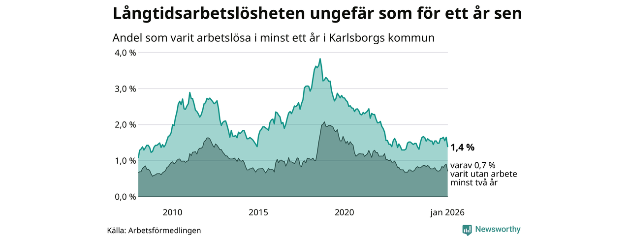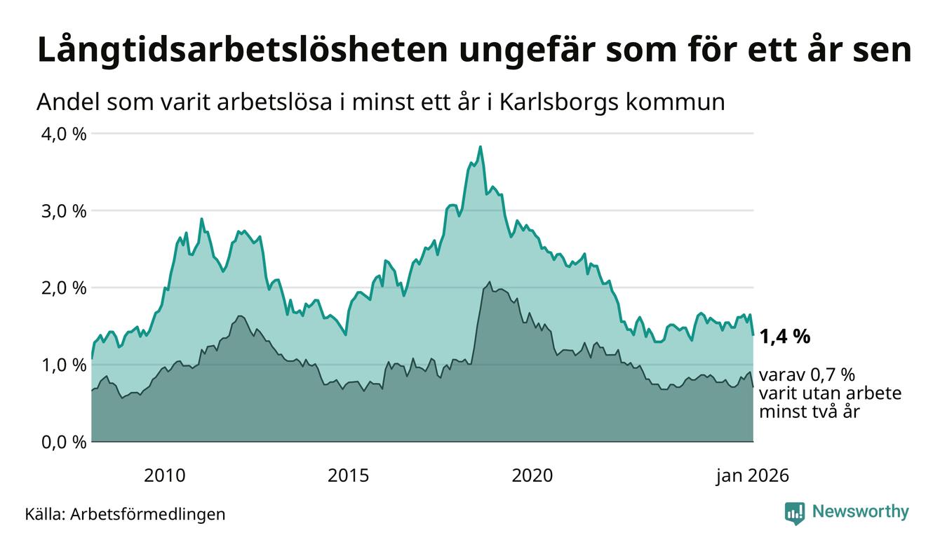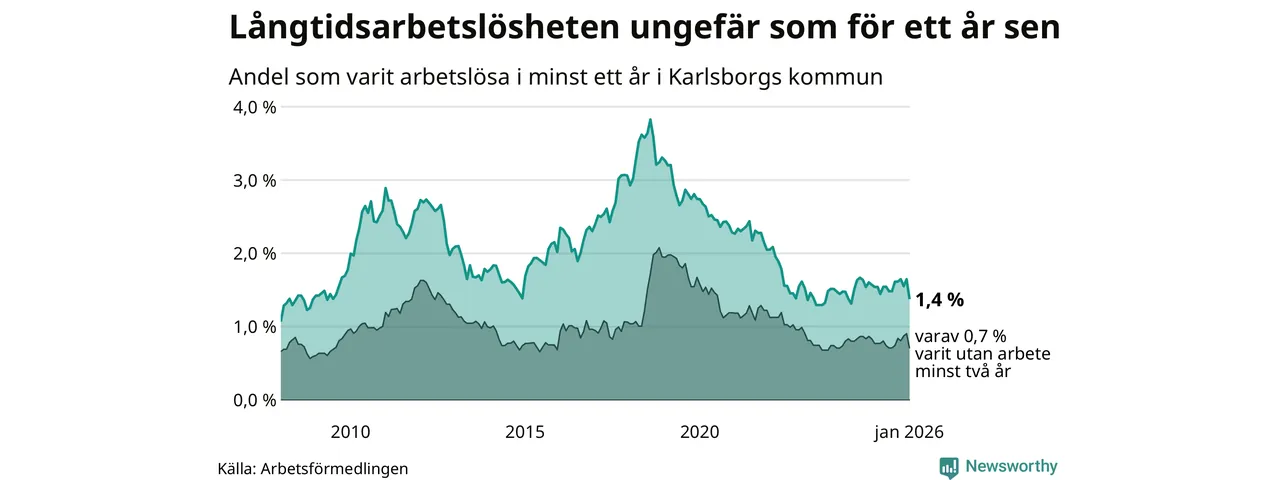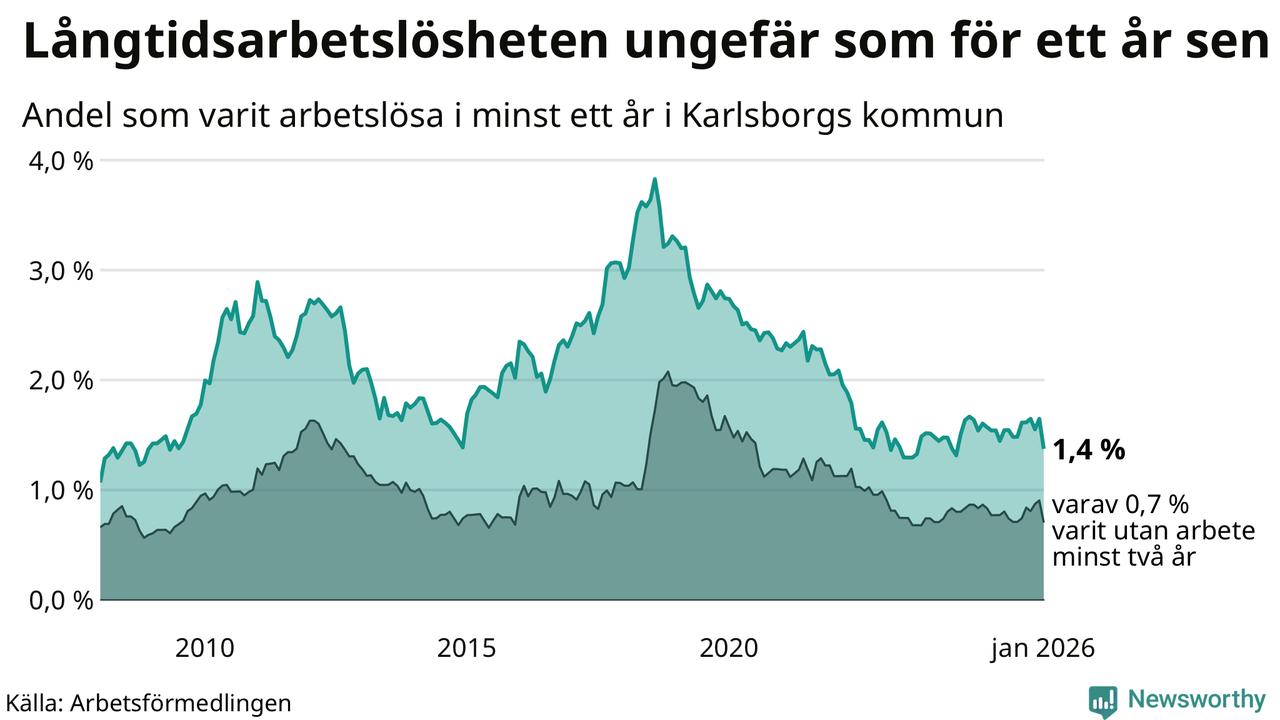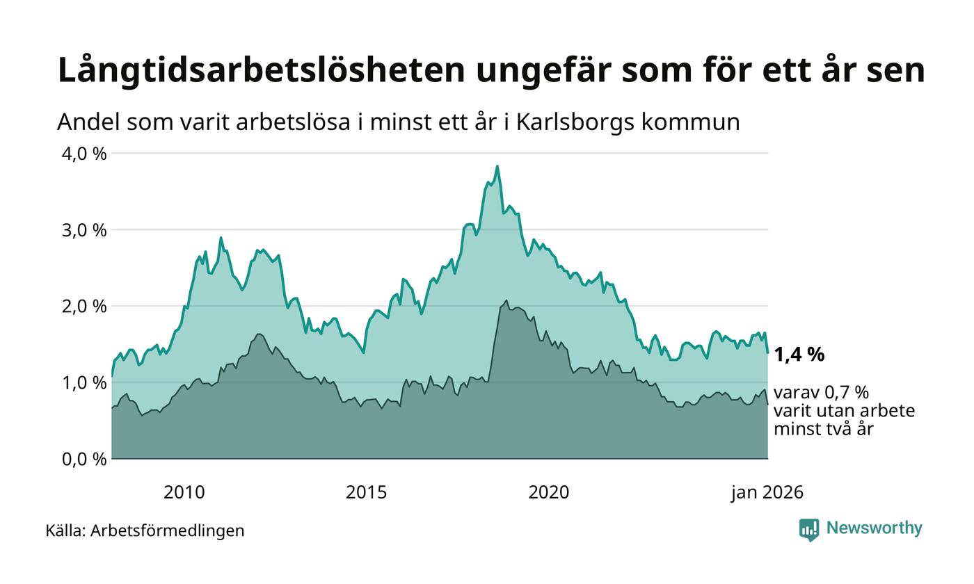 I januari hade 43 Karlsborgsbor varit arbetslösa i minst ett år, vilket är åtta färre än månaden innan. 43 personer motsvarar 1,4 procent av arbetskraften i kommunen – andelen långtidsarbetslösa är ungefär på samma nivå som för ett år sedan.