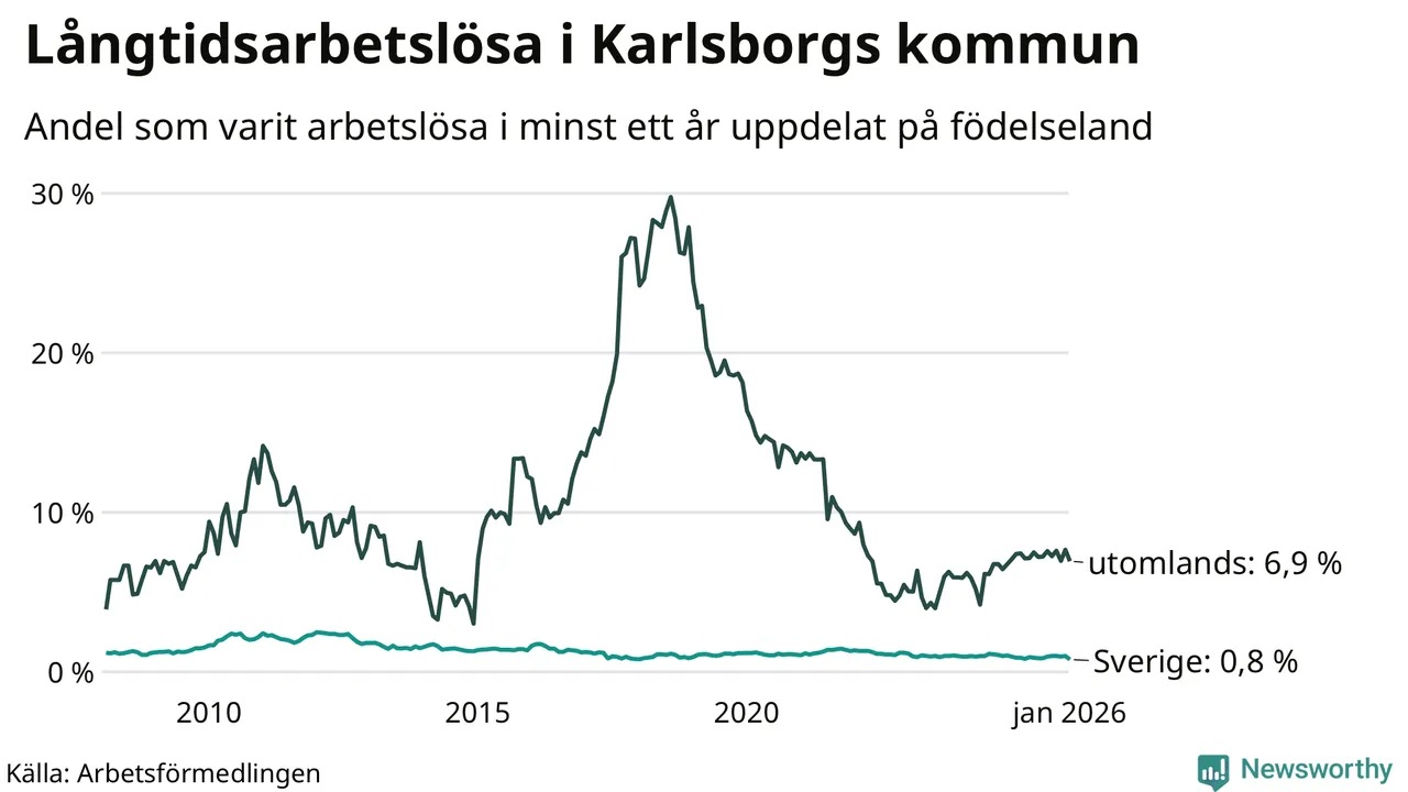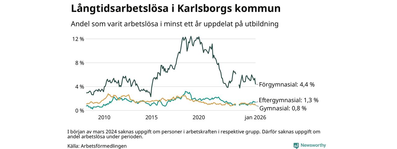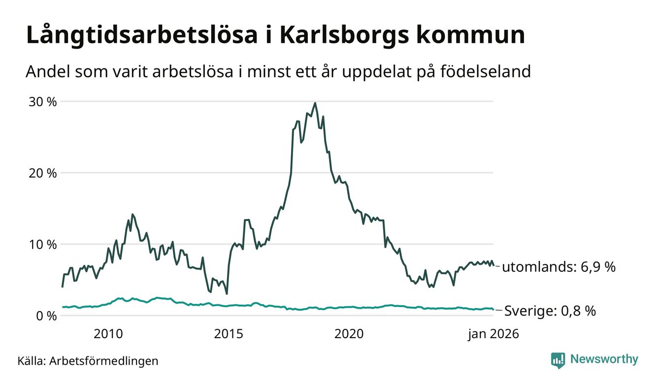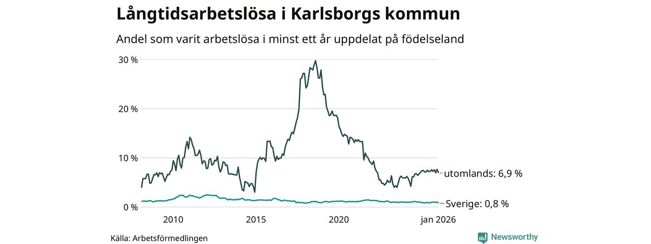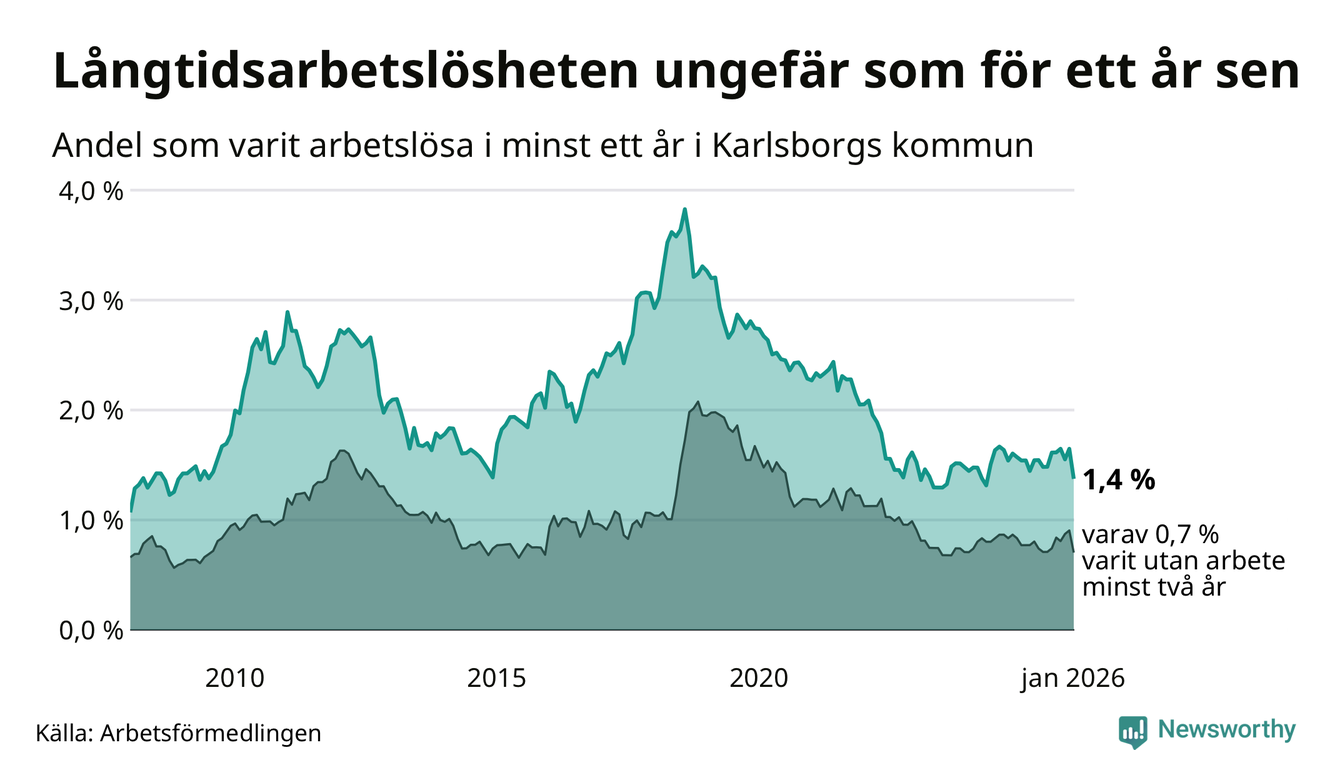 I januari hade 43 Karlsborgsbor varit arbetslösa i minst ett år, vilket är åtta färre än månaden innan. 43 personer motsvarar 1,4 procent av arbetskraften i kommunen – andelen långtidsarbetslösa är ungefär på samma nivå som för ett år sedan.