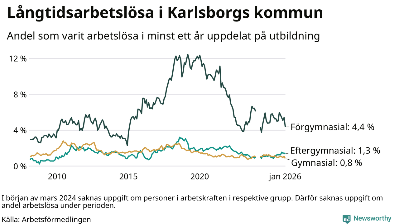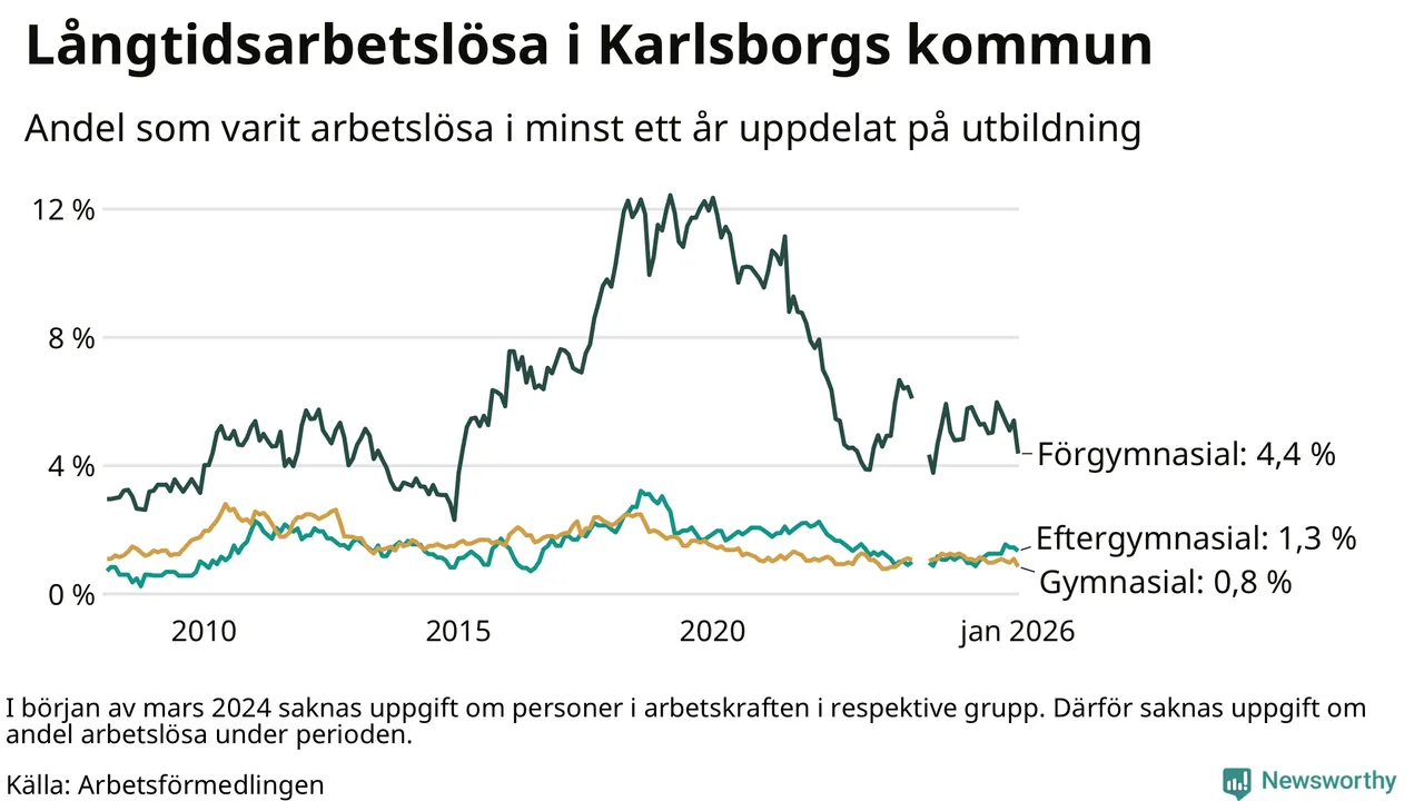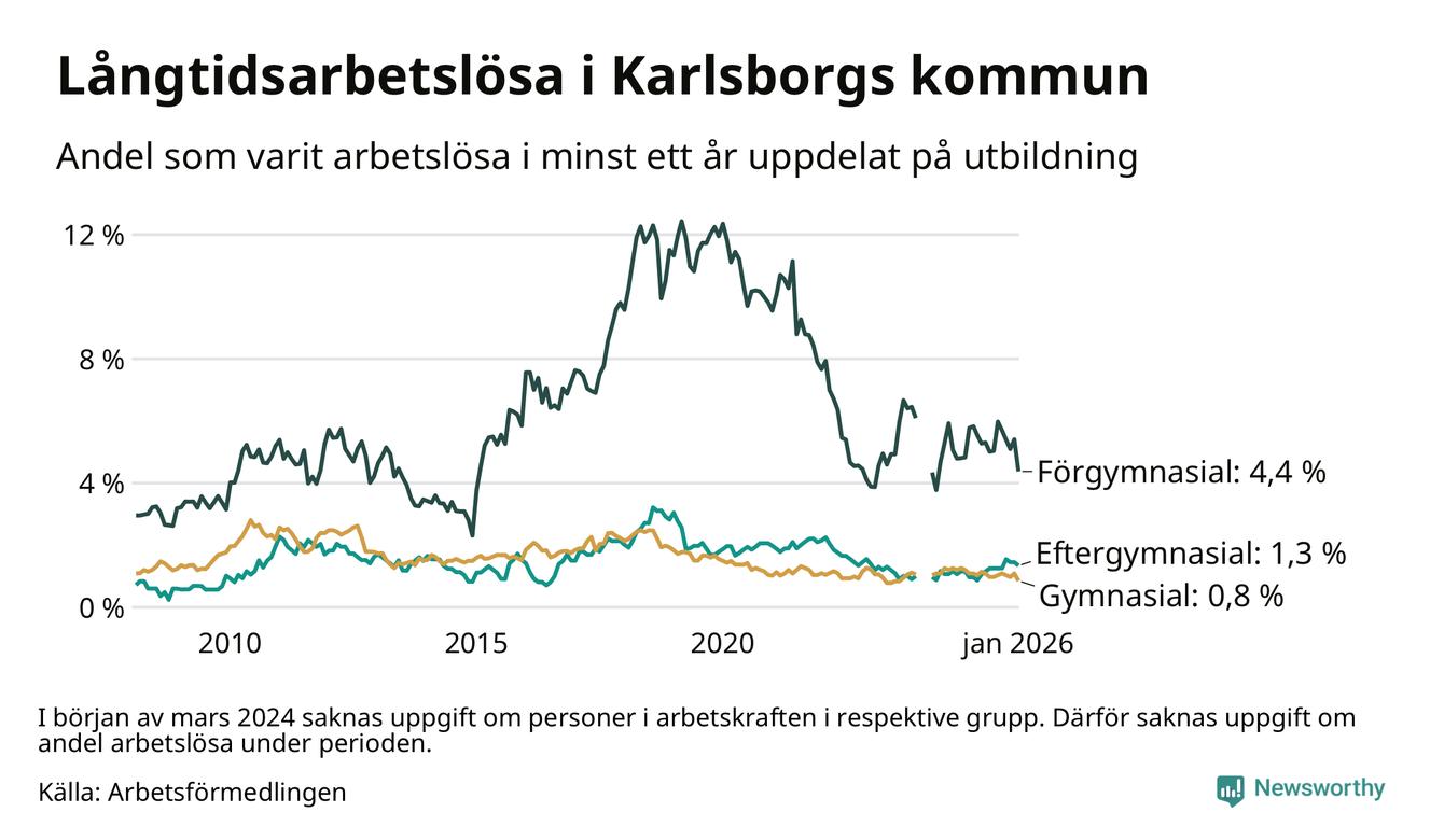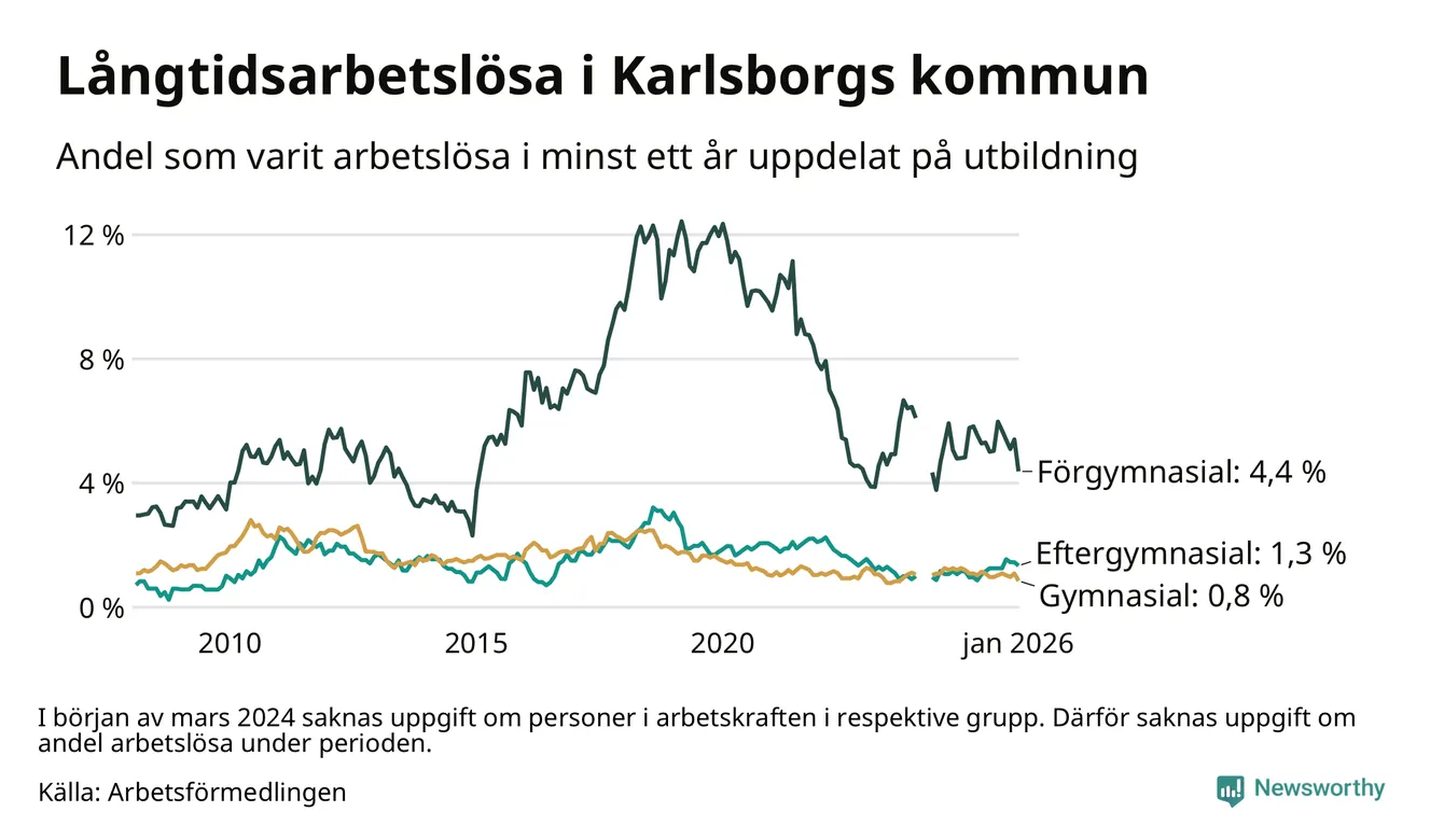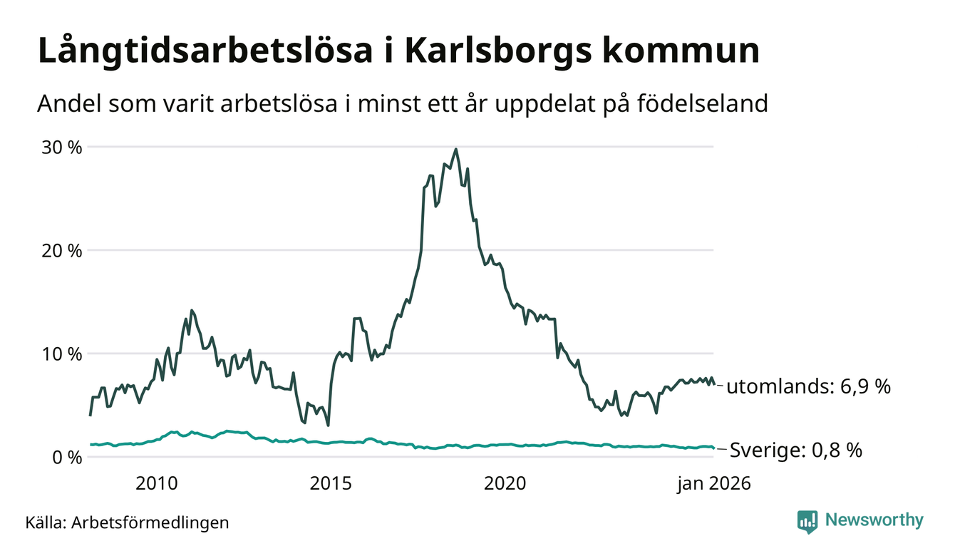 I januari hade 43 Karlsborgsbor varit arbetslösa i minst ett år, vilket är åtta färre än månaden innan. 43 personer motsvarar 1,4 procent av arbetskraften i kommunen – andelen långtidsarbetslösa är ungefär på samma nivå som för ett år sedan.
