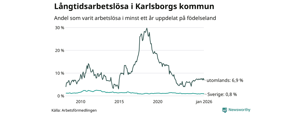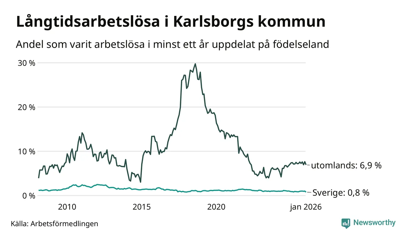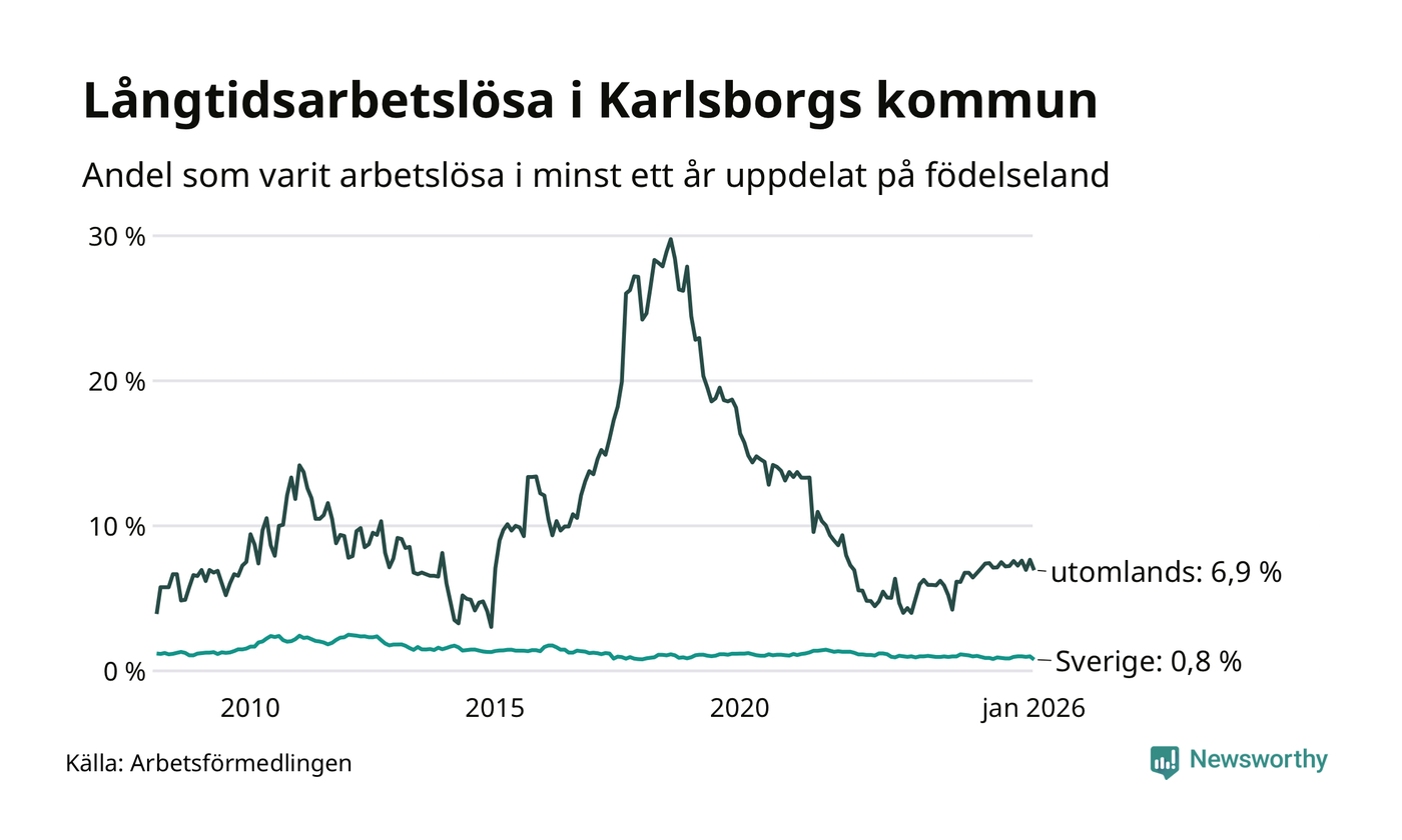 22 av de långtidsarbetslösa i Karlsborg är födda i Sverige, medan 21 är födda utomlands. Det innebär att långtidsarbetslösheten bland Sverigefödda är 0,8 procent, medan den är nio gånger så hög – 6,9 procent – bland födda utomlands. Även i riket som helhet är arbetslösheten högre bland utrikesfödda.