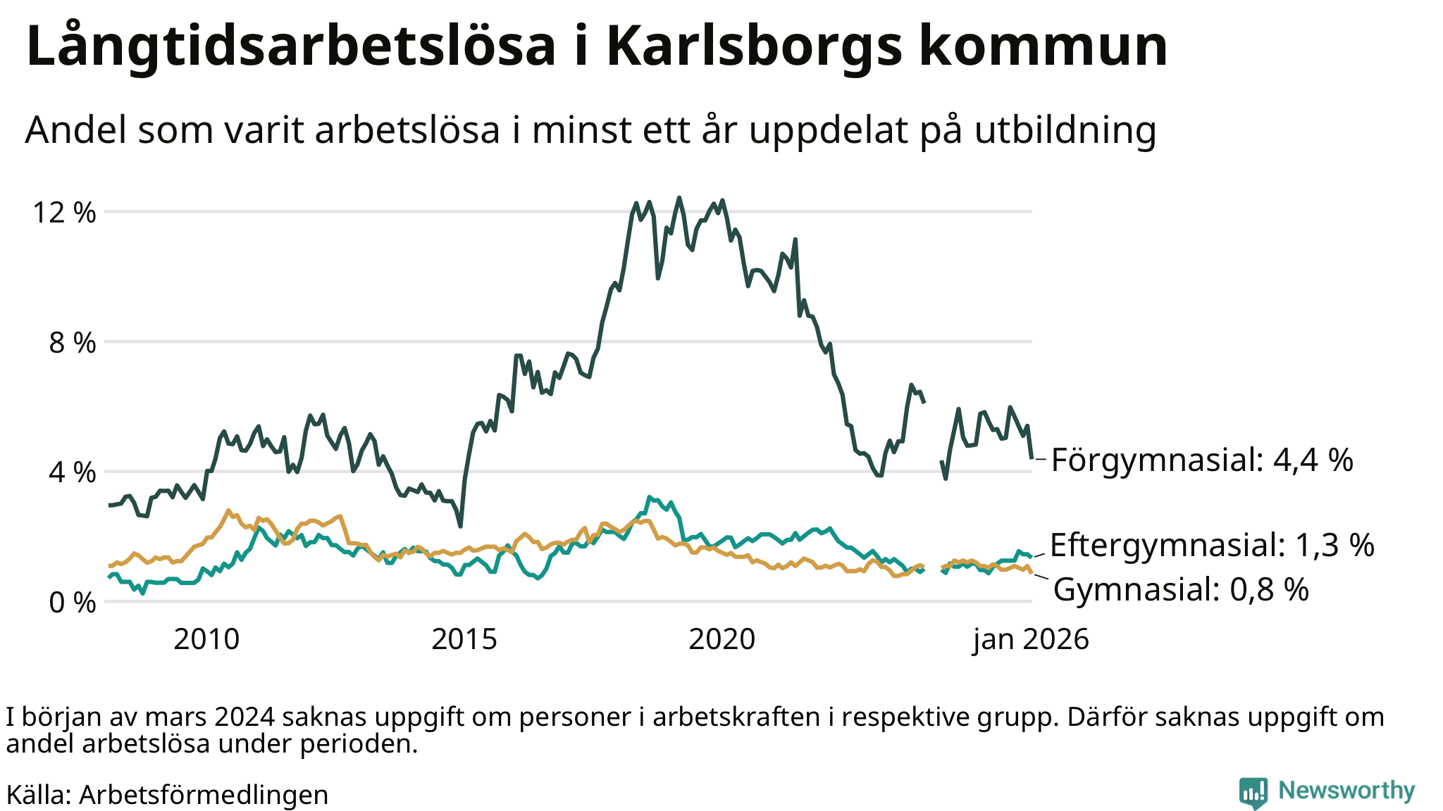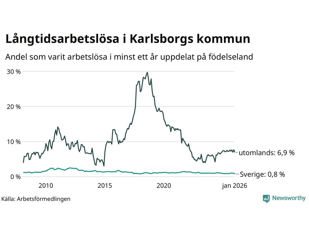 | Andel arbetslösa i minst två år | 0,7 % | 1,3 % | 1,6 % |