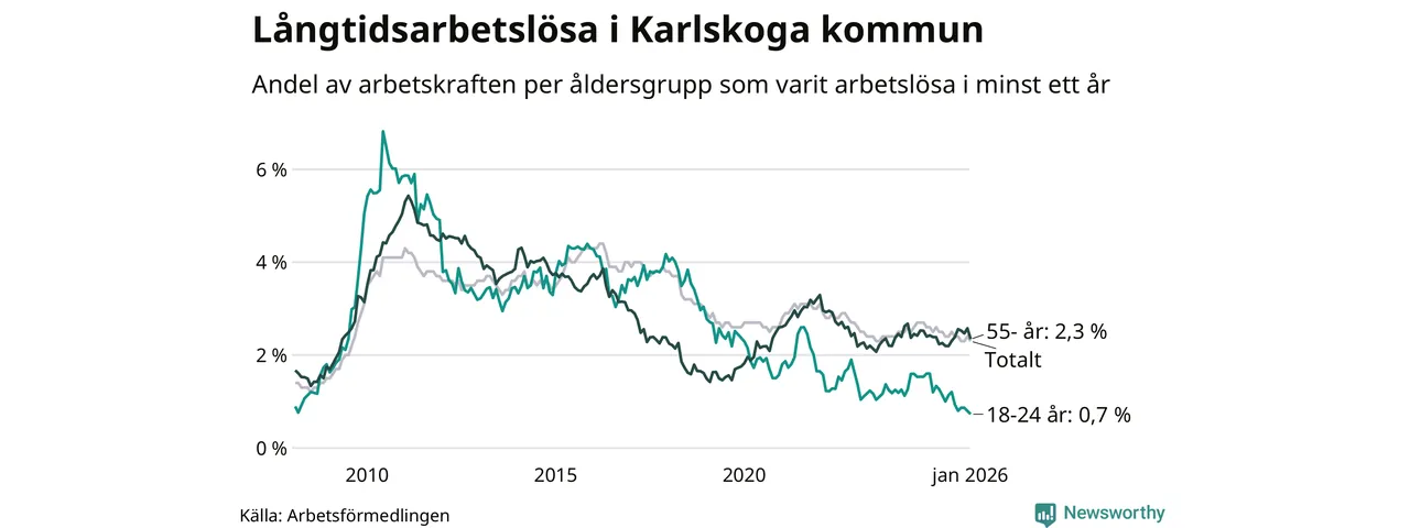 Av de 342 personerna som varit arbetslösa i mer än ett år i Karlskoga kommun är 82 personer mellan 55 och 661 år och elva är mellan 18 och 24 år. För den äldre gruppen är andelen arbetslösa 2,3 procent medan den i den yngre gruppen är 0,7 procent. Även i riket som helhet är långtidsarbetslösheten högre i gruppen äldre.