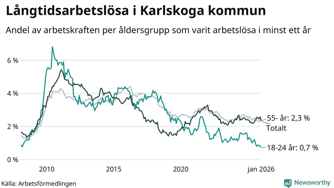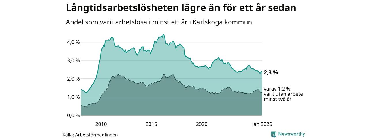 I januari hade 342 Karlskogabor varit arbetslösa i minst ett år, vilket är sju färre än månaden innan. 342 personer motsvarar 2,3 procent av arbetskraften i kommunen – andelen långtidsarbetslösa är 0,2 procentenheter lägre än samma månad för ett år sedan.