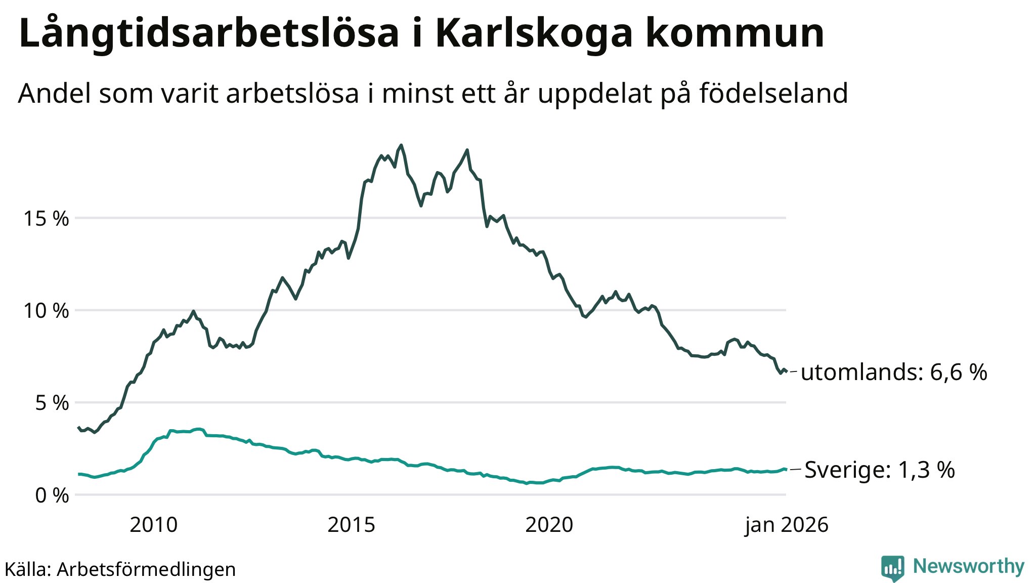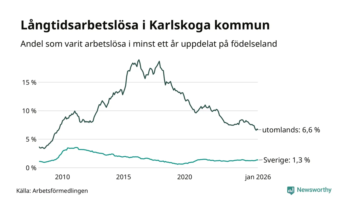 160 av de långtidsarbetslösa i Karlskoga är födda i Sverige, medan 182 är födda utomlands. Det innebär att långtidsarbetslösheten bland Sverigefödda är 1,3 procent, medan den är fem gånger så hög – 6,6 procent – bland födda utomlands. Även i riket som helhet är arbetslösheten högre bland utrikesfödda.