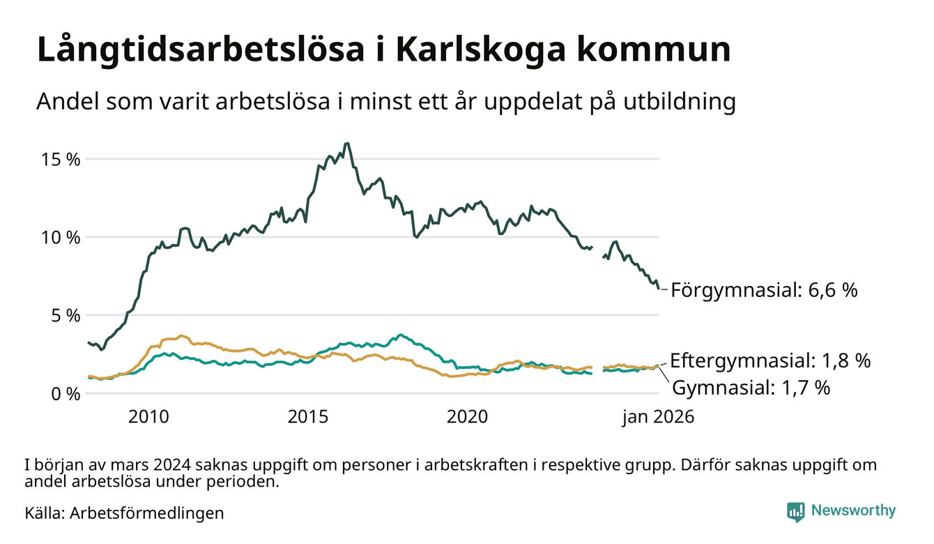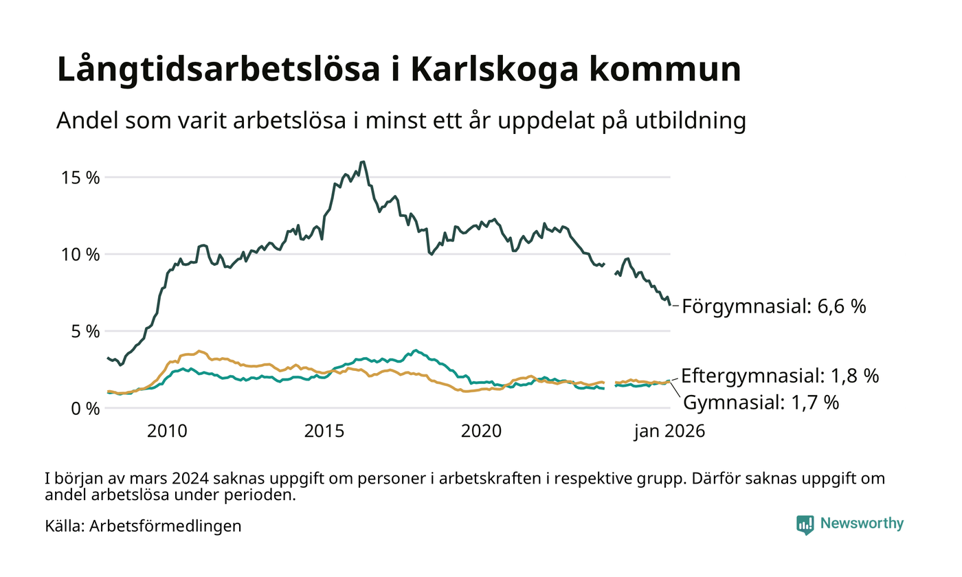 Andelen som varit utan arbete i minst ett år i Karlskoga var lägre i januari jämfört med samma månad för ett år sedan. Det visar Arbetsfömedlingens senaste månadsstatistik.