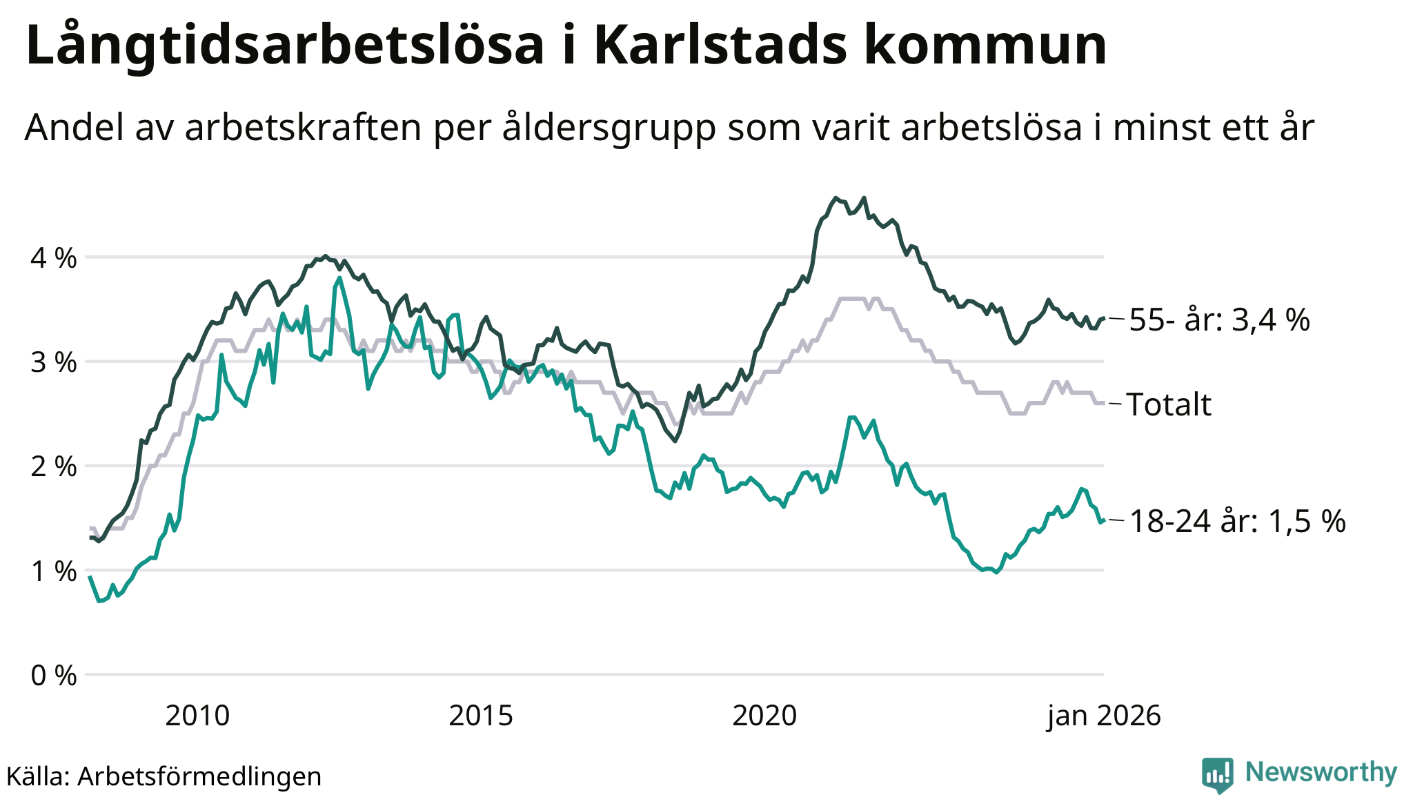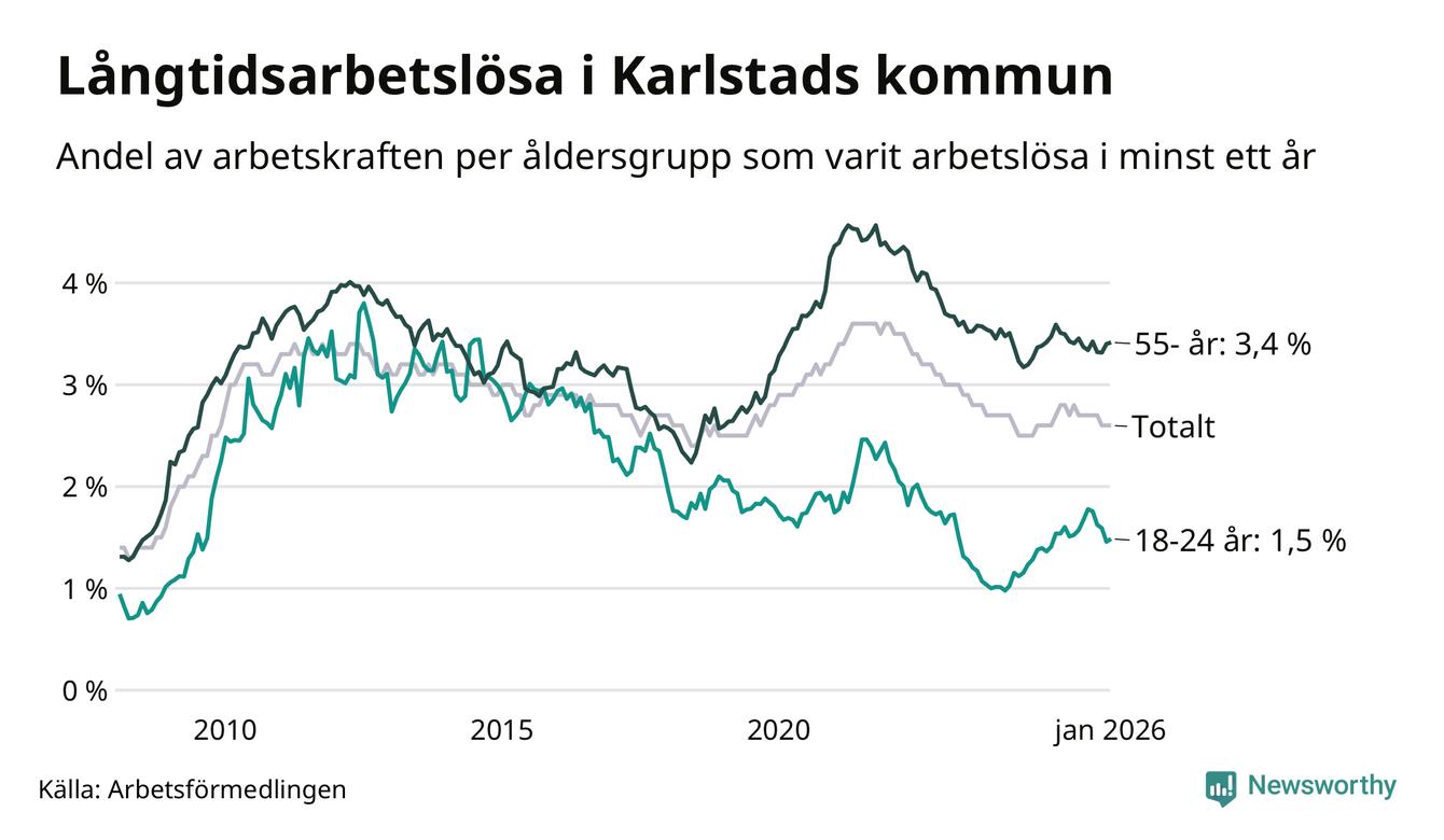 Av de 1 330 personerna som varit arbetslösa i mer än ett år i Karlstads kommun är 349 personer mellan 55 och 661 år och 94 är mellan 18 och 24 år. För den äldre gruppen är andelen arbetslösa 3,4 procent medan den i den yngre gruppen är 1,5 procent. Även i riket som helhet är långtidsarbetslösheten högre i gruppen äldre.