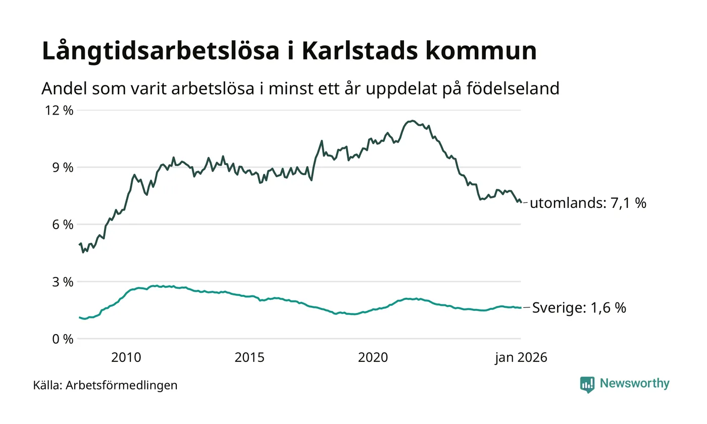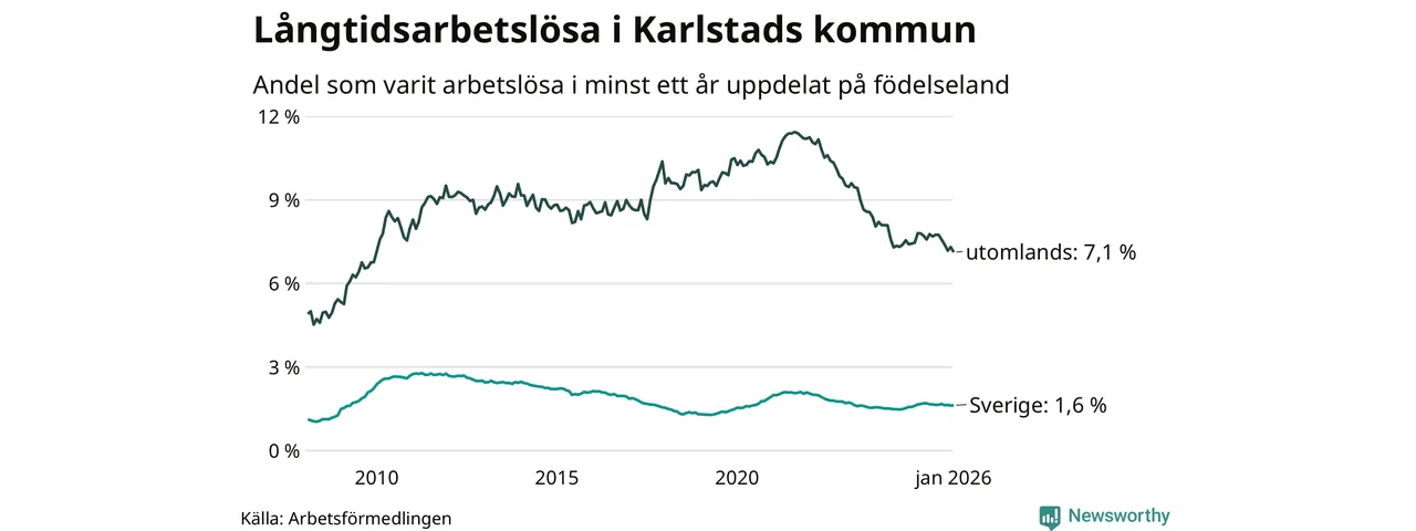 679 av de långtidsarbetslösa i Karlstad är födda i Sverige, medan 651 är födda utomlands. Det innebär att långtidsarbetslösheten bland Sverigefödda är 1,6 procent, medan den är fyra gånger så hög – 7,1 procent – bland födda utomlands. Även i riket som helhet är arbetslösheten högre bland utrikesfödda.