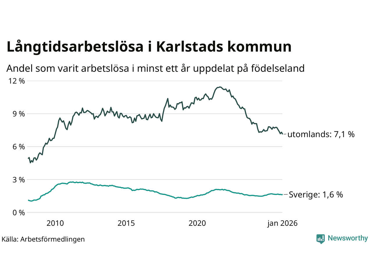 Graf: Andel arbetslösa uppdelat på födelseland i Karlstad