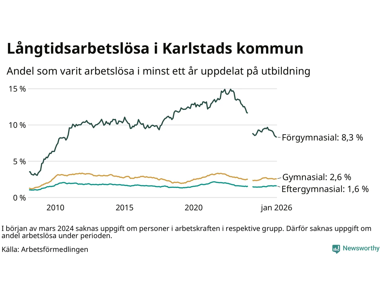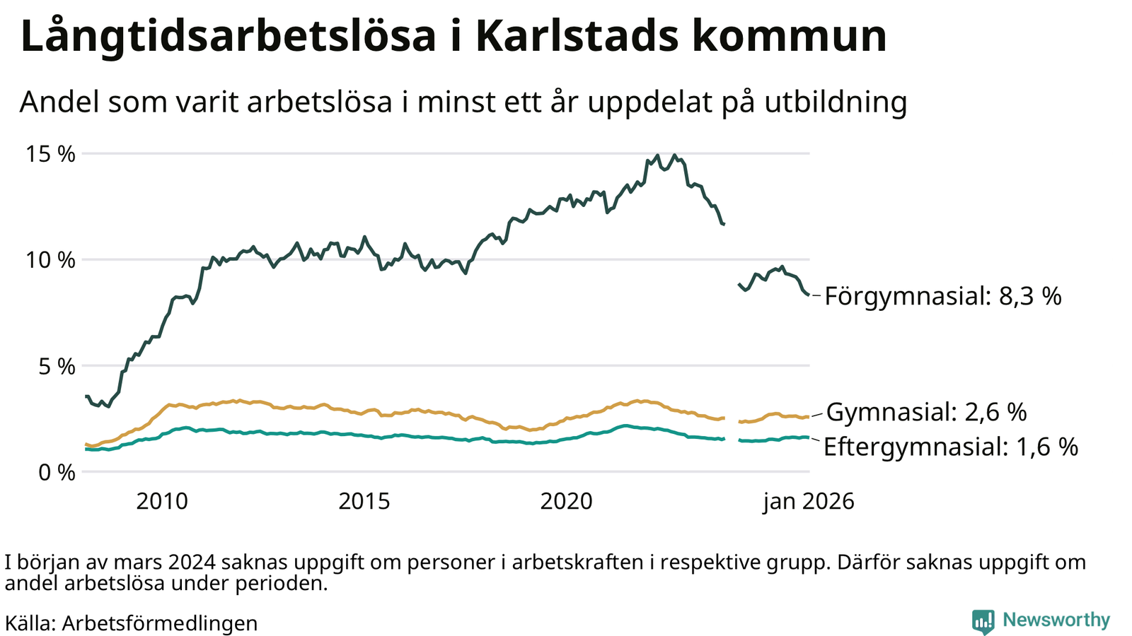 Graf: Andel arbetslösa i Karlstad som varit utan arbete i minst 12 månader