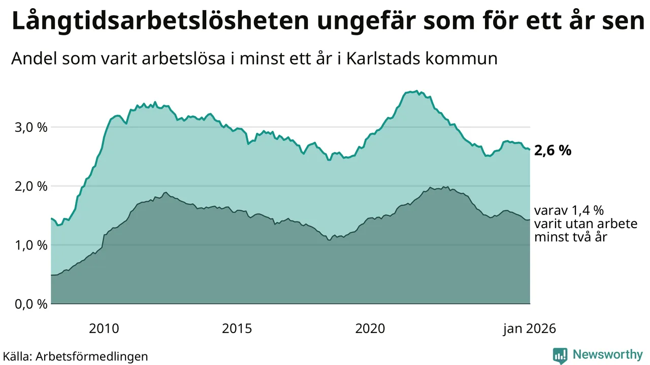 I januari hade 1 330 Karlstadsbor varit arbetslösa i minst ett år, vilket är två färre än månaden innan. 1 330 personer motsvarar 2,6 procent av arbetskraften i kommunen – andelen långtidsarbetslösa är ungefär på samma nivå som för ett år sedan.