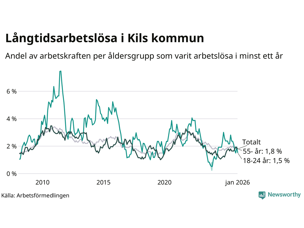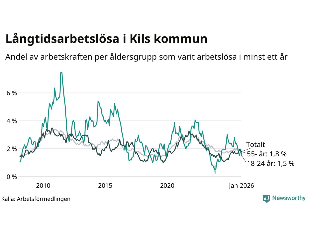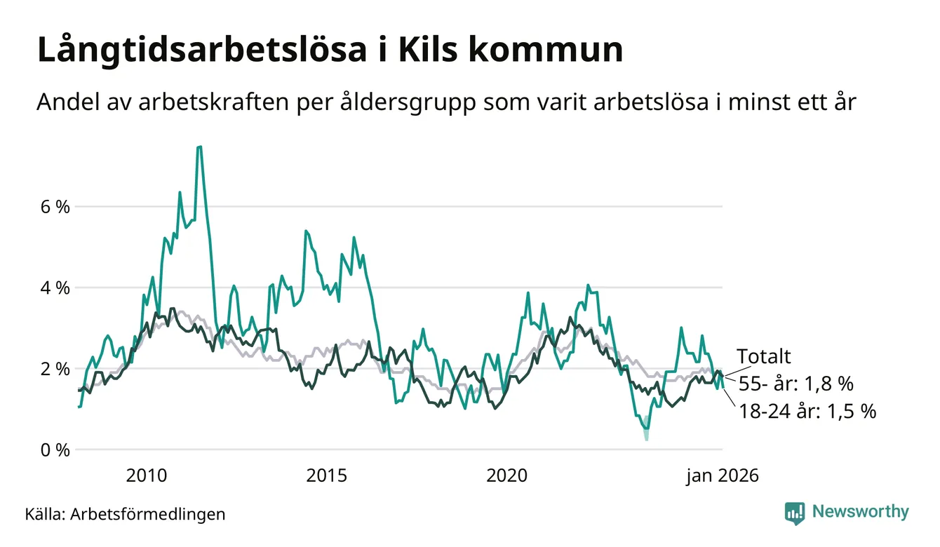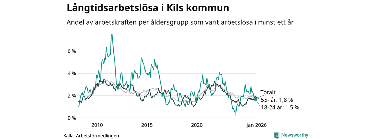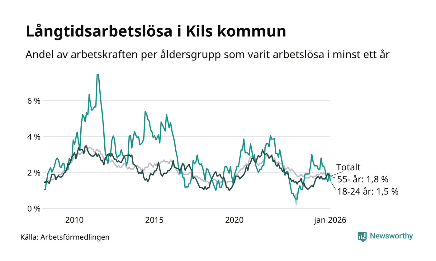 Av de 104 personerna som varit arbetslösa i mer än ett år i Kils kommun är 24 personer mellan 55 och 661 år och sju är mellan 18 och 24 år. För den äldre gruppen är andelen arbetslösa 1,8 procent medan den i den yngre gruppen är 1,5 procent. Även i riket som helhet är långtidsarbetslösheten högre i gruppen äldre.