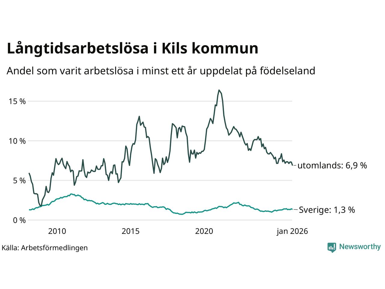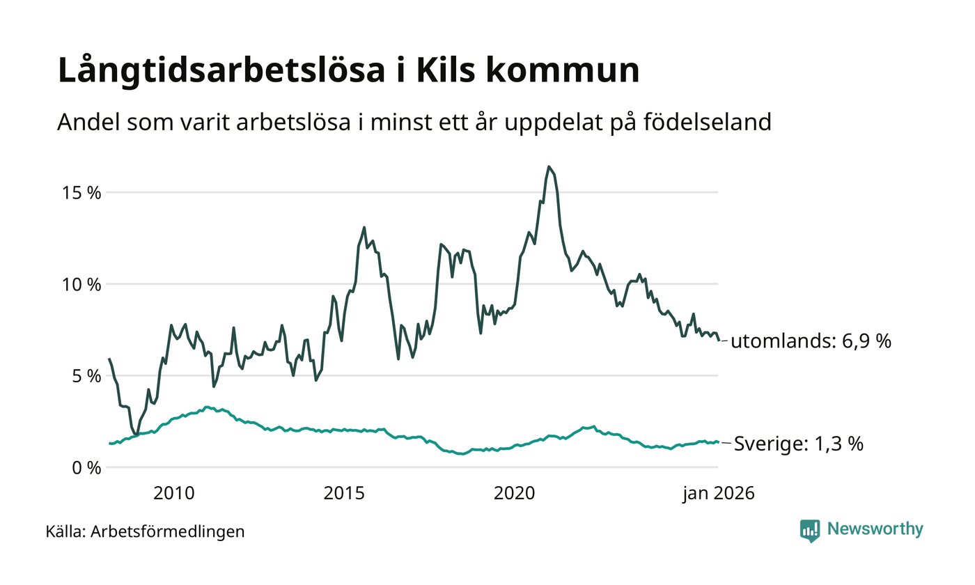 69 av de långtidsarbetslösa i Kil är födda i Sverige, medan 35 är födda utomlands. Det innebär att långtidsarbetslösheten bland Sverigefödda är 1,3 procent, medan den är fem gånger så hög – 6,9 procent – bland födda utomlands. Även i riket som helhet är arbetslösheten högre bland utrikesfödda.