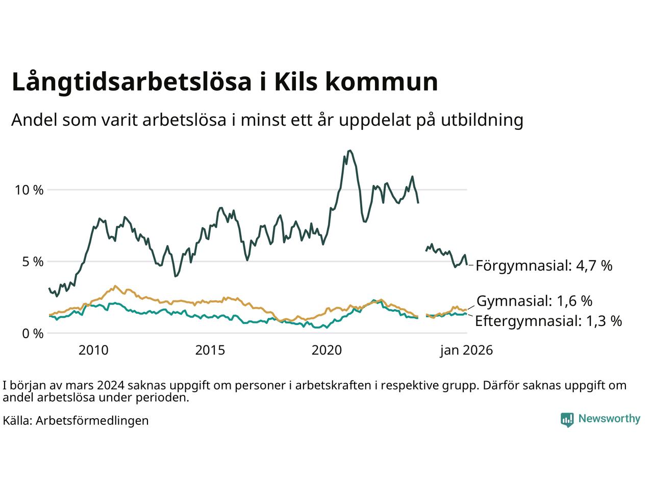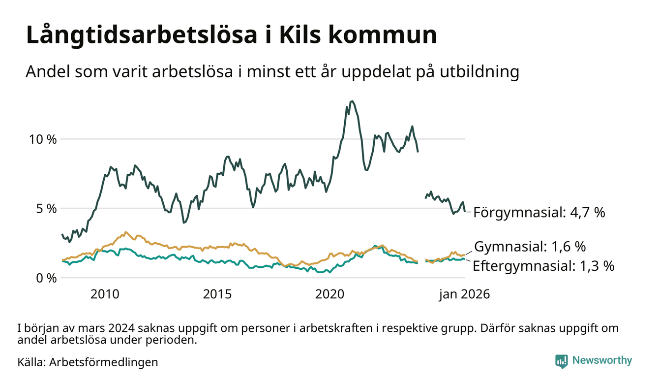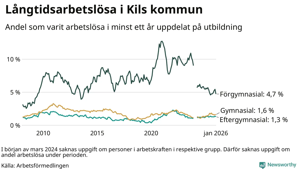 Andelen som varit utan arbete i minst ett år i Kil var ungefär lika stor i januari jämfört med samma månad för ett år sedan. Det visar Arbetsfömedlingens senaste månadsstatistik.