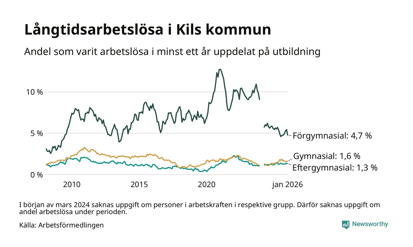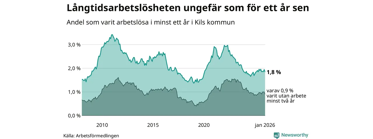 I januari hade 104 Kilsbor varit arbetslösa i minst ett år, vilket är fem färre än månaden innan. 104 personer motsvarar 1,8 procent av arbetskraften i kommunen – andelen långtidsarbetslösa är ungefär på samma nivå som för ett år sedan.