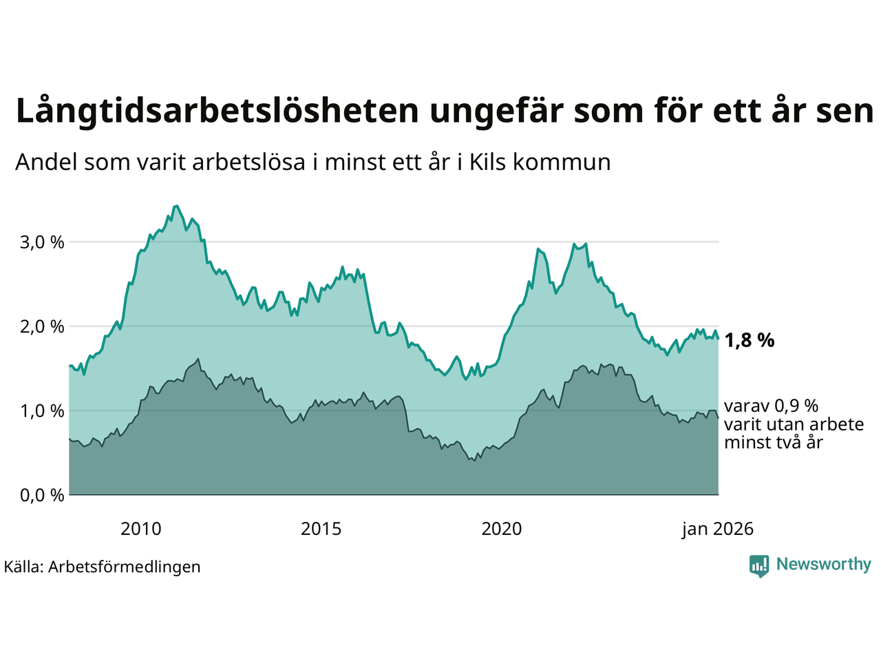 | Andel arbetslösa i minst två år | 0,9 % | 1,3 % | 1,6 % |