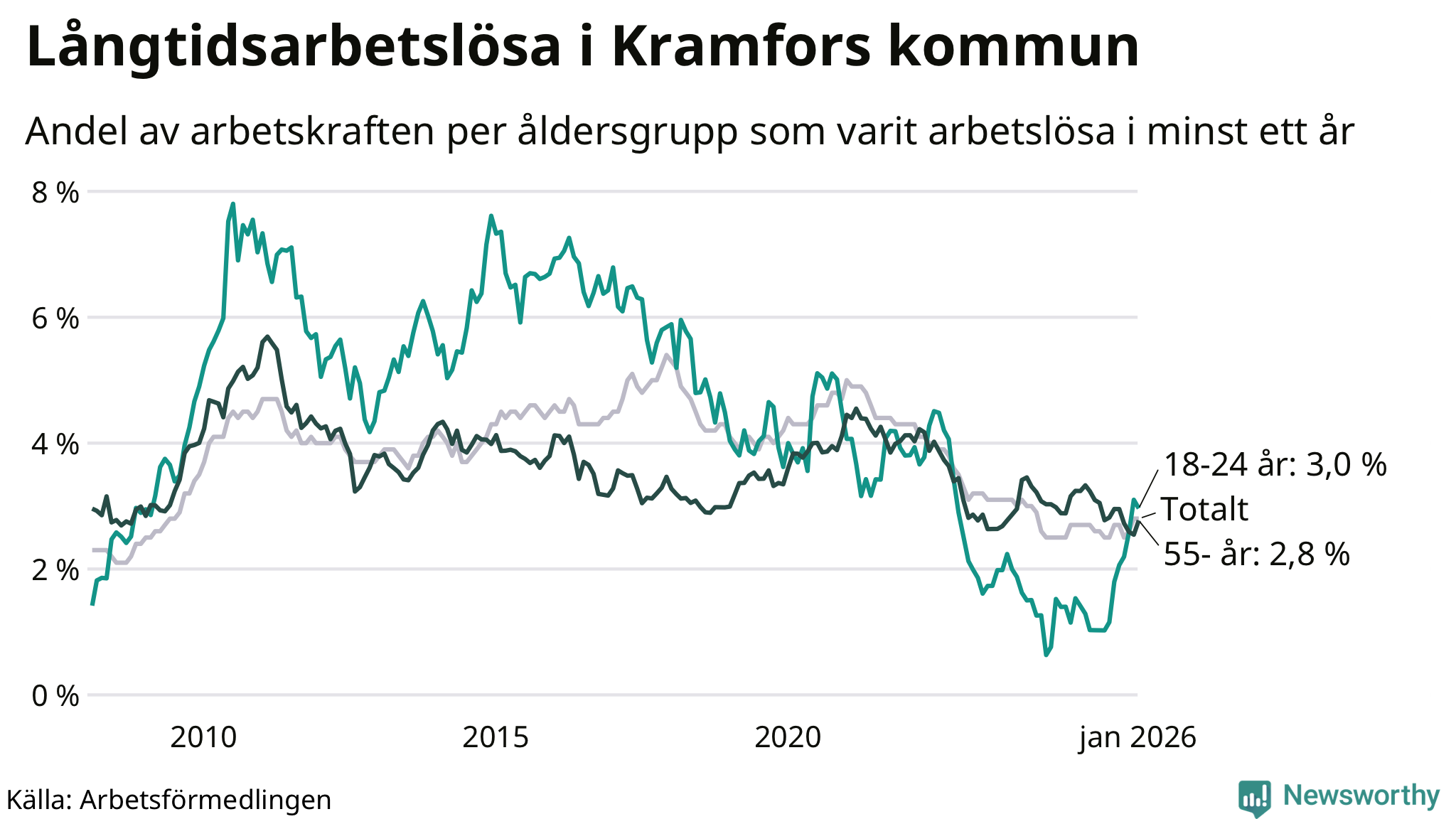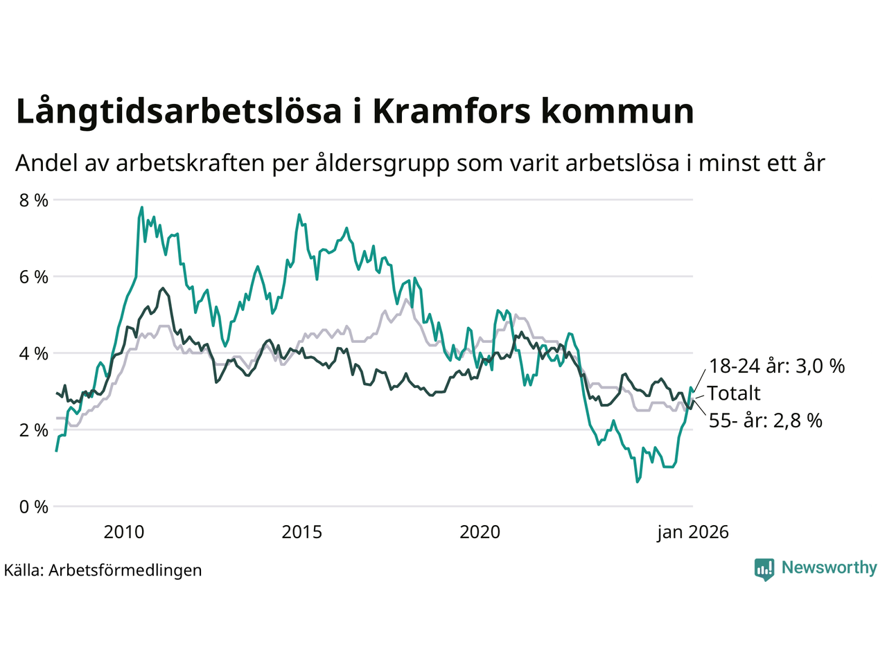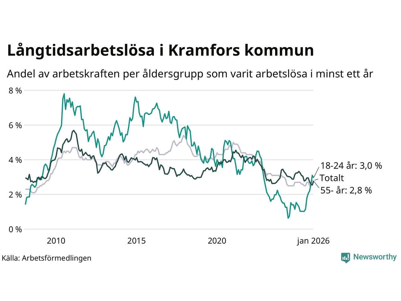 | Andel arbetslösa i minst ett år | 2,8 % | 2,5 % | 2,9 % |