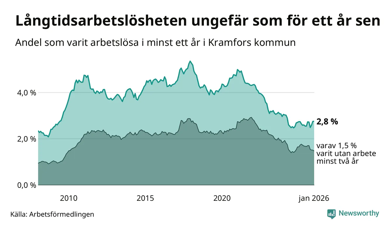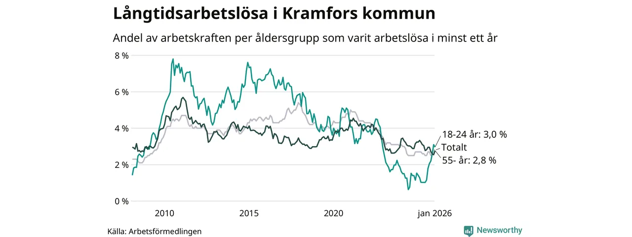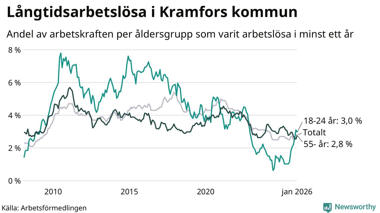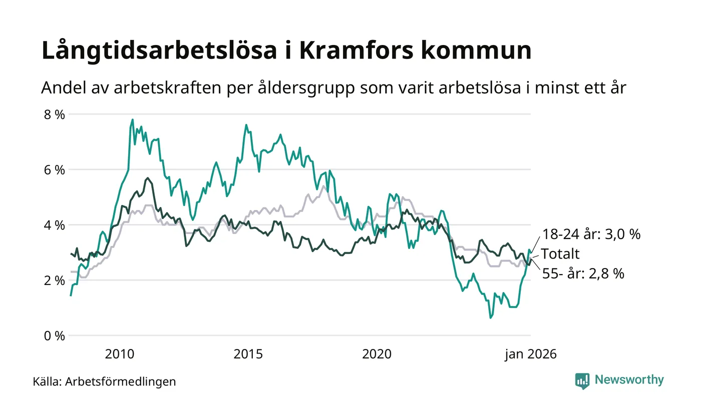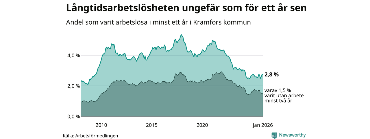 I januari hade 214 Kramforsbor varit arbetslösa i minst ett år, vilket är tre fler än månaden innan. 214 personer motsvarar 2,8 procent av arbetskraften i kommunen – andelen långtidsarbetslösa är ungefär på samma nivå som för ett år sedan.
