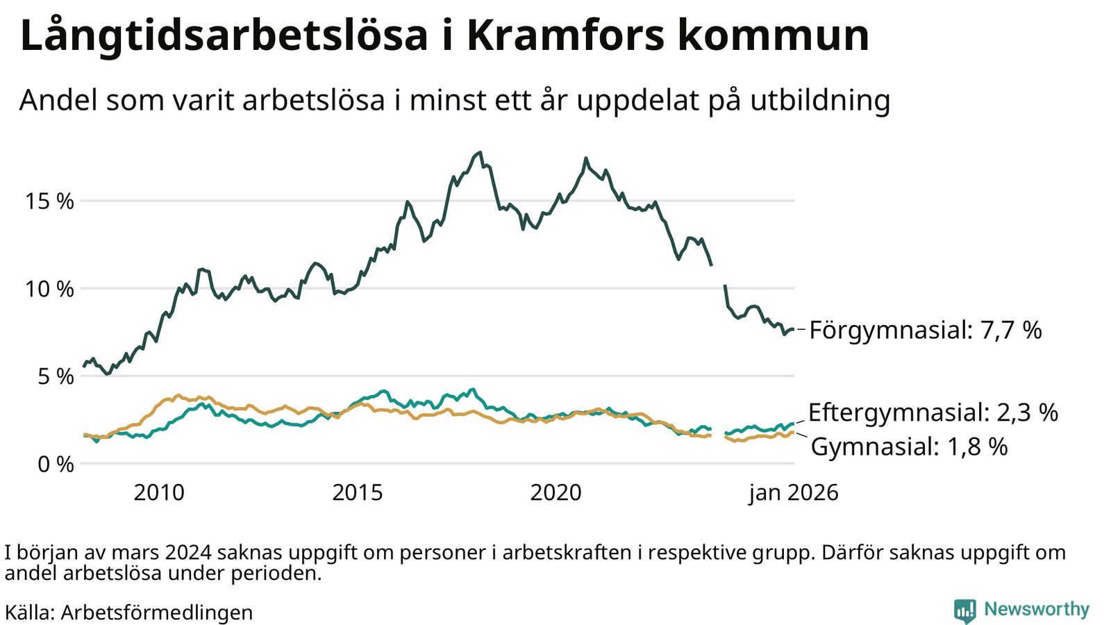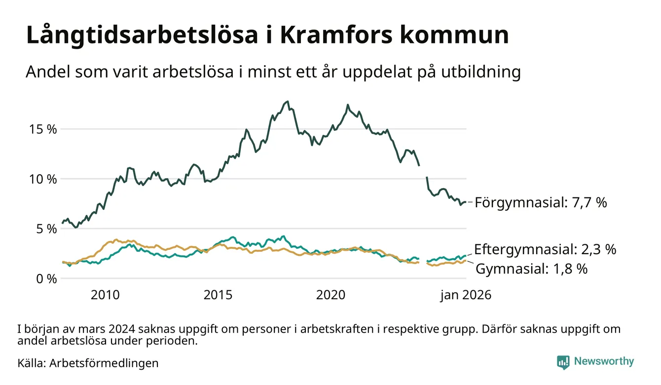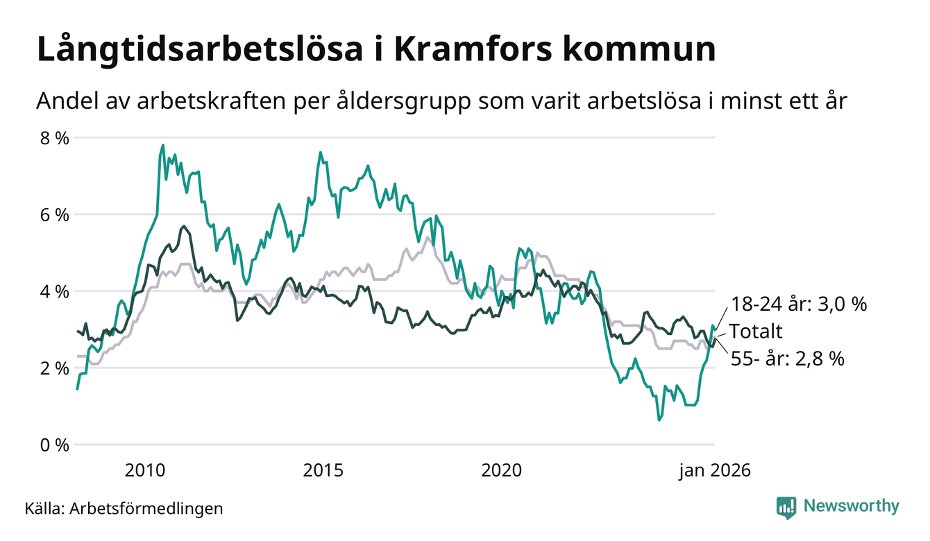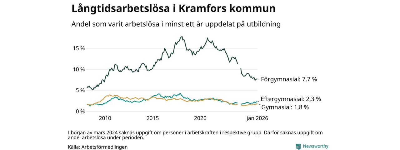 I januari hade 214 Kramforsbor varit arbetslösa i minst ett år, vilket är tre fler än månaden innan. 214 personer motsvarar 2,8 procent av arbetskraften i kommunen – andelen långtidsarbetslösa är ungefär på samma nivå som för ett år sedan.
